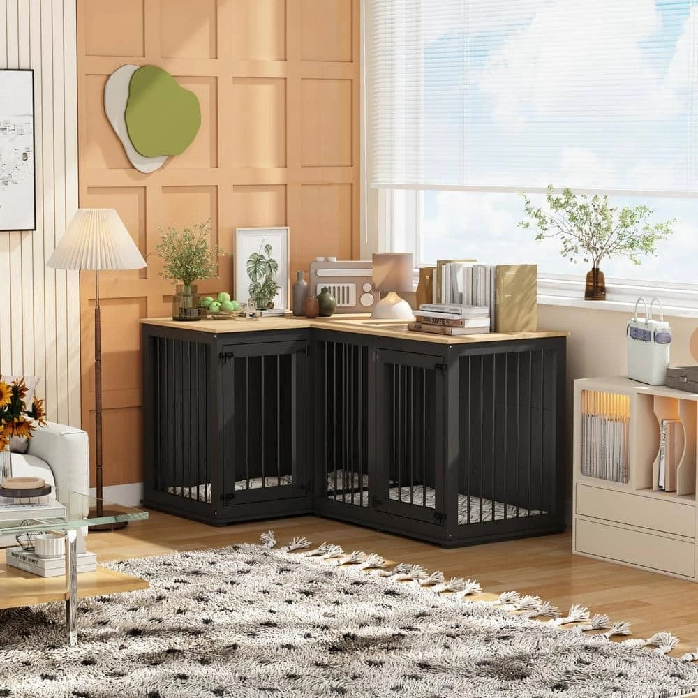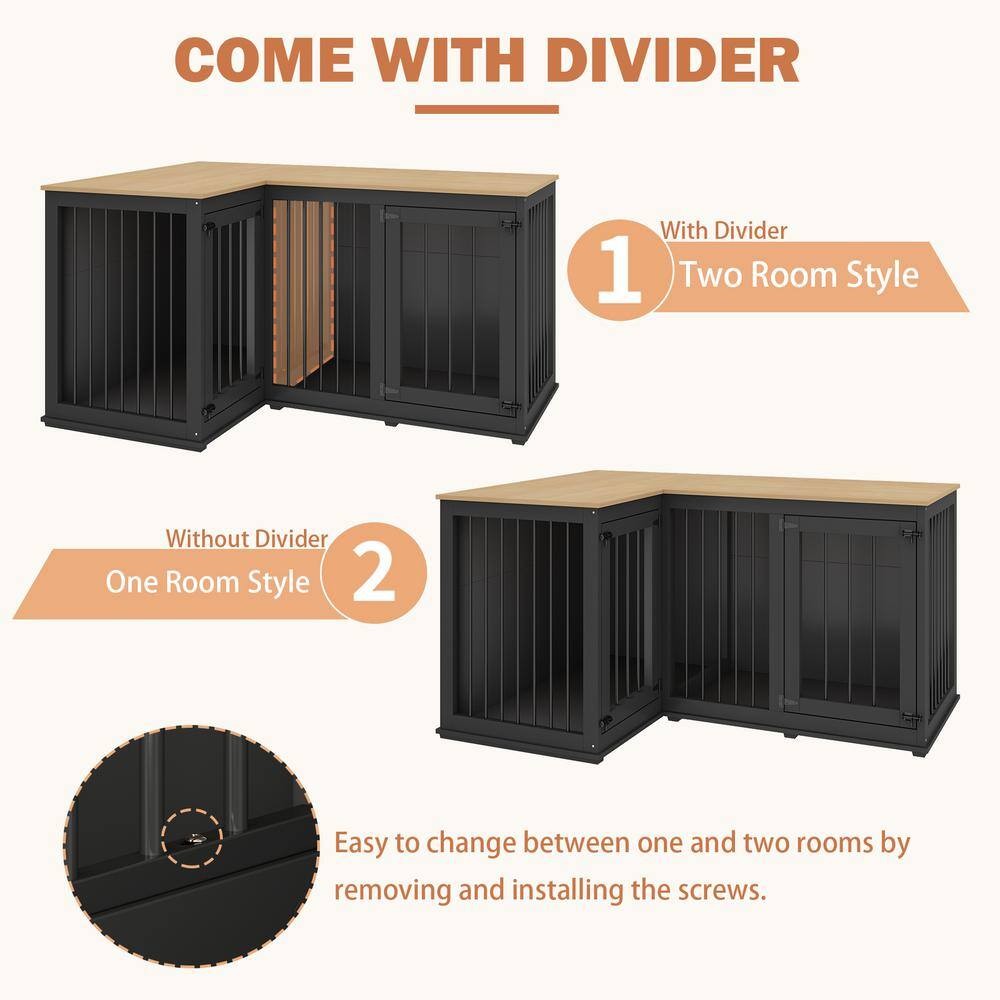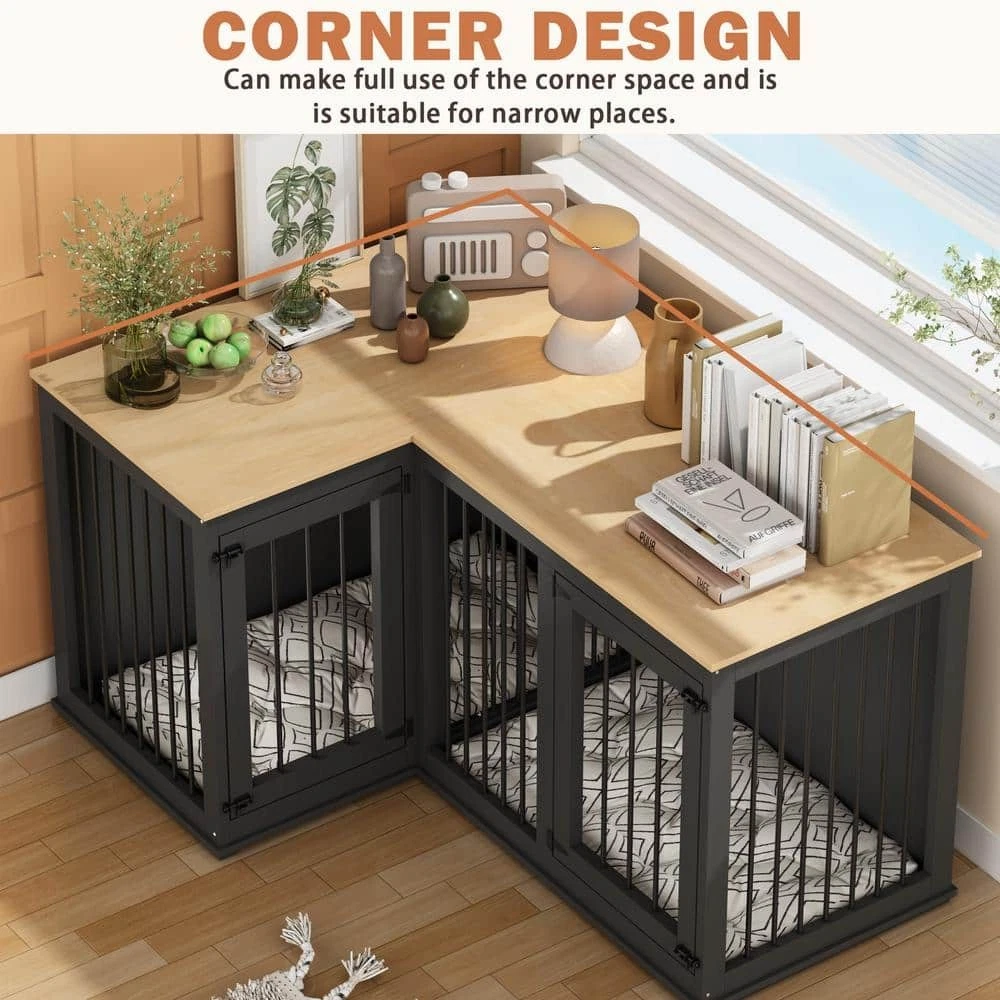 Large Wooden Double Dog Crate Furniture Corner Kennel Bed for 2 Dogs