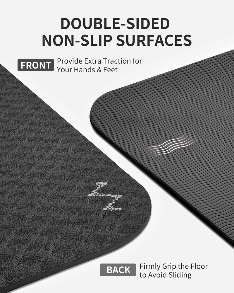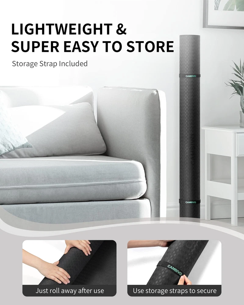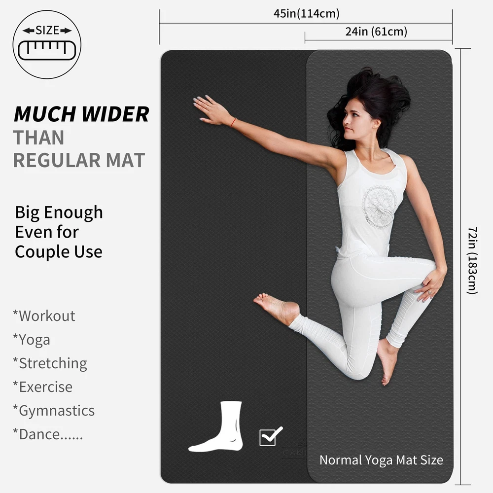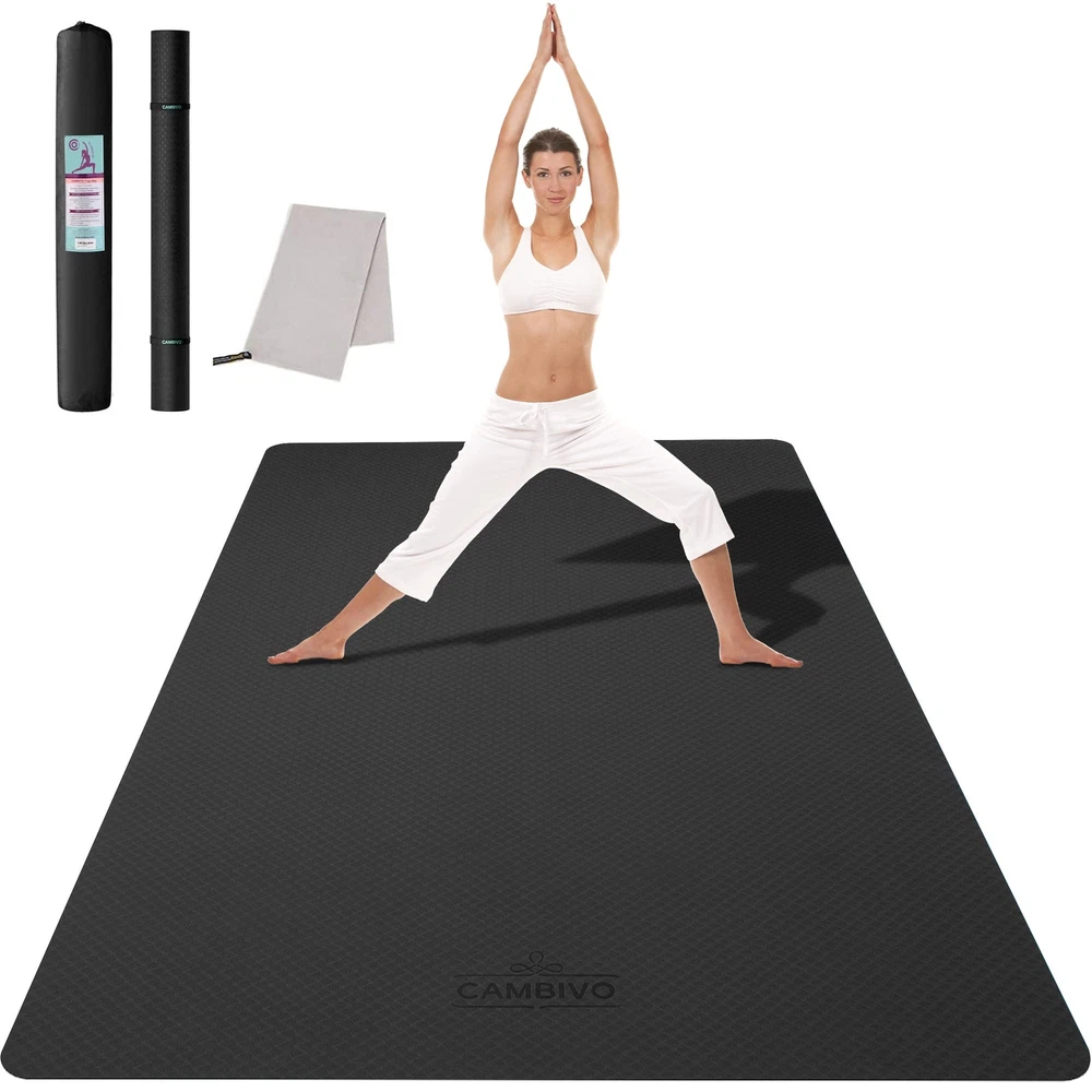 Durable Large Yoga Mat For a Better Yoga WorkoutCAMBIVO TPE yoga mat is mainly composed of Thermoplastic elastomers and other material foamed under high temperature which makes it closed-cell structure featuring and easy to clean. Soft & Thick with superior cushioning to protect your joints, while providing firm, stable support for standing postures. Its good elasticity, durability, and lightweight making it suitable for travel and household use WHY CHOOSE YOGA MAT? Soft & Thick with Superior Cushioning to Protect Your Joints High elasticity and resilience Super Lightweight & Easy to Carry contains no latex, rubber Thickness: 6mm Dimensions: 72"x 48" (183cm x 122cm) Care Instruction: 1. Dry the Fitness Mat with a towel after use 2. Wipe the Fitness Mat with a damp cloth to clean, Air dry 3. Avoid exposing the Fitness Mat to heat or excessive sunlight 4. Store in a cool, dry place Package Include: 1×Premium Extra-Large Fitness Mats 1×100% Microfiber Towel 1×Storage Bag 2×Storage Straps Fitness Without Restriction: Extra length and width(72"x 48"), You will never feel restricted or limited by the size of this fitness mat; Extra-large space allows you to do any Yoga Poses, Pilates, Stretch, Foam Rolling, Cardio Workouts, Meditations and various barefoot bodyweight training like Squats, Lunges, Push-ups, Plank Variations, and Calisthenics Grippy Not Slippy: Our Yoga Mat using a Two-toned Textured non-slip design so you can perform any movement with confidence; Wavy underside stops the mat from sliding on the floor; The laser graved surface prevents hands and feet from slipping out of position so you can hold poses no matter how vigorous your practice gets and whether you¡¯re practicing on a wood floor, or tile ( Not recommended for use on a rug) Optimize Workout Performance: The extra thick yoga mat and the textured surface stabilizes your body, relieves pressure points in all yoga postures, aids in balance to hold postures longer, and protect your joints and knees without compromising support or stability; Great for beginners, pros and yoga trainers, fitness exercises or rehabilitative purpose Versatile and Convenient: This fitness yoga mat is designed very lightweight and comes with storage straps that allows you to take it with you at work, at the gym, camping, and much more; Great for yoga, sit-ups, push-ups, aerobic exercises, outdoor camping, and much more; Roll it for convenient storage after use; A must-have for every yoga enthusiast Yoga mat of 2 versions logo will be sent RANDOMLY; Package Include: Large yoga mat, a microfiber towel, two mat straps; Note: We recommend that you use our yoga mat barefoot or with yoga socks, but do not wear shoes, because the shoes are rather hard on the material of yoga mats and can tear the mat
