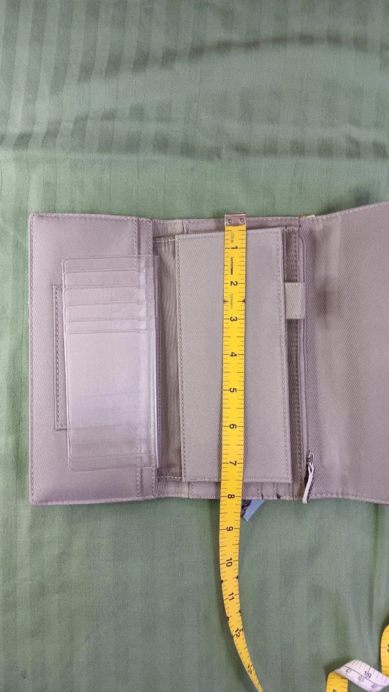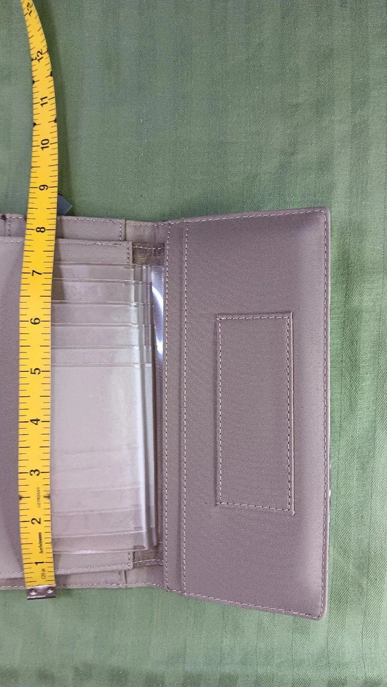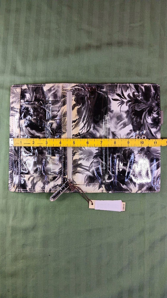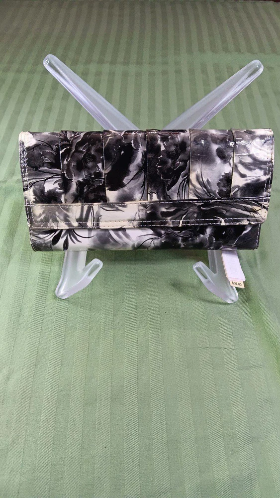 Patent leather Black and white floral design There are sections for your cards, pics, checkbook, and change. The change compartment is zipper The tri-fold is a snap button Only flaw is some yellow tinge on the exterior back and a little on the front. Hardware is hold tone