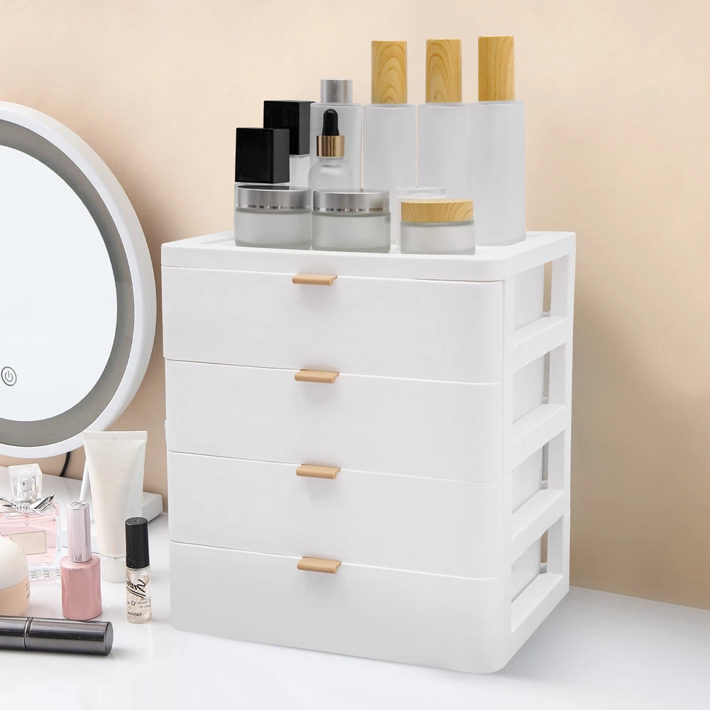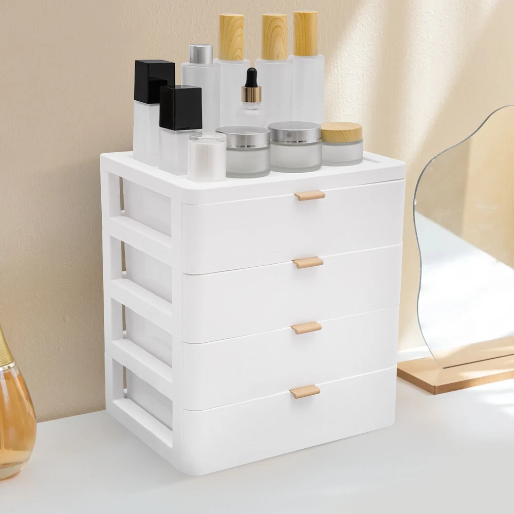 Description This desktop storage box can effectively store a variety of items such as office supplies, school supplies, and cosmetics. The 4-drawer design and top platform can make full use of the storage space and keep items neat and orderly. If you want to improve the tidiness of your home space, add beauty, and bring convenience and comfort to your life, then it is an indispensable little helper for you. Details Convex Edges: The convex edges on the top prevent items from rolling off or creating desktop clutter. Comfortable Handles: They allow you to push and pull the drawers more smoothly. Rounded Corners: They can protect your hands from being scratched during use and also enhance the aesthetics of the product. Specification Material: PP Color: White Style: Modern Shape: Rectangular Assembly Required: No Mounting Type: Tabletop Mount Room Type: Home, Office Number of Tiers: 4 Drawers + 1 Top Platform Load-bearing Capacity: About 5kg/11.02lbs Product Size: 26*20.2*29cm/10.24*7.95*11.42in Package Size: 28*22*31cm/11.02*8.66*12.2in Gross Weight: 1.5kg/3.3lbs Net Weight: 1.3kg/2.9lbs Package Included 1* Desktop Storage Box Notes Please allow the slight color difference caused by the shooting light and 1-3cm error due to manual measurement and make sure you do not mind before ordering. Sturdy and Durable: This product is made of high-quality PP, impact-resistant, and anti-rust, ensuring long-term use. Tidy and Organized: 4 drawers can be sorted to organize tissues, books, data cables, cosmetics, and other daily necessities, creating a cleaner and tidier desktop environment. You can also place frequently used items such as lotions, pens, and notepads on the top platform, so you can access them instantly. Suitable Loading Capacity: The solid PP material and stable rectangular structure provide this item with a suitable bearing capacity(about 11.02 lbs), so you can use it to store your daily cosmetics without worrying about collapse. Space-saving: It is compact (10.24*7.95*11.42in)and stackable, so you can put it on a table and make full use of vertical space, providing you with more storage space and improving space utilization. Stylish Appearance: The white color scheme and rectangular shape highlight the unique image of the product as simple and modern, suitable for most of the decorative styles of the room, and is a good desktop decoration. Effortless to Clean: Simple construction, smooth surfaces, and pull-out drawers make this product easy to clean, you just need a wet towel to easily remove dust. Exquisite Gift: With a beautiful appearance and practical function, it would be a wonderful surprise for your wife, mother, daughter, friend, or loved ones. Guaranteed Customer Service: We aim to provide quality products and services. If you have any problems, please feel free to contact us. We will reply and solve the problem for you as soon as possible.