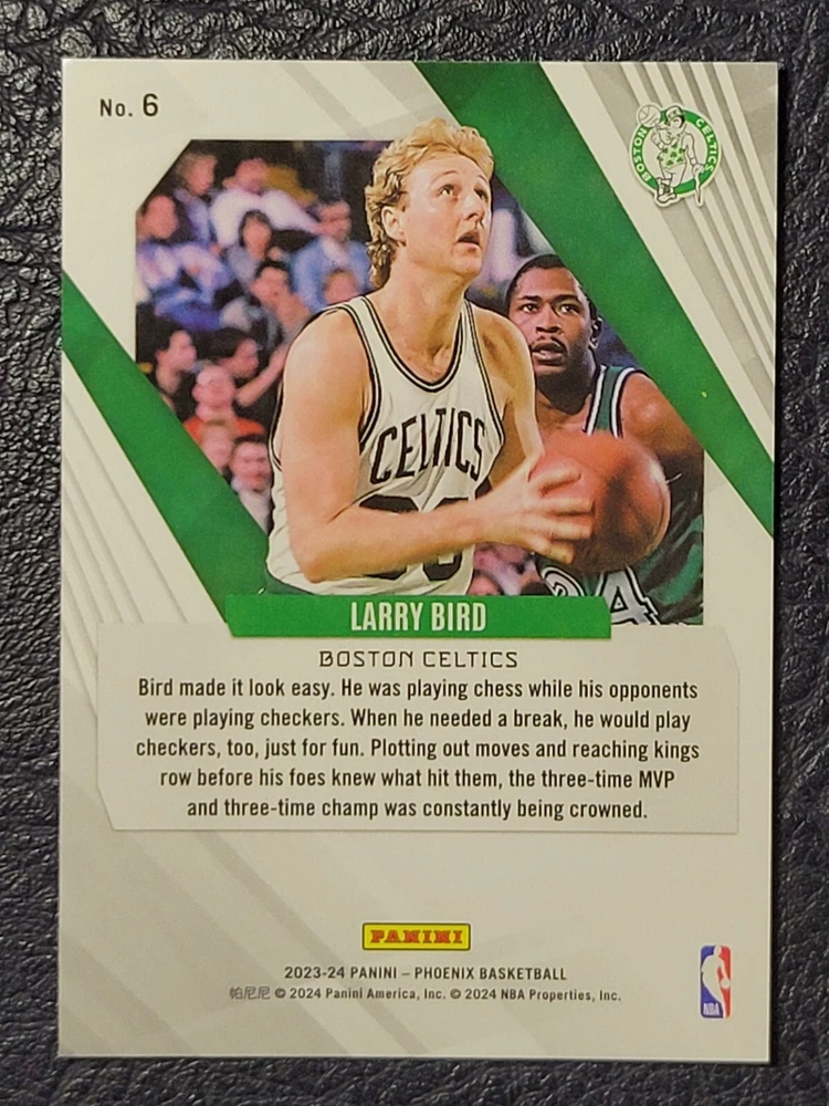 This rare Larry Bird 2023-24 Phoenix Blue Ice Parallel Insert card is a must-have for any basketball fan's collection. The card features Bird, the former Indiana State Sycamores, and Boston Celtics player, making it a unique addition to any collection. The card is made of high-quality card stock and is part of the 2023-24 Panini Phoenix set. The card is an English language sports trading card that features a parallel/variety insert. It is numbered 6 and is not autographed. The card is associated with the NBA Finals event/tournament and is a great way to commemorate Bird's impressive career. This card is a great find for any collector looking to add a unique and rare card to their collection.