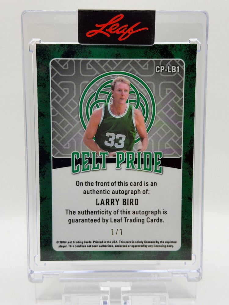 Type:Sports Trading CardManufacturer:LeafSet:2026 LeafAutograph Authentication:LeafFeatures:Chase, One of One, Parallel/Variety, Serial Numbered, AutographCard Name:Celt PrideMaterial:MetalSigned By:Larry BirdOriginal/Licensed Reprint:OriginalPrint Run:1Card Condition:Near Mint or BetterSport:BasketballYear Manufactured:2026Player/Athlete:Larry BirdLeague:National Basketball Association (NBA)Autographed:YesTeam:Boston CelticsParallel/Variety:Gold VinylCountry of Origin:United StatesLanguage:EnglishSeason:2026Card Number:CP-LB1Card Size:StandardEvent/Tournament:NBA FinalsVintage:No