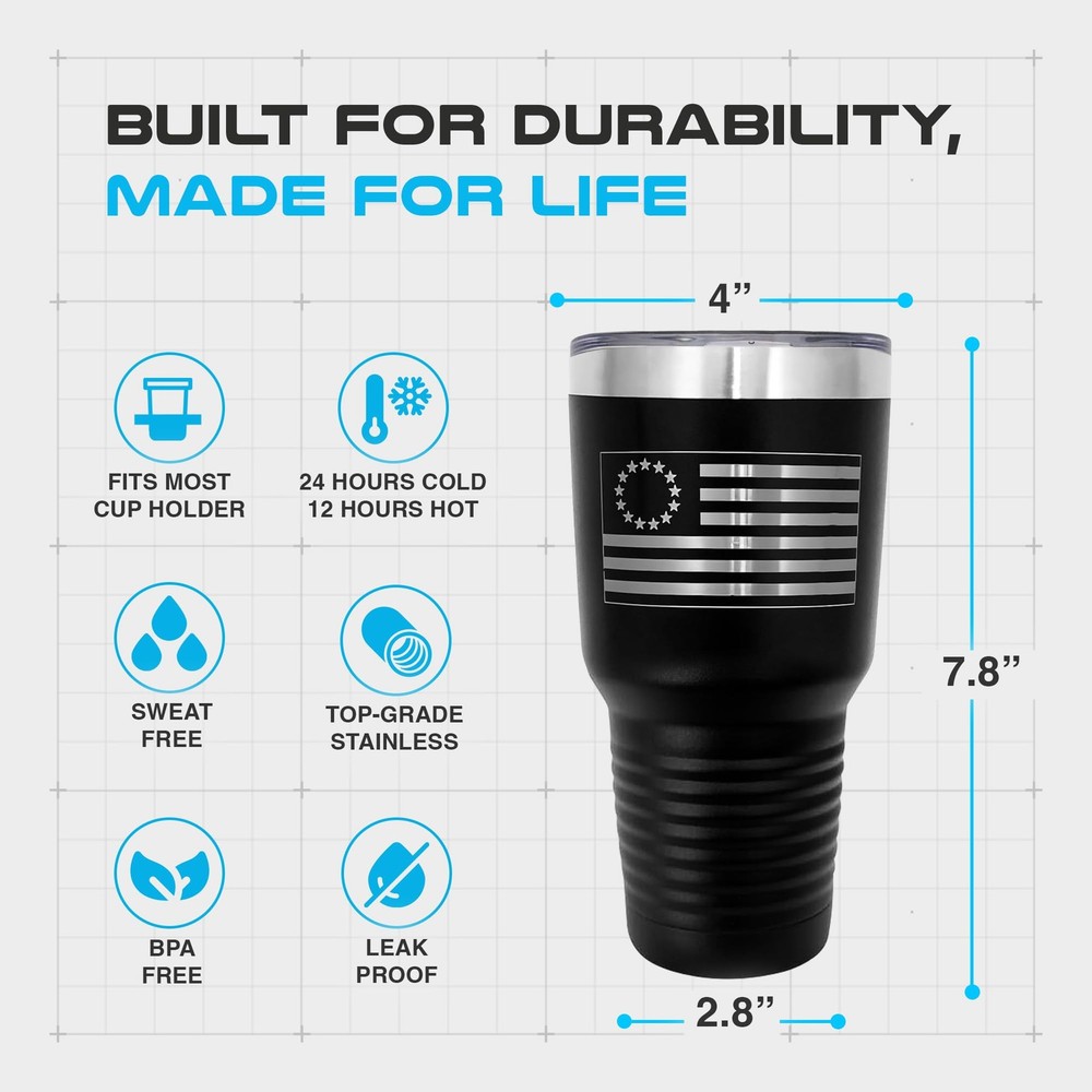 This tumbler is a must-have for patriots! The laser-engraved Betsy Ross flag looks crisp and won’t fade, making it a lasting tribute. The double-wall insulation keeps drinks cold for hours, and the included straw and cleaner add convenience. Perfect for everyday use or gifting—durable, stylish, and proudly made in the USA. Love showing off my American pride with this high-quality tumbler!