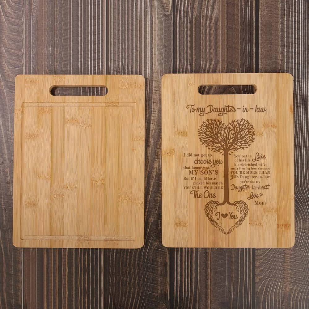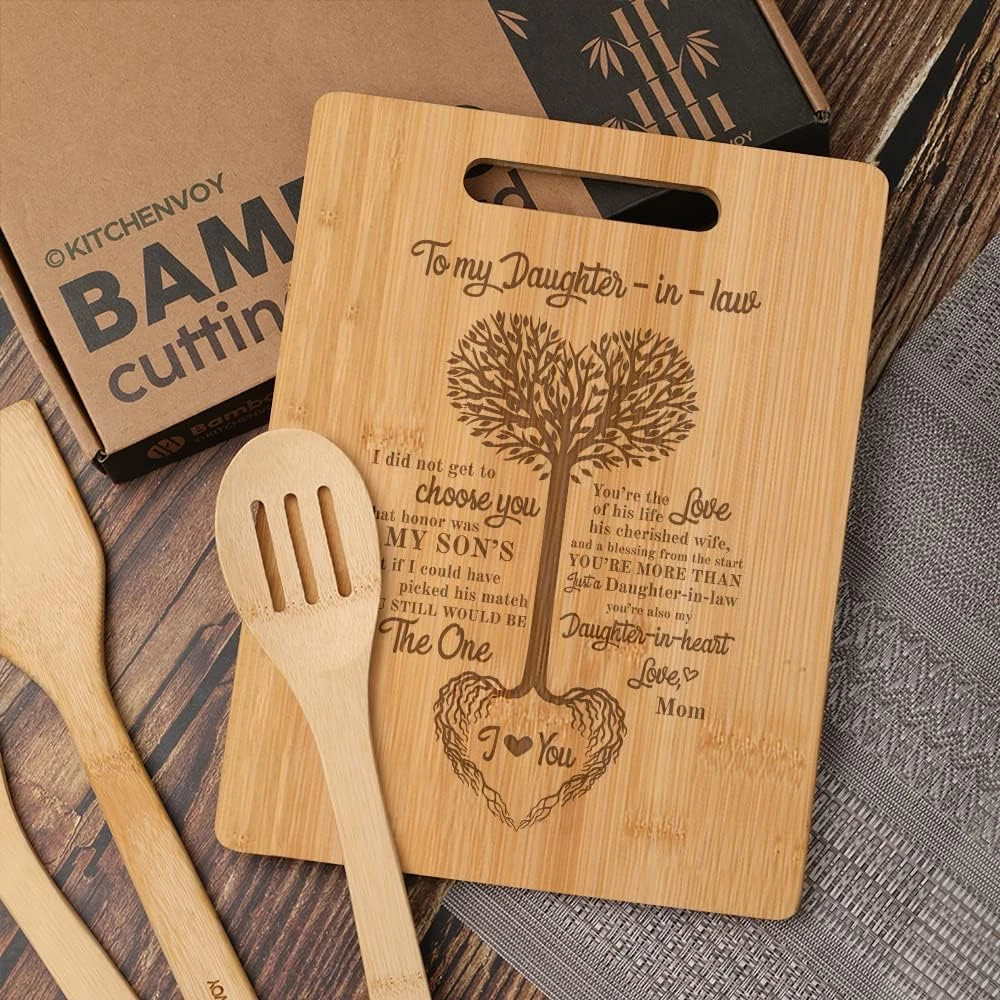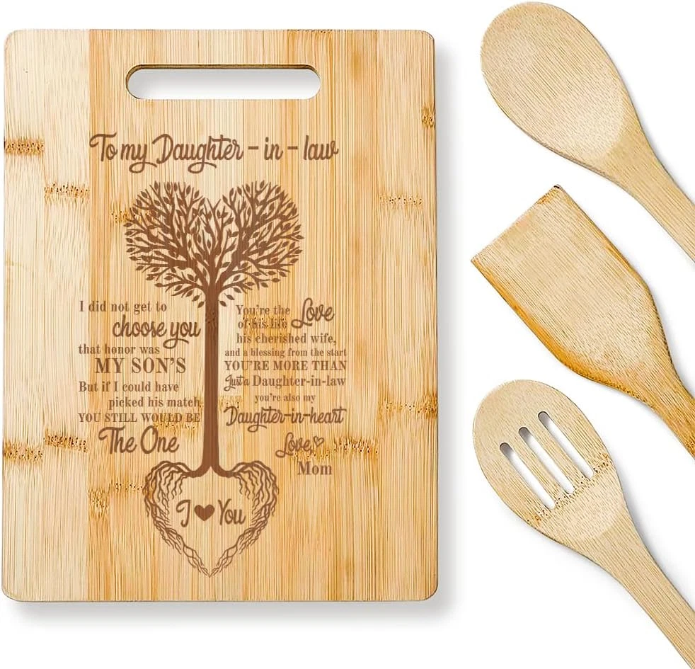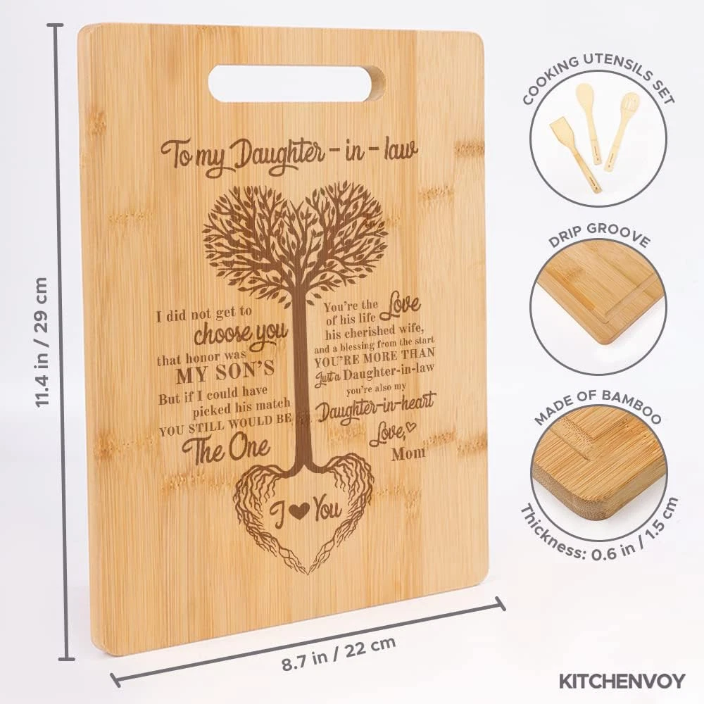 Thoughtful Kitchen Gift for Daughter: An engraved bamboo cutting board is a great gift for Daughter in Law who loves to cook on Mother's Day. A great gifts for Daughter on Christmas, a housewarming, or any special occasion. Deep Juice Groove: Built-in juice groove surrounds the carving board to retain the juices from meat, fruits, or vegetables. Your kitchen table will no longer get wet from food juices after cooking. Quick-drying and Easy-cleaning: The bamboo cutting board is less water absorption, quick-drying, and has a non-stick cutting surface. It will make cleaning this daughter board much easier than others. Safe Choices : We only use 100% bamboo material for daughter in law gifts cutting board so it doesn’t contain any chemical elements to ensure high safety in food hygiene. Two Unique Uses: You can use the solid side with a groove for cooking, or the engraved one as a decorative item/elegant serving plate. A beautiful piece of home decor and an usable cooking tool all in one. Product Description The bamboo cutting board is less water absorption, quick-drying, and has a non-stick cutting surface Built-in juice groove to retain the juices from meat, fruits, or vegetables. Your kitchen table will no longer get wet A Utensil Set - best as a Kitchen gift set for your loved ones!