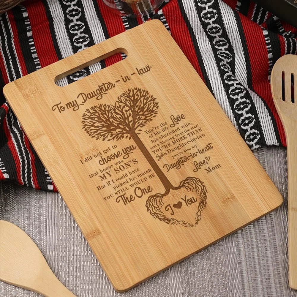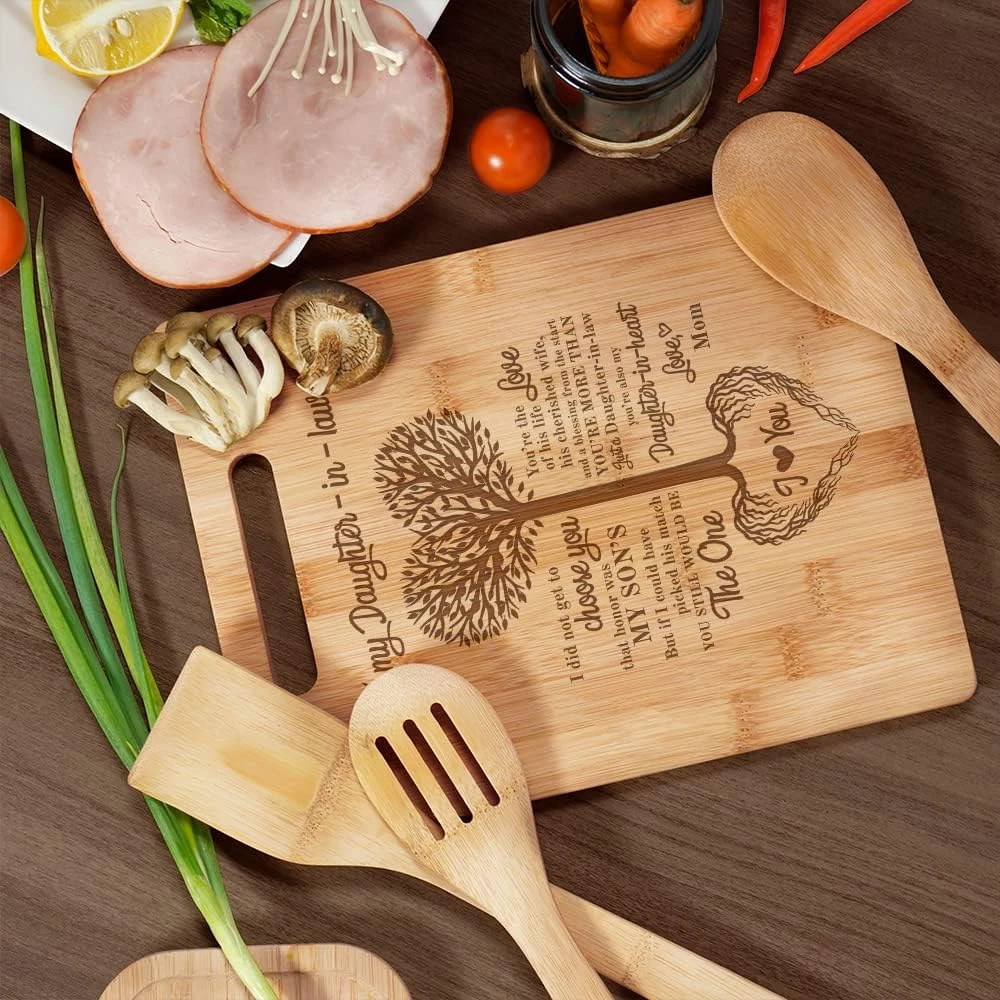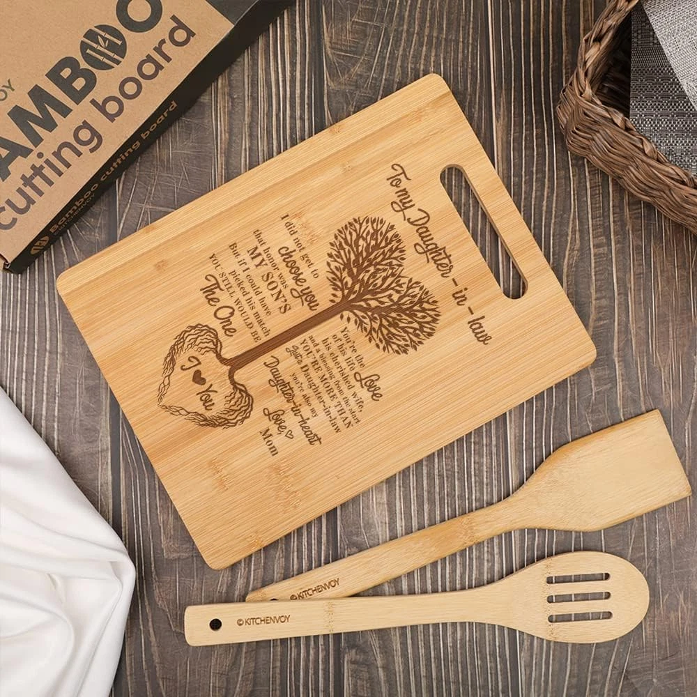 Thoughtful Kitchen Gift for Daughter: An engraved bamboo cutting board is a great gift for Daughter in Law who loves to cook on Mother's Day. A great gifts for Daughter on Christmas, a housewarming, or any special occasion. Deep Juice Groove: Built-in juice groove surrounds the carving board to retain the juices from meat, fruits, or vegetables. Your kitchen table will no longer get wet from food juices after cooking. Quick-drying and Easy-cleaning: The bamboo cutting board is less water absorption, quick-drying, and has a non-stick cutting surface. It will make cleaning this daughter board much easier than others. Safe Choices : We only use 100% bamboo material for daughter in law gifts cutting board so it doesn’t contain any chemical elements to ensure high safety in food hygiene. Two Unique Uses: You can use the solid side with a groove for cooking, or the engraved one as a decorative item/elegant serving plate. A beautiful piece of home decor and an usable cooking tool all in one. Product Description The bamboo cutting board is less water absorption, quick-drying, and has a non-stick cutting surface Built-in juice groove to retain the juices from meat, fruits, or vegetables. Your kitchen table will no longer get wet A Utensil Set - best as a Kitchen gift set for your loved ones!