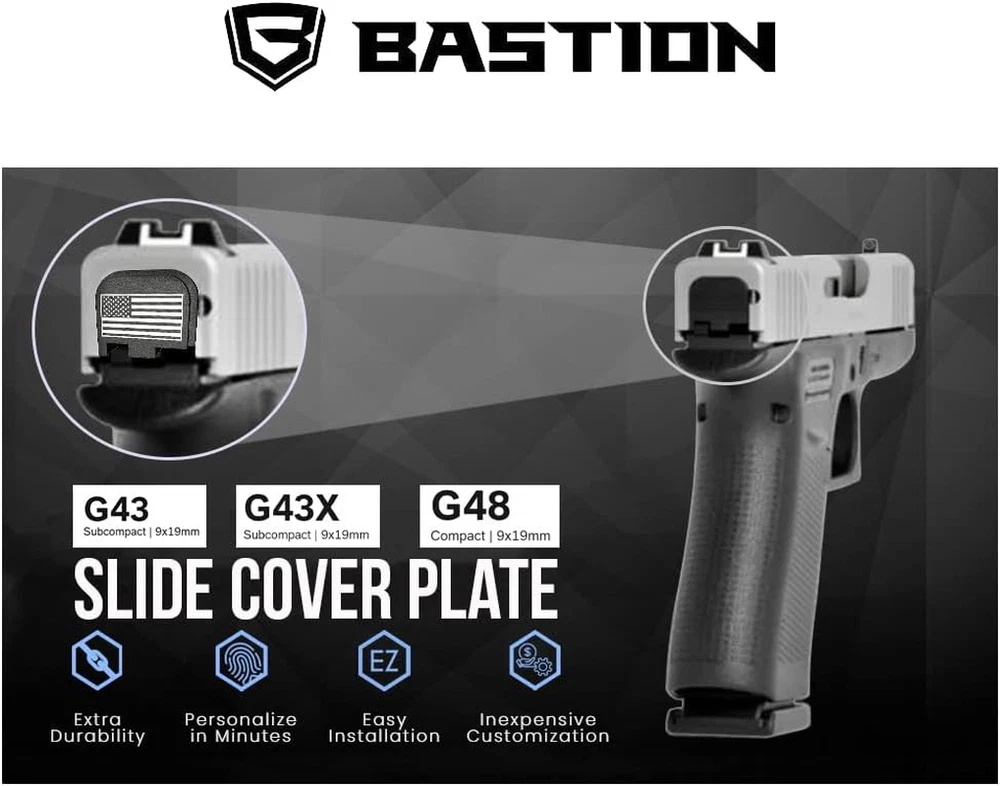 Store New Arrivals Add to Favorite View Feedback Contact Laser Engraved Butt Plate, Rear Slide Cover Back Plate for Glock G43, G43X, and G48 9Mm ONLY - Smile Wait for Flash… Description Part Number Does Not Apply Style Smile Wait for Flash Item Dimensions LxWxH 0.6 x 0.6 x 0.2 inches Color Black Package Weight 0.01 Kilograms Manufacturer LLC Item Package Dimensions L x W x H 4.09 x 2.52 x 0.39 inches Size G43, G43X and G48 PREMIUM QUALITY CUSTOM ALUMINUM BACKPLATE FOR GLOCK | SUPER EASY & QUICK TO INSTALL, NO NEEDED: Custom Back Plate designed to FIT GLOCK 43, 43X, and 48 9mm MODELS ONLY; Bastion’s Slide Back Plate snaps perfectly in place allowing you to conveniently personalize your device. WON’T RUB OFF, LASER-ENGRAVED HIGH RESOLUTION ALUMINUM (NOT PAINTED ON) SLIDE COVER PLATE FOR GLOCK: ‘Laser-Engraved’ makes a huge difference! Unlike other custom Rear Cover Plates for Glock that are painted on, Bastion LASERED & ENGRAVED this artwork so that it won't rub off or wear off over time. MADE IN THE USA, PREMIUM HARD COAT ANODIZED T6 MACHINED ALUMINUM: Premium quality Butt Plate for Glock that’s machined from the highest quality, hard coat anodized black T6 aluminum that stays tough and durable even when removed and replaced from time to time, giving you the extreme durability you deserve. STANDOUT CUSTOM LOOK, FANTASTIC REPLACEMENT FOR PLASTIC FACTORY PART: Not only keeps your firing pin and the extractor plunger assembly in place, it also adds a little flair to your plain old plastic back slide cover. The fastest and most inexpensive way to customize your device! BASTION SATISFACTION GUARANTEE: Buy risk-free! Please do reach out to us in case of any issues and we’ll quickly do all we can to make it right. Product Description Top Quality Gear You're Confident to Carry Every Day Bastion Gear is an American company that has put innovation, distinctive design, and unrelenting quality at the core of everything we make and do since 2012. We have made an unwavering commitment to create products that you can carry every day with a kick of personality. We aim for every piece that we offer you to have nailed both functionality and style before it gets out of our warehouse. Adding how we feel about things to what we do in life makes the experience a lot more meaningful. We strongly believe that function and emotion in a product make it much better. We want you to have more than just a product in your hand or on your pistol; we want you to have a positive experience with your every purchase and be excited about every single item we make! Blank Bastion Back Plate About Bastion Bastion offers engraved plates and accessories for hand guns along with an outstanding collection of EDC gear. We are a fairly young company, but already making a big splash in the weapon accessories and everyday carry markets. Our high-quality T6 hard anodized aluminum slide and base plates are available for Glock, Springfield, and SW M&P pistols with more manufacturers and models included every year. Established in 2012, we continue to expand our product line with premium-quality pistol accessories. Add a Great Look for your Glock! Give your pistol a signature feel Looking for ways to personalize your guns to make them look less bland? Give your stock pistol a custom look — make yours truly yours! Sometimes the smallest things make the biggest impact. Replace the plastic factory-provided slide back-end plate with a custom Bastion laser-engraved butt plate for Glock G43, G43X and G48 9mm. We are here to help you QUICKLY customize your pistol in the MOST AFFORDABLE way! No regrets when it looks this good! Aesthetic customization Quality - High Permanent Laser engraved Durable & exceptional Resolution - Ultra High Made in USA The FASTEST and MOST AFFORDABLE way to MAKE YOURS TRULY YOURS! Laser-engraved At Bastion, quality is priority. To prevent print-fading, we do not paint the designs on the surface. We use laser-engraving technique for better color retention, better look and more durability. There’s really no need to choose between function and appearance. In every product we create, we make sure you don’t need to compromise. Perfect Fit | Quick Easy to Install Designed and precision CNC-machined to perfectly fit your Glock G43, G43X or G48 (9 mm only). Give your Glock an easy and affordable DIY upgrade in under a minute! No permanent modifications needed to install. If you change your mind later or become bored of the design, it’s easy to remove and change out. Durable | Long-Lasting Design Our plates are CNC-machined from a billet of T6 Aluminum. The same material that is used on airplanes! Once machined, our plates are HARD COAT anodized to make sure the finish is extra durable. All of the designs are NEVER PAINTED, we do not use STICKERS. Every plate is LASER ENGRAVED, so the artwork will not rub off. The best upgrade you'll ever put on a gun! Guaranteed! ABOUT US We offer the best prices around on high quality products. Our E-store includes media such as books, movies, music and games while offering electronics, toys, sporting apparel, clothing, tools, general home, garden items and more. SHIPPING We are always working hard to ensure your package arrives as soon as possible. Please understand that some factors like weather, high postal traffic, and the performance of shipping companies are outside of our control. We offer free shipping to the lower 48 states and ship within 2 business days of payment, usually sooner. We do not accept P.O. Boxes. Please provide a physical address. For shipping outside of the continental USA, we only use eBay's Global Shipping Program.The item is shipped to KY and then sent to the rest of the world. International customers are responsible for all duties and taxes. Continue to check out in order to calculate costs for shipping the item to your country. Messages regarding eBay's Global Shipping Program MUST be directed at eBay EXCLUSIVELY. RETURNS We offer a 30-Day Ret