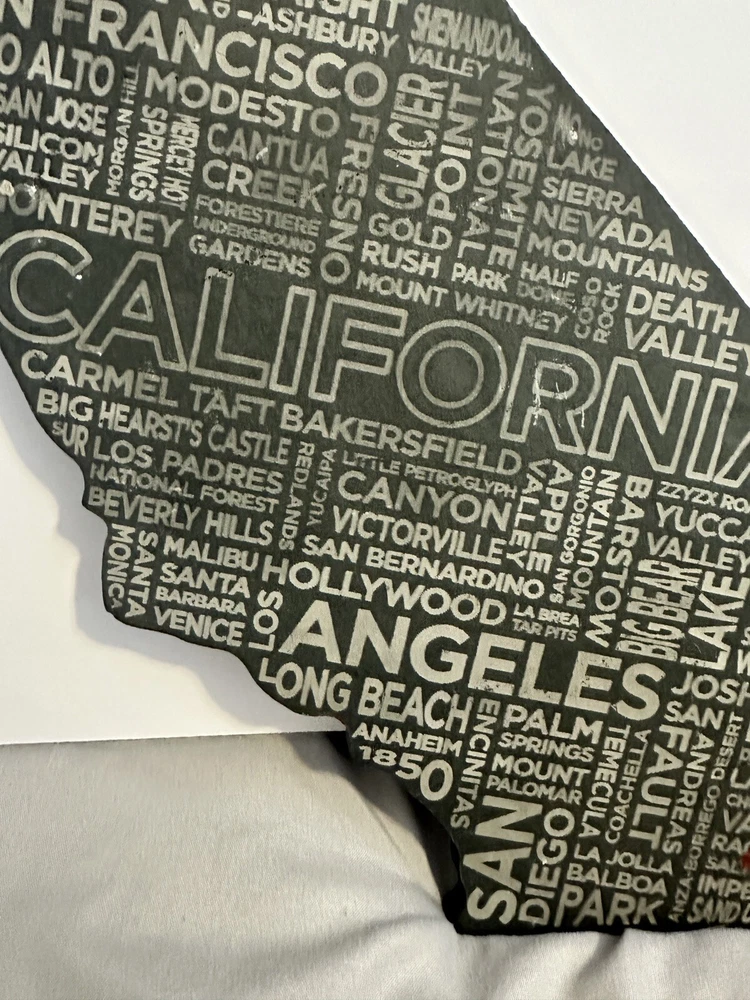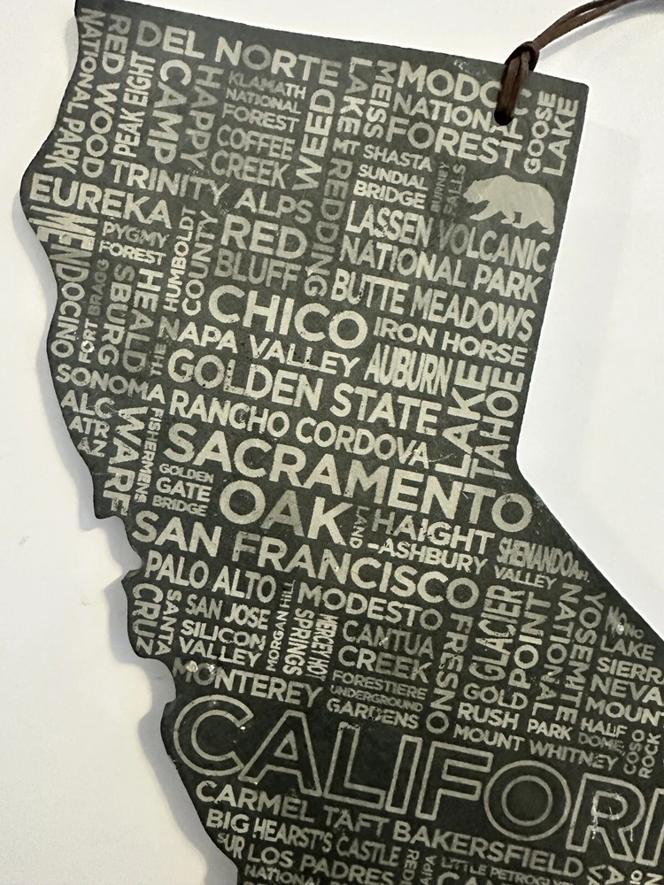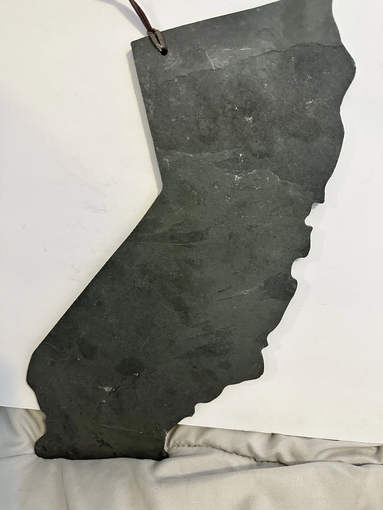 Heavy 2.5lb laser etched black slate cutout silhouette of the state of California with major cities engraved as the design. Can be use as a decorative wall art. Seeing similar items for sale as a cheeseboard or serving tray. Fun item for new Californian or a California native. Or unique cheeseboard collector. Measures about 13” long.