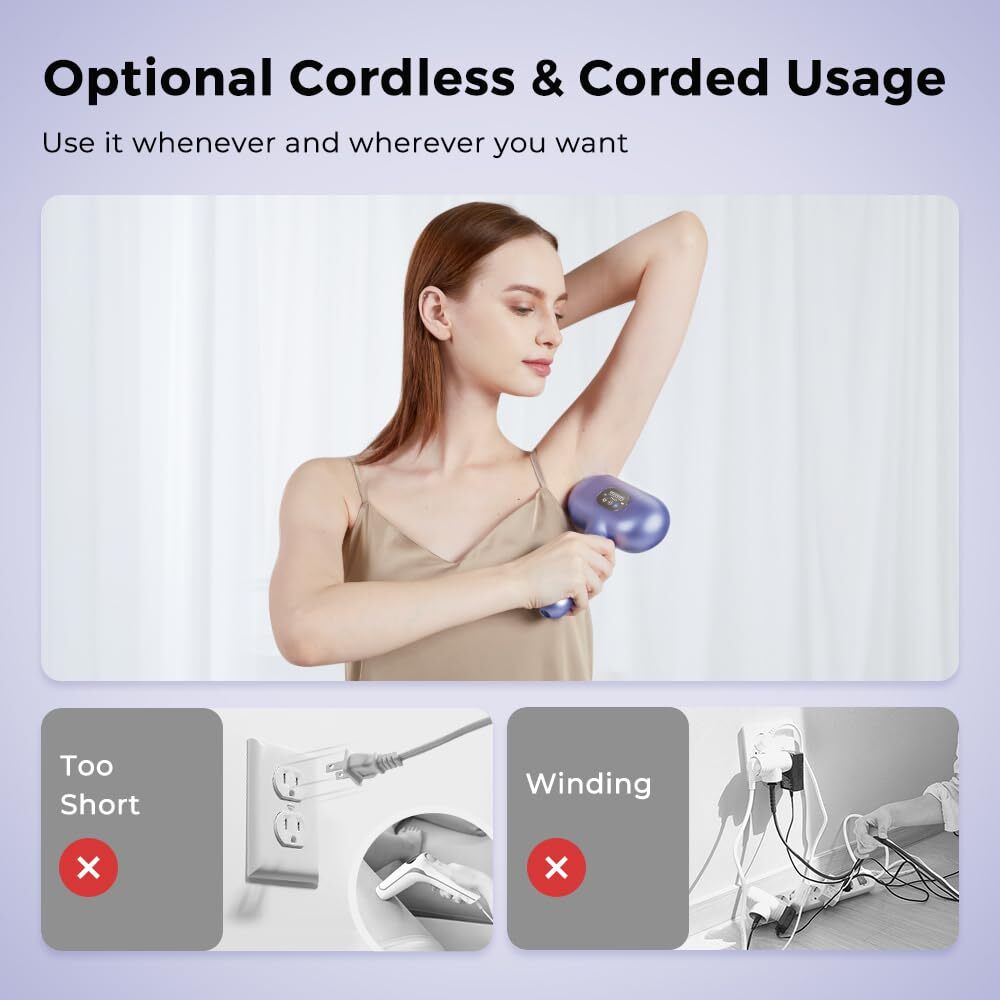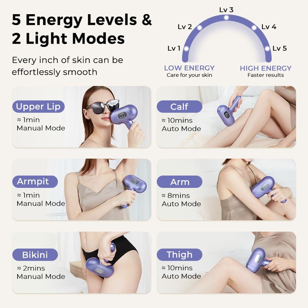 FLEXIBLE CORDLESS USE: Say goodbye to annoying power cords during epilation! cordless IPL hair removal device offers you unparalleled freedom! Ergonomics design, comfortable to hold, easy to use and control. The ipl laser hair removal device is equipped with a powerful 2600mAh battery, which can perform full-body permanent hair removal without wiring, enjoy a convenient and flexible hair removal anytime, anywhere FAST & EFFECTIVE LONG-LASTING RESULTS: Visible hair reduction in 3 weeks. Discover the power of our high-energy 20.4J long wave technology for effective and salon-level permanent IPL hair removal in 6 weeks. With an impressive unlimited 999,999 flashes, meet your entire family's hair removal needs without cartridge replacements. Long press the power button to freely switch between continuous flash mode and manual mode, saving your time and removing hair efficiently ICE-COOLING & PAINLESS: IPL laser hair removal device with advanced sapphire cooling system, cooling the skin at 10°C (50°F) during the entire hair removal process, no need or ice packs, get a true painless and comfortable hair removal without redness. Even the most sensitive body parts can get safe and effective hair removal SAFE & DURABLE: This at home laser hair remover is equipped with dual-air channel alloy, which can dissipate heat efficiently, make it safe to use and prolong the service life of the device. Designed with eye-safe settings, the hair remover emits pulsed light only when the light window is in full with your skin. Please note, this IPL hair removal device cannot remove hair from tattooed areas; avoid using it on tattoos LET'S DO HAIR REMOVAL IN WINTER: It doesn’t matter if you miss the summer. Hair removal is more suitable in winter. You don’t need to use sun protection. After hair removal, the skin will recover faster and the effect will be more significant, help you get smooth skin before summer arrives ! Tips: Count on us for top-notch . We take full responsibility for any defective and are here to address your questions or concerns