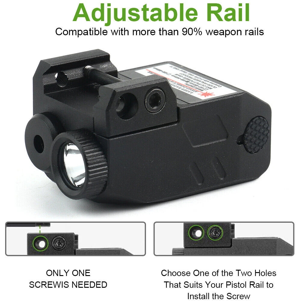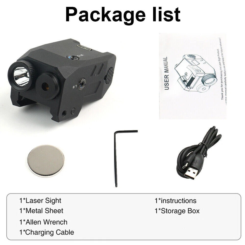 SPECIFICATION Lumen: 300LM Lighting range: 150 meters Laser wavelength: 650nm Endurance time: Laser + lighting at the same time, battery life: 45 minutes; Working time only with lighting: 60 minutes, Working time with laser only: 4 hours Battery capacity: 300mAh Battery: built-in lithium battery Charging time: 50 minutes, the charging indicator is red and fully charged green Lighting mode: strong light, flash Suitable for rails: suitable for 20-21mm Picatinny rails Size: length: 5cm, width: 2.99cm, height: 2cm Weight: 75g FEATURES 【Huge Performance】 - Extreme bright LED flashlight and laser sight combo. Very bright with such a small size, combining both highly visible green beam and 600 lumens of white light, 200-250m highly visible distance. 【Two Versatile Settings】 - Flashlight includes steady on/strobe modes. Working modes: Steady/Strobe light, Pistol laser Only, Steady/Strobe Flashlight+ Green Laser, Green laser beam can be adjusted vertically and horizontally. The package contains a small wrench, which can be inserted into the hole to adjust the accuracy of the green dot,The green laser light combo is very powerful and can be seen at distances of up to 200 meters! 【FITMENT AND DESIGN】- Lightweight and featuring a quick-release mount feature and tactical bezel. Robust aluminum material makes the green laser beam firm and stable, can with stand strong impacts and vibrations. It will not shake or fall after installation, IPX4 Waterproof and lightweight, it’s a perfect tactical light for, security, or bodyguards. 【Pistol Light Laser Combo】- This versatile pistol light lase for pistol can be mounted on any with a picatinny or weaver rail. Our Flashlight laser sight can be install and removal quickly within few seconds. PACKAGE 1 x laser Flashlight 1 x Charging Cable 2 x Hexagon Wrench 1 x User Manua RETURN For defective or wrong items received : Buyers must report to the Seller within 30 days after received of goods. For defective item, Buyers must send with email of photos indicating the area and condition of defects. Upon acknowledgement by the Seller, the item must be returned within 30 days thereof. Actual postage fee for returning, as well as costs for re-sending the replacement item will be borne by the Seller. For exchange of sizes : We may accept exchange of sizes subject to our stock availability. If accepted, the Buyers must return the item at their own expenses No exchanges or returns will be accepted for any reasons other than the above SHIPMENT Please complete your delivery address with contact phone number, especially Russia buyer, please confirm your full name. Please make sure the delivery address is correct before payment. Products will be shipped out within 3 working days after payment confirmation. We are not responsible for any customs tax or import tax. We are sincerely sorry if you do not receive your items in the limited time, please contact us first. We will handle it together with you to get your satisfaction again. CASE & FEEDBACK We highly respect customers' advice, praise and complaints, absorbing every useful information to get a better product supplying. When you are satisfied with products and service, please leave positive feedback, we will slove it for you asap. If you have any problem regarding your transaction, please contact us first. We will try our best to meet your satisfaction rather than getting a poor feedback from you. Any problems,please do not hesitate to contact us at first time before we always try our best to solve it for you!