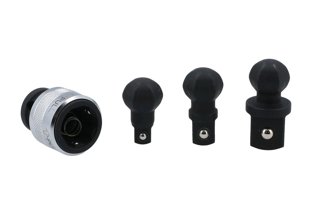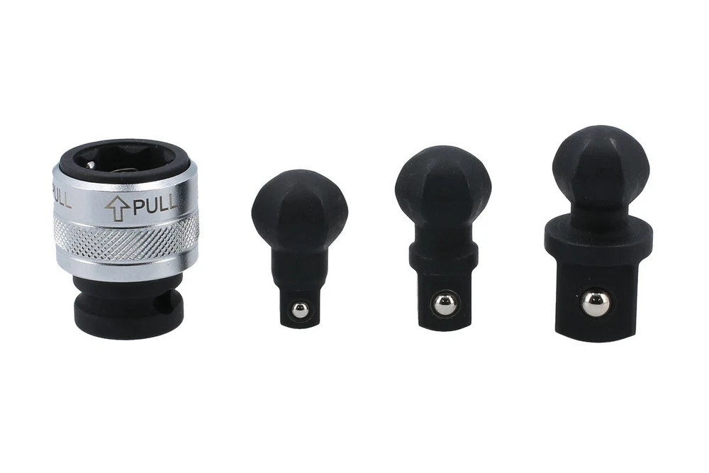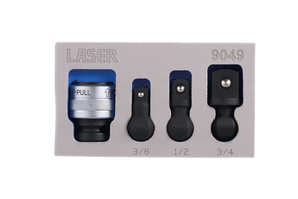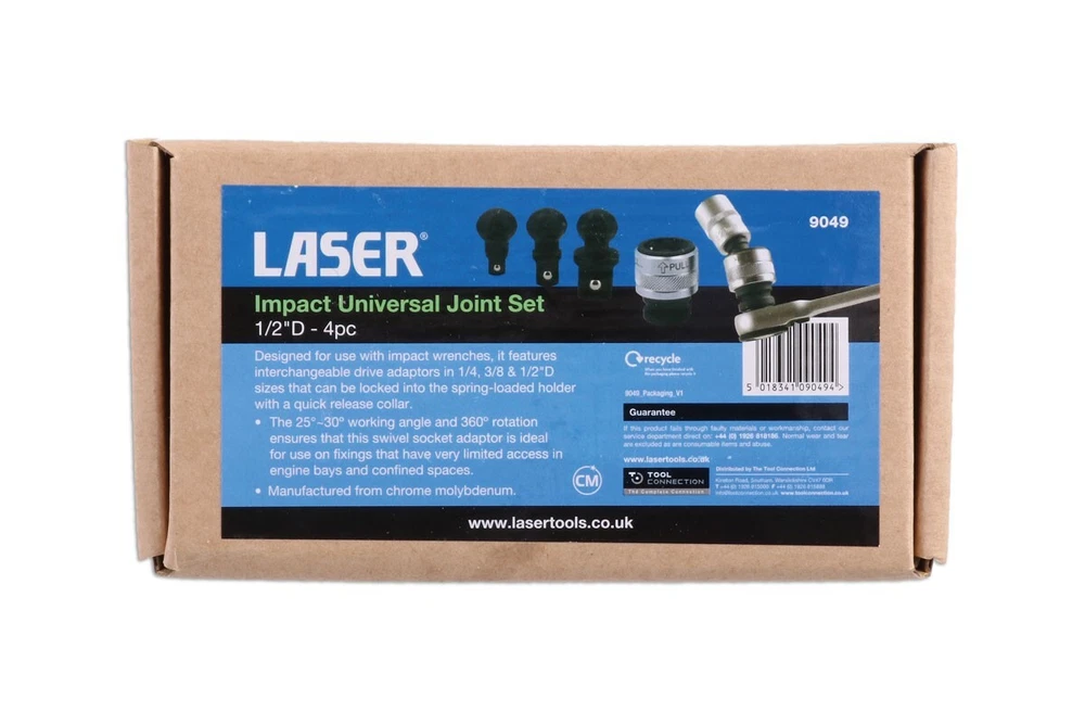 Laser Tools 9049 4 Piece Impact Universal Joint Set 1/2"D Features and Benefits: A 1/2"D universal joint designed for use with impact wrenches, that features interchangeable drive adaptors in 3/8, 1/4 & 3/4"D sizes that can be locked into the spring-loaded holder with a quick release collar. The 25°30° working angle and 360º rotation ensures that this swivel socket adaptor is ideal for use on fixings that have very limited access in engine bays and confined spaces. Manufactured from chrome molybdenum. Presented in an EVA foam tray (37 x 80 x 150mm) convenient for user storage & limiting packaging waste. 3/8"D universal joint set also available, please see Laser Part No. 9048.