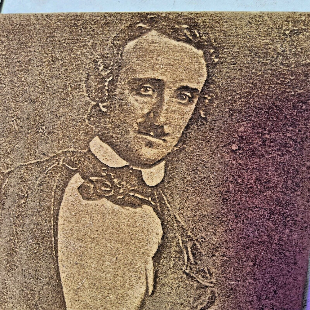 Laser engraved Edgar Allen Poe textured 3d portrait mdf board 6x8 writer raven author soldier american history horror suspense Hard to tell from but it has some nice texture to it. Like a slight 3d effect. Comes with custom laser cut stand. 6x8. 1/8" made for laser mdf board Quite a bit of work goes into making my laser cut/engraved art. I come up with most of art/shapes,draw them out,edit colors,sizes, transfer files to multiple formats,paint,assemble,etc. Lots of steps to get some fine off the wall pieces. From tablet,to you. I have this design as an art guitar as well in listings. Or will be uploading soon. Can give bundle deal for multiple pieces. Not entertaining custom pieces at this moment. ***Treasure Suite offers you many pieces of my art prints now*** ###This section is for laser cut sublimation prints of my digital art. Measurements vary by piece. ### *Welcome to my unique collection of digital art, where creativity meets craftsmanship! Each piece in this category features my original digital designs, heat pressed into vibrant sublimation prints on laser cut whiteboard material. Some are engraved then hand painted. These art pieces are not just decorations, they are collectibles that bring a touch of gothic, rock and roll, horror, pin-up, and lowbrow art into your space. *perfect for:* *man cave *castle *bungalow *abode *domicile *penthouse *flat *cabin *studio *boutique hotel *yacht *etc *These pieces make fantastic gifts for art enthusiasts and collectors alike. Who doesn't enjoy vibrant digital art of out of this world space huntresses, demon witches, cyberpunk vixen cyborgs, spooky mistresses, hearses, hotrods, and so on? ***May consider custom orders of laser cut or engraved items.***