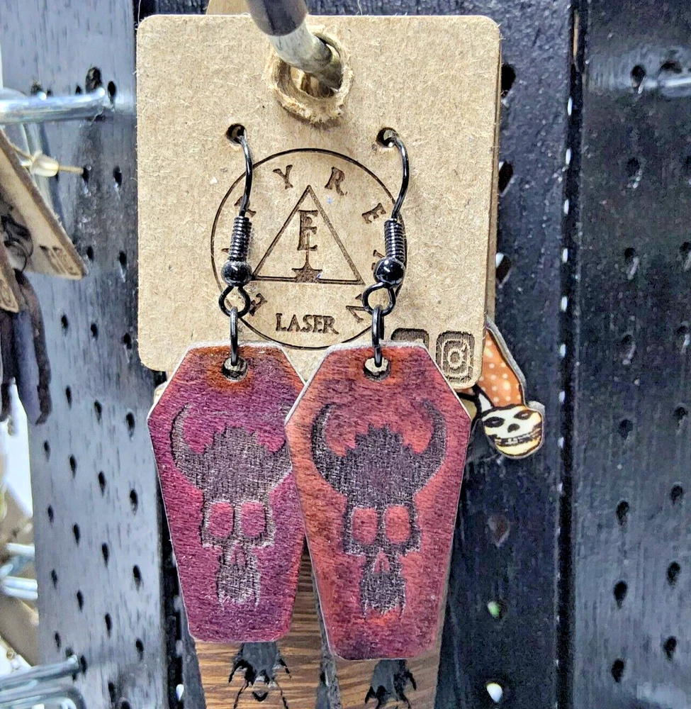 Laser engraved cut coffin demon skull earrings hallowen custom horror fashion Based off a demon skull coffin design i made digitally. Then sent through laser machine. Made on maple. Measures 1.5"h x .75"w x 1/4"d. Loaded with hypoallergenic metal ear hooks. Check out plenty of other lasered creations of mine in shop. Order a few pieces and I'll give you a bundled art deal. Not doing customs at the moment but may be persuaded to fire up the laser for right project. Ebay reselling keeps me busy. Message me to find out. Thanks again for visiting my Ebay shop. ***Treasure Suite offers you many pieces of my art prints now*** ###This section is for laser cut sublimation prints of my digital art. Measurements vary by piece. ### *Welcome to my unique collection of digital art, where creativity meets craftsmanship! Each piece in this category features my original digital designs, heat pressed into vibrant sublimation prints on laser cut whiteboard material. Some are engraved then hand painted. These art pieces are not just decorations, they are collectibles that bring a touch of gothic, rock and roll, horror, pin-up, and lowbrow art into your space. *perfect for:* *man cave *castle *bungalow *abode *domicile *penthouse *flat *cabin *studio *boutique hotel *yacht *etc *These pieces make fantastic gifts for art enthusiasts and collectors alike. Who doesn't enjoy vibrant digital art of out of this world space huntresses, demon witches, cyberpunk vixen cyborgs, spooky mistresses, hearses, hotrods, and so on? ***May consider custom orders of laser cut or engraved items.***