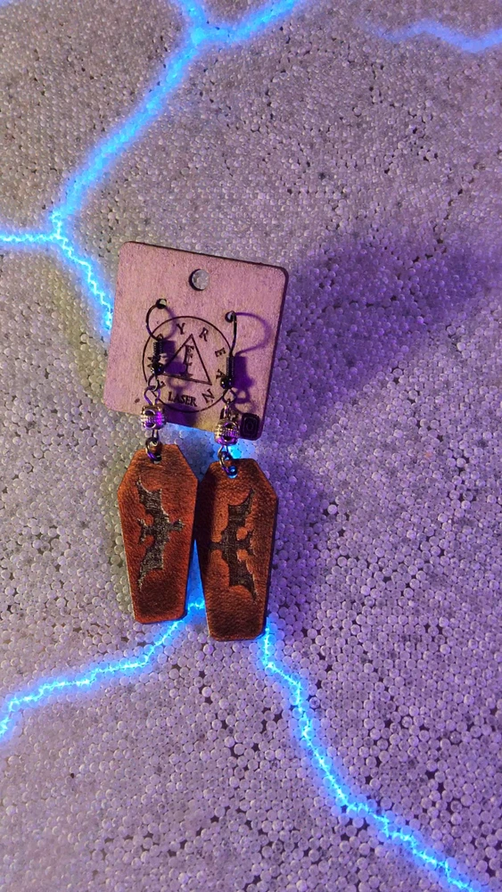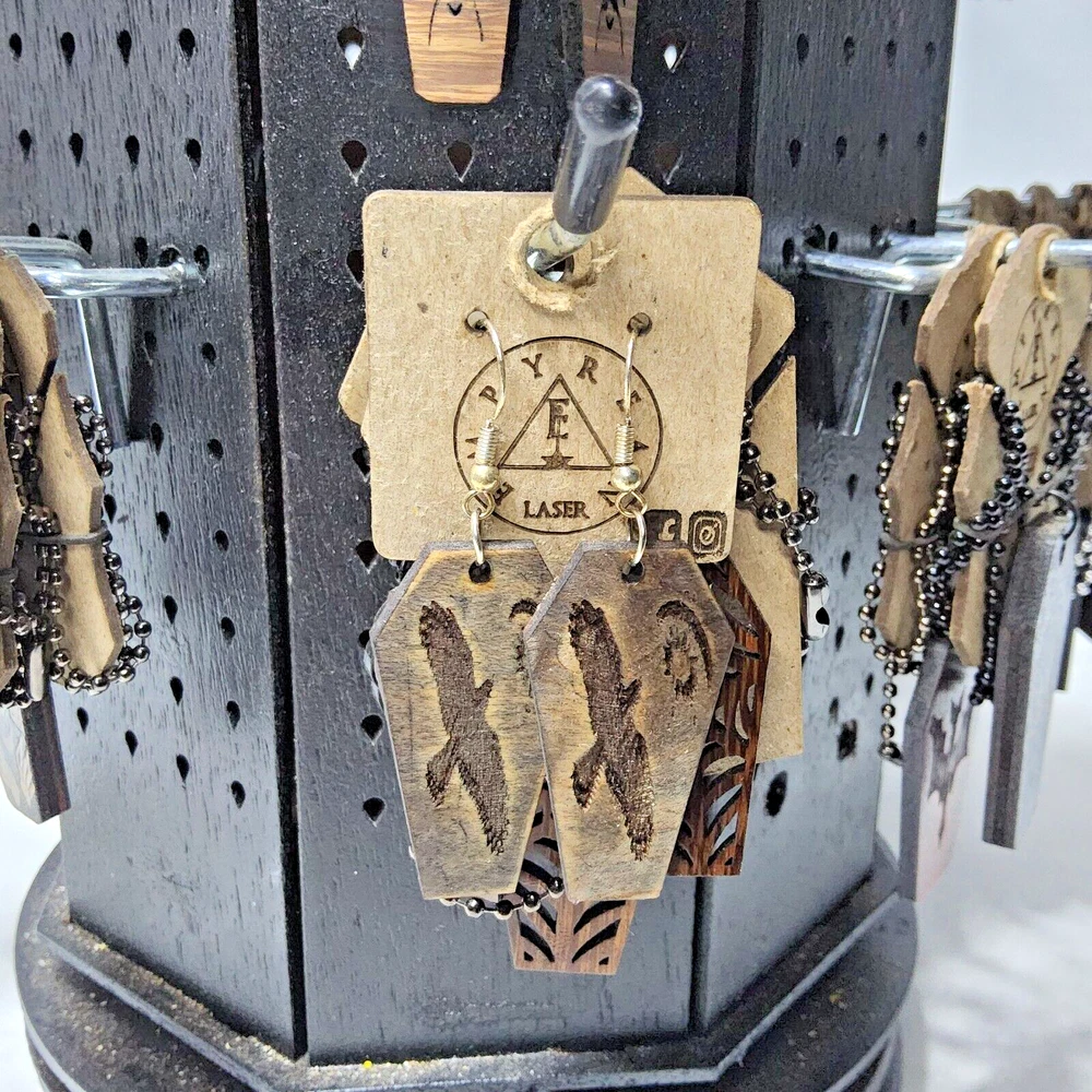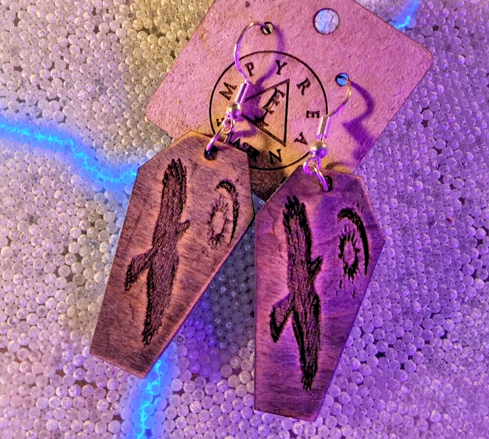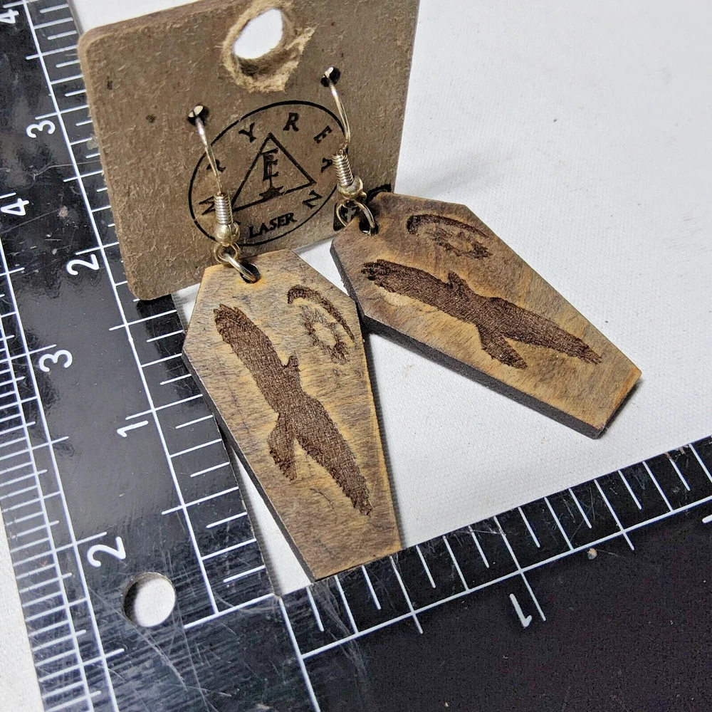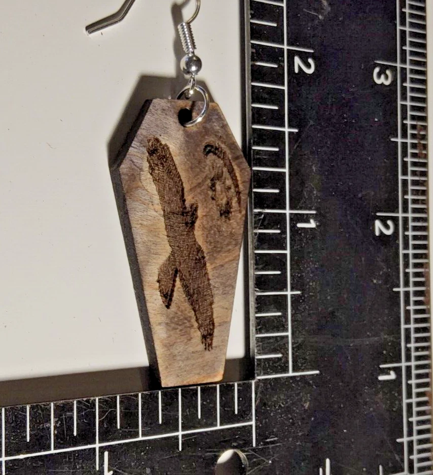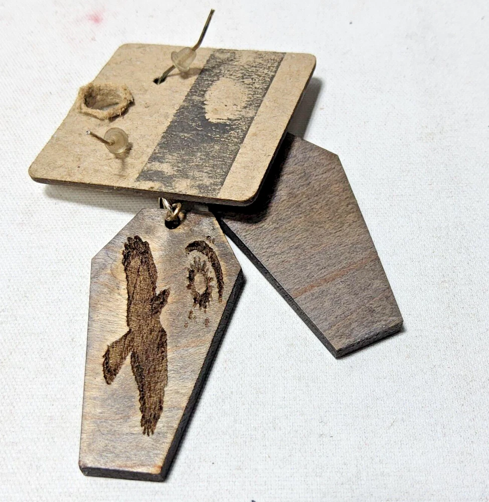 Laser engraved cut crow moon sun earrings hallowen custom art fashion coffin Based off a digital drawing i made of a crow flying towards moon and sun. Laser engraved and cut on maple. Measures 1.75"h x .75"w x 1/4"d. Loaded with hypoallergenic metal ear hooks. Check out plenty of other lasered creations of mine in shop. Order a few pieces and I'll give you a bundled art deal. Not doing customs at the moment but may be persuaded to fire up the laser for right project. Ebay reselling keeps me busy. Message me to find out. Thanks again for visiting my Ebay shop. ***Treasure Suite offers you many pieces of my art prints now*** ###This section is for laser cut sublimation prints of my digital art. Measurements vary by piece. ### *Welcome to my unique collection of digital art, where creativity meets craftsmanship! Each piece in this category features my original digital designs, heat pressed into vibrant sublimation prints on laser cut whiteboard material. Some are engraved then hand painted. These art pieces are not just decorations, they are collectibles that bring a touch of gothic, rock and roll, horror, pin-up, and lowbrow art into your space. *perfect for:* *man cave *castle *bungalow *abode *domicile *penthouse *flat *cabin *studio *boutique hotel *yacht *etc *These pieces make fantastic gifts for art enthusiasts and collectors alike. Who doesn't enjoy vibrant digital art of out of this world space huntresses, demon witches, cyberpunk vixen cyborgs, spooky mistresses, hearses, hotrods, and so on? ***May consider custom orders of laser cut or engraved items.***