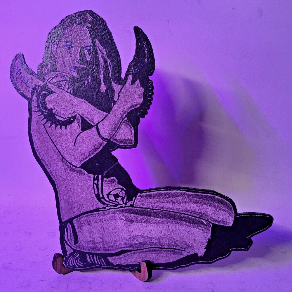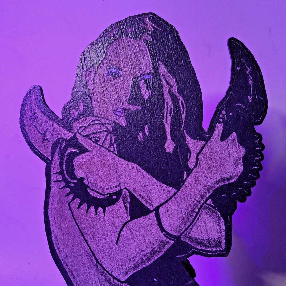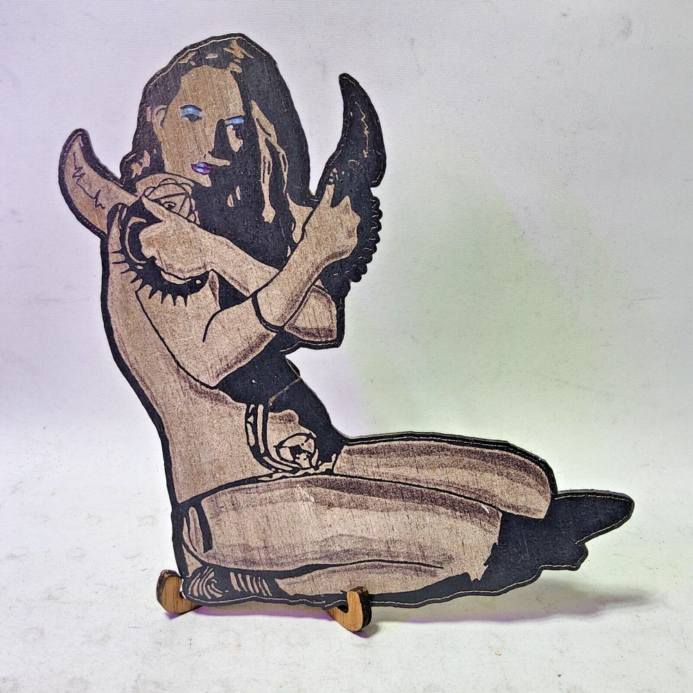 Laser engraved cut pinup with knives wooden digital art print magnet 8.5x7.5 by me I drew this up around 2010 but the magic of lasers made this possible. I have others listed here too. Magnetized. Quite a bit of work goes into making my laser cut/engraved art. I come up with most of art/shapes,draw them out,edit colors,sizes, transfer files to multiple formats,paint,assemble,etc. Lots of steps to get some fine off the wall pieces. From tablet,to you. Can give bundle deal for multiple pieces. Not entertaining custom pieces at this moment. ***Treasure Suite offers you many pieces of my art prints now*** ###This section is for laser cut sublimation prints of my digital art. Measurements vary by piece. ### *Welcome to my unique collection of digital art, where creativity meets craftsmanship! Each piece in this category features my original digital designs, heat pressed into vibrant sublimation prints on laser cut whiteboard material. Some are engraved then hand painted. These art pieces are not just decorations, they are collectibles that bring a touch of gothic, rock and roll, horror, pin-up, and lowbrow art into your space. *perfect for:* *man cave *castle *bungalow *abode *domicile *penthouse *flat *cabin *studio *boutique hotel *yacht *etc *These pieces make fantastic gifts for art enthusiasts and collectors alike. Who doesn't enjoy vibrant digital art of out of this world space huntresses, demon witches, cyberpunk vixen cyborgs, spooky mistresses, hearses, hotrods, and so on? ***May consider custom orders of laser cut or engraved items.***