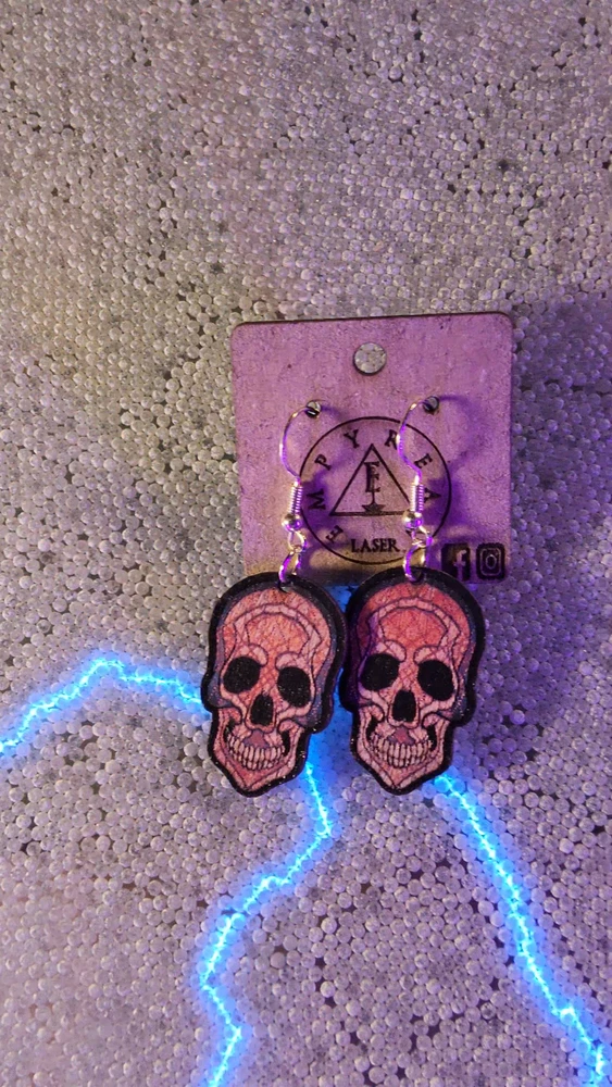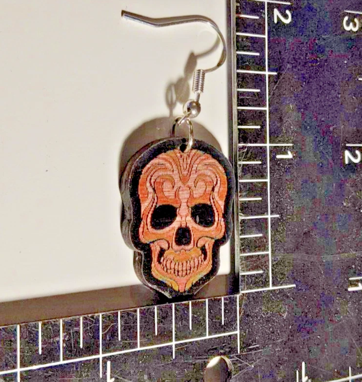Laser engraved cut grey skull custom art earrings horror fashion goth halloween Sketched a pic of a red and black skull on tablet, then transferred design to my laser machine to engrave then cut out earring shapes. Measures 1"h x .75"w x 1/4"d. Loaded with hypoallergenic metal ear hooks. Check out plenty of other lasered creations of mine in shop. Order a few pieces and I'll give you a bundled art deal. Not doing customs at the moment but may be persuaded to fire up the laser for right project. Ebay reselling keeps me busy. Message me to find out. Thanks again for visiting my Ebay shop. ***Treasure Suite offers you many pieces of my art prints now*** ###This section is for laser cut sublimation prints of my digital art. Measurements vary by piece. ### *Welcome to my unique collection of digital art, where creativity meets craftsmanship! Each piece in this category features my original digital designs, heat pressed into vibrant sublimation prints on laser cut whiteboard material. Some are engraved then hand painted. These art pieces are not just decorations, they are collectibles that bring a touch of gothic, rock and roll, horror, pin-up, and lowbrow art into your space. *perfect for:* *man cave *castle *bungalow *abode *domicile *penthouse *flat *cabin *studio *boutique hotel *yacht *etc *These pieces make fantastic gifts for art enthusiasts and collectors alike. Who doesn't enjoy vibrant digital art of out of this world space huntresses, demon witches, cyberpunk vixen cyborgs, spooky mistresses, hearses, hotrods, and so on? ***May consider custom orders of laser cut or engraved items.***