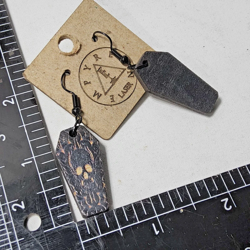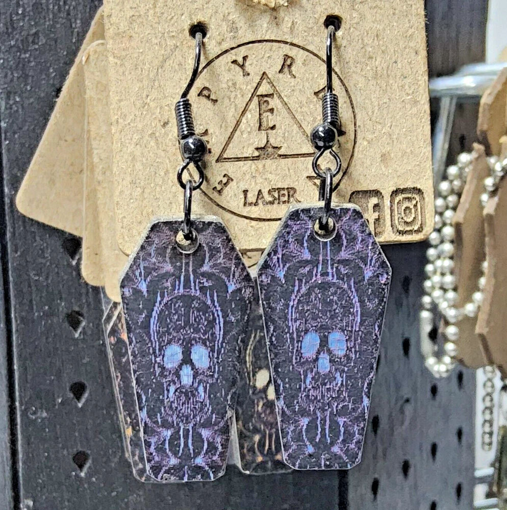 Laser engraved cut sugar skull themed earrings hallowen custom art horror fashion purple,cream, and black western coffin Made from one of my sugarskull coffin designs on laser cutter/engraver. No 2 are alike, so you will get slight variation from pics. Measures 1.5"h x .75"w x 1/4"d. Loaded with hypoallergenic metal ear hooks. Check out plenty of other lasered creations of mine in shop. Order a few pieces and I'll give you a bundled art deal. Not doing customs at the moment but may be persuaded to fire up the laser for right project. Ebay reselling keeps me busy. Message me to find out. Thanks again for visiting my Ebay shop. ***Treasure Suite offers you many pieces of my art prints now*** ###This section is for laser cut sublimation prints of my digital art. Measurements vary by piece. ### *Welcome to my unique collection of digital art, where creativity meets craftsmanship! Each piece in this category features my original digital designs, heat pressed into vibrant sublimation prints on laser cut whiteboard material. Some are engraved then hand painted. These art pieces are not just decorations, they are collectibles that bring a touch of gothic, rock and roll, horror, pin-up, and lowbrow art into your space. *perfect for:* *man cave *castle *bungalow *abode *domicile *penthouse *flat *cabin *studio *boutique hotel *yacht *etc *These pieces make fantastic gifts for art enthusiasts and collectors alike. Who doesn't enjoy vibrant digital art of out of this world space huntresses, demon witches, cyberpunk vixen cyborgs, spooky mistresses, hearses, hotrods, and so on? ***May consider custom orders of laser cut or engraved items.***