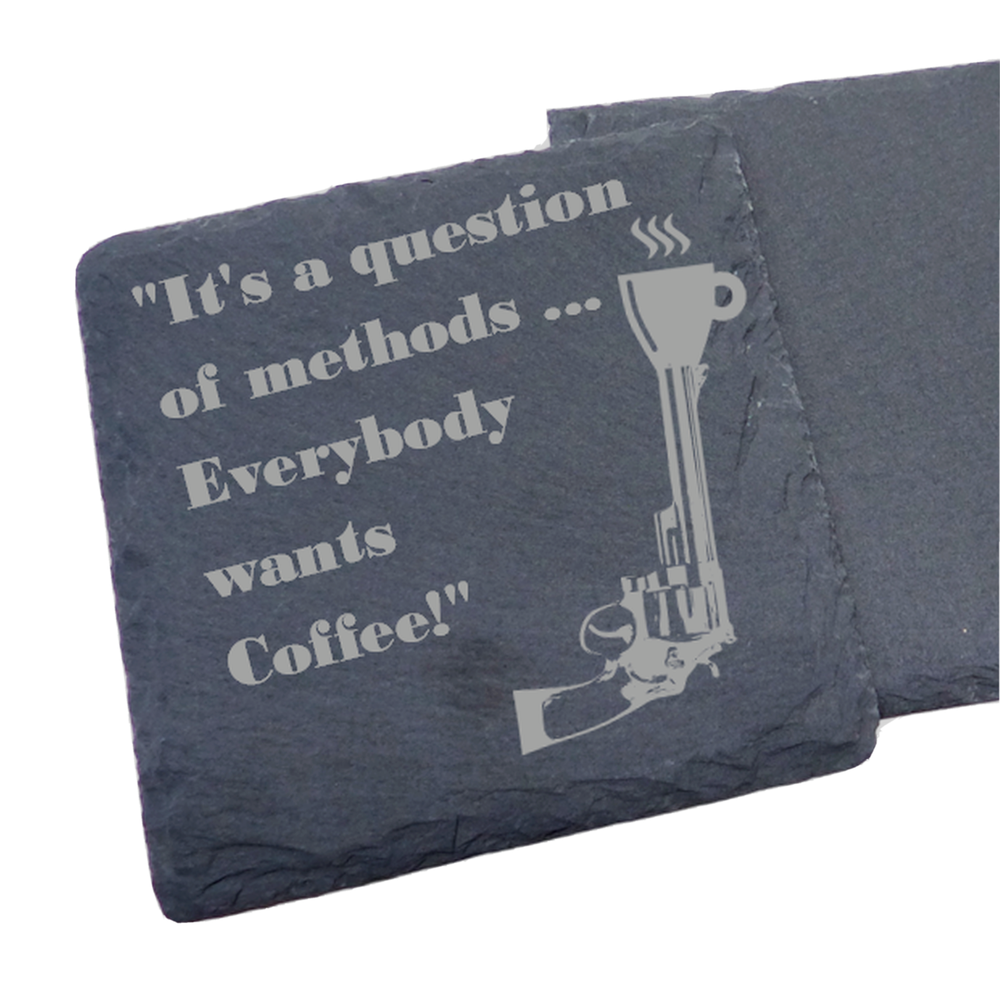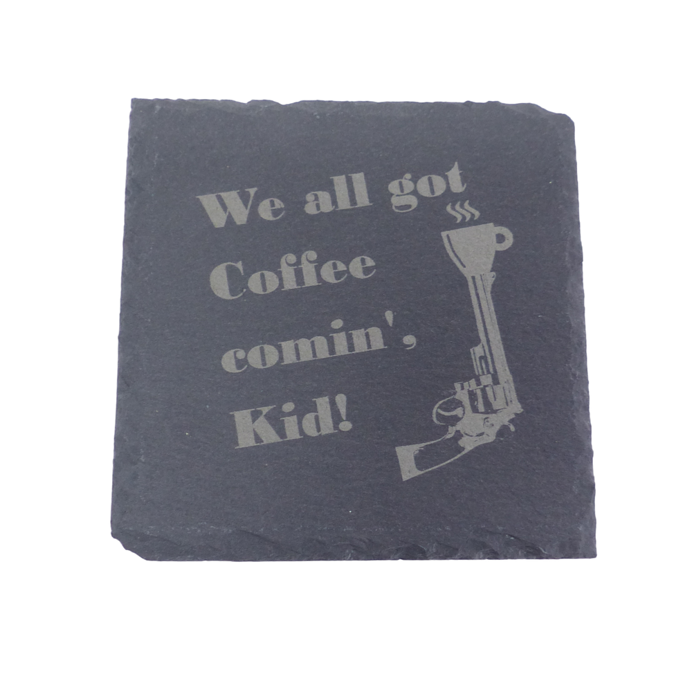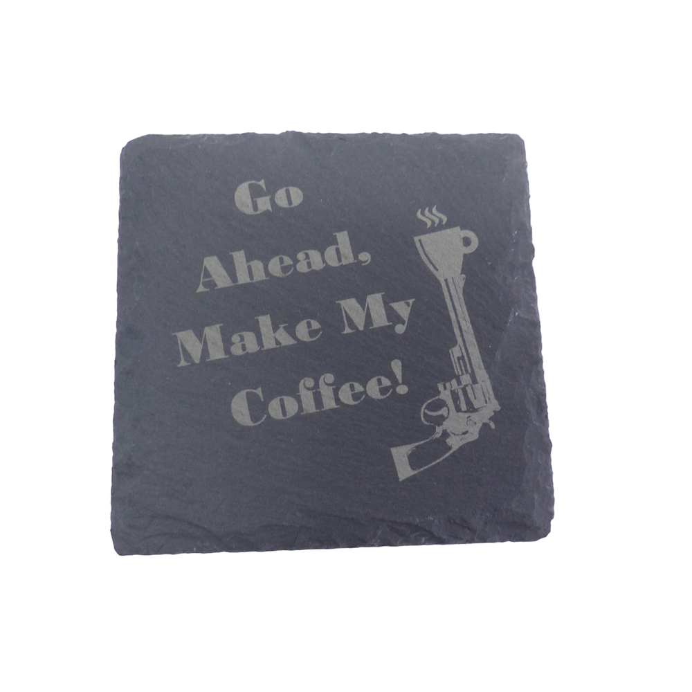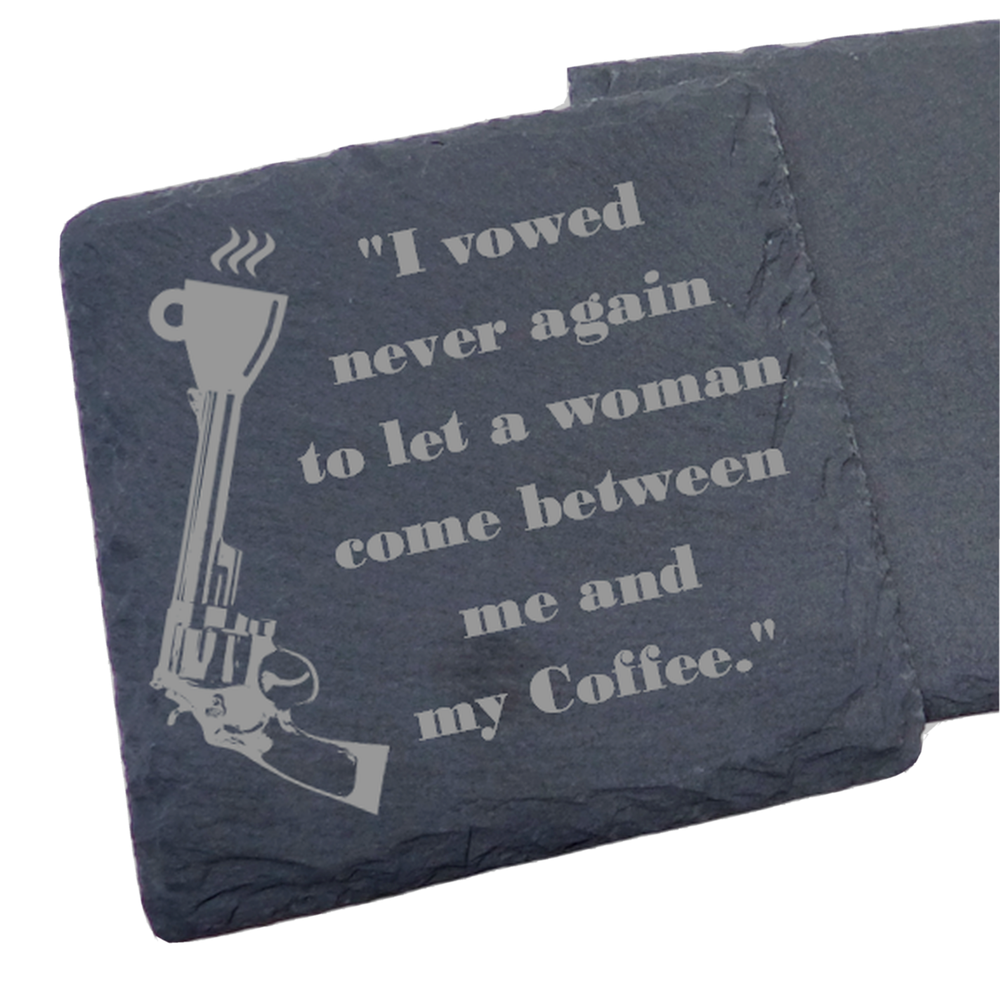 Great for the bar, mancave, or anywhere you'd like to make someone smile! Makes a great gift for fans of Dirty Harry, Josey Wales and other Clint Movies. ==================================================================== Collection of 4 Coasters Includes: "Go Ahead, Make My Coffee" "We All Got Coffee Comin' Kid" "I vowed to never again to let a woman come between me and my Coffee." "It's a question of methods. . . Everybody wants Coffee!" ======================================================================= The Thickness of coasters naturally vary from about 1/8" - 1/3" (3mm - 8mm). The edge of each coaster is unique and may differ slightly from the images shown due to imperfections in the stone, raw edges, etc. I do not treat coasters with a finish as that would reduce their natural absorbency. ======================================================================== We have round slate and cork versions of these coasters available as well - message us if you cannot find them. Some pictures in the listing are mock-ups, the actual coasters will be engraved when ordered. Designed & Laser Engraved by the Seller in the USA. ---------------------------------------------------- Thanks for Visiting the SolesEtc Store! ----------------------------------------------------