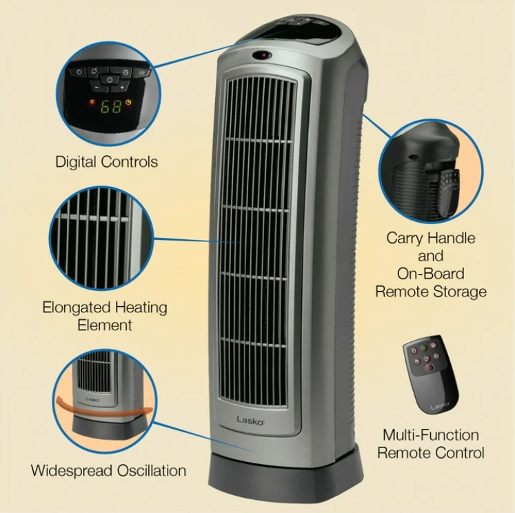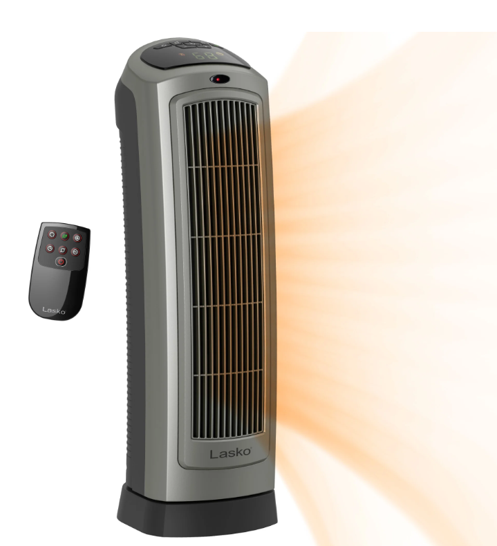 Product details The Lasko Ceramic Electric Tower Space Heater features 1500W of comforting warmth and an elongated heating element, which extends your comfort zone. Features easy-to-use electronic touch control operation, plus a multi-function remote control for convenience. This powerful space heater has two heat settings: high heat, low heat, plus an auto thermostat mode. The auto-off timer can be set for up to 8 hours. It has a convenient carry handle for room-to-room mobility and comes fully assembled. This dependable Lasko Tower Heater with digital display will be sure to keep you warm and toasty. This electric heater is ETL listed and Includes built-in safety features such as overheat protection, a cool-touch exterior and a safe ceramic element. 3-year limited warranty. Comes with a 6-foot power cord. For your safety, do not use space heaters with extension cords. For indoor use only. For indoor use only. Condition: New Provides 1500 watts of comforting warmth with an elongated heating element Features powerful air velocity to push heat throughout the room Simple electronic controls with an easy to read digital display Two heat settings: high heat, low heat 8-hour auto-off timer Widespread oscillation for full room coverage Adjustable thermostat maintains preferred temperature setting Molded carry handle for easy portability from room to room Comes fully assembled Built-in safety features include overheat protection, a cool-touch exterior and a safe ceramic element