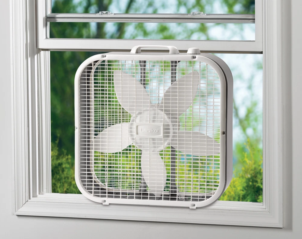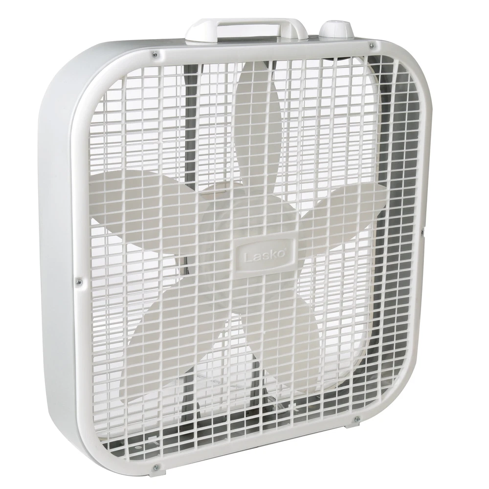 The Classic Lasko 20" Box Fan creates efficient airflow to keep your home or work space cool and comfortable and helps to dry out dampness. Everyone needs a great basic, and this box fan is just that. Features 3 quiet fan speeds, top-mounted controls for easy operation, built-in handle for portability, and a durable metal frame. The front grill and fan blades are removable for easy maintenance to maximize efficiency. This box fan also features a weather-resistant motor for worry-free indoor window use. No tools are required for set-up or maintenance, adding even more convenience. Condition: New This Lasko 20" fan has 3 quiet speeds Easy-carry handle makes it convenient to move from room to room Steel body frame Top-mounted controls Weather-resistant motor Patented Blue Plug safety fuse technology 21.5" L x 4.44" W x 22.56" H Cord length: 72" White box fan requires no tools for setup Front grill and blades can be removed for easy and convenient cleaning ETL listed Weight of unit: 7.5 lbs Condition: New