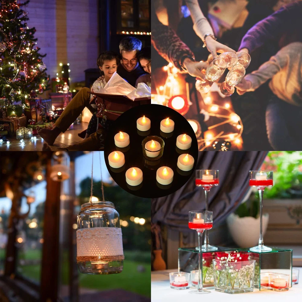 PREMIUM QUALITY AND DURABLE BATTERY TEA LIGHTS: The Battery Operated Tea Lights are made from the best quality materials. They come with batteries included and last a long time with their flashing light being very realistic. They can be used as decor for many occasions and places. 1. Safe for usage in any setting or occasion because these Flameless LED Tealights doesn't have an open flame and it doesn't heat up during usage. 2. These electronic tea light can also be given away as gifts or party favors. They are easily portable and can be used for a long period of time without having to change the battery. 3. The Warm Yellow Tea light Candle is designed to flash in a realistic way so that can feel the ambience of an actual candle flame without any hazard or hassles. 4. Very easy to use, these Fake candles can be turned on and off by the flick of a switch. Specification: 1. Material: LED+PP. 2. Size: Diameter 3.8cm/1.5inch+ Height 3.6cm/1.4inch. 3. Battery: CR2032 button cell. 4. Battery life: 100+hours. 5. Light color: warm yellow. 6. Appearance color: white. OCCASIONS --- Wedding, Halloween, Thanksgiving Day --- Holiday party, home decoration, restaurants, schools, bar. --- Fit any standard size votive or tealight holder. --- Illuminate a fireplace mantel or bookshelf loft with a bunch of candles. --- Put in jars or glasses as luminaries for Christmas. --- Decorate a candle light dinners with your loved . Package include: 50 X LED tea light Candles. NOTE: If you are not using led tea candle lights for a long time, please switch off the button at the bottom and remove the battery to save battery life. If the light of individual candles becomes dim, you can press the battery cover to make the light brighter. A package of 50 standard size (1.5 x 1.4 inch) tea light candles with batteries included, easy to use. It can be widely applied to Birthday, Halloween, Christmas, Home decorations, Bars, Hotel, Parties, Holidays, Wedding, or other occasions. It's so classic and romantic. Long-life LED lamps powered by a single CR2032 replaceable button unit (included), estimated to last more than 100 hours. These candles are flameless and smokeless, absolutely no fire hazard or burning risk, safe family with pets or toddlers. LED tea light candles provide lifelike flashing effects, ideal features decorated.