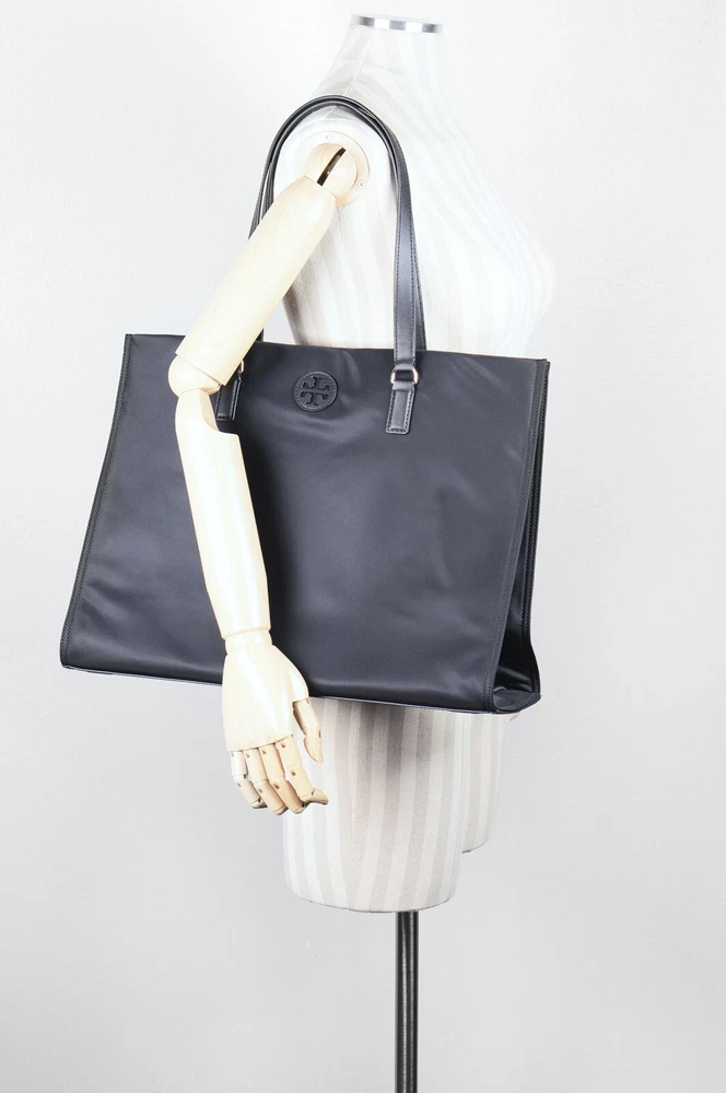 1 ITEM BRAND: Tory Burch COLLECTION: Ella DESCRIPTION: Large Nylon Tote STYLE NUMBER: 136144 COLOR: Black RETAIL/MSRP: $258 DETAIL & FITS MATERIAL: Nylon (high quality; thicker), black leather detail HARDWARE: Gold tone stainless steel, polished finish HOLDS: Features a large capacity interior that can easily accommodate all of your everyday essentials CLOSURE: Magnetic snaps closure; 2 gusset snaps TOP HANDLE: Leather handles with 9.25" (23.5 cm) drop. EXTERIOR: Logo leather patch on front, embossed T logo leather bottom INTERIOR: Large capacity, logo leather patch, black logo jacquard lining, 1 front slip pocket, 1 back zipper pocket SIZE: Length: 16.75" (42.5 cm) Height: 12.5" (31.8 cm) Depth: 6" (15.2 cm) at the bottom All measurements were taken by hand and are approximate; slight variations may occur. PAYMENT Payment must be made within 7 days after auction ends. Credit card payment accepted at eBay check out. RETURN POLICY If you are not satisfied with the purchase and considering to leave us anything rather than positive feedback and 5 star rating, please give us the opportunity to assist you for your satisfaction. Return merchandise must be in the same condition as you received, in original packaging and all the tags must be attached to the item, and in re-saleable condition. Used, worn, or altered merchandise cannot be returned. SHIPPING Your order will be processed in one business day once payment is cleared by eBay. Tracking number of the package will be uploaded to eBay when it is available. USA: Three shipping options provided: $6.95 USPS with delivery confirmation (3~5 business days, no insurance option). $9.99 USPS Priority Mail with signature confirmation & insurance (2~3 business days). $49.99 USPS Express Mail (1~2 business days, with signature confirmation, includes insurance). Combine shipping: $4.99 for each additional item INTERNATIONAL: Please click on the tab "Shipping and payments" (next to the Description tab) to see estimated international shipping cost and duty charges. Item will be shipped through eBay Global Shipping Program. The Global Shipping Program makes it easier for buyers in some countries outside the US. We ship the item to eBay's global shipping provider, and the global shipping provider ships the item to buyers. 100% brand new and authenticity guaranteed or your money back. Our Guarantee All of our brand new items are purchased from the brand/authorized dealers directly. If you have any doubts regarding the authenticity of your purchase, please feel free to have the item authenticated by one of the many reputable online authentication services. If the item is found not to be authentic, we will refund your full purchase price, pay to ship the item back, and reimburse you for the authentication fee.
