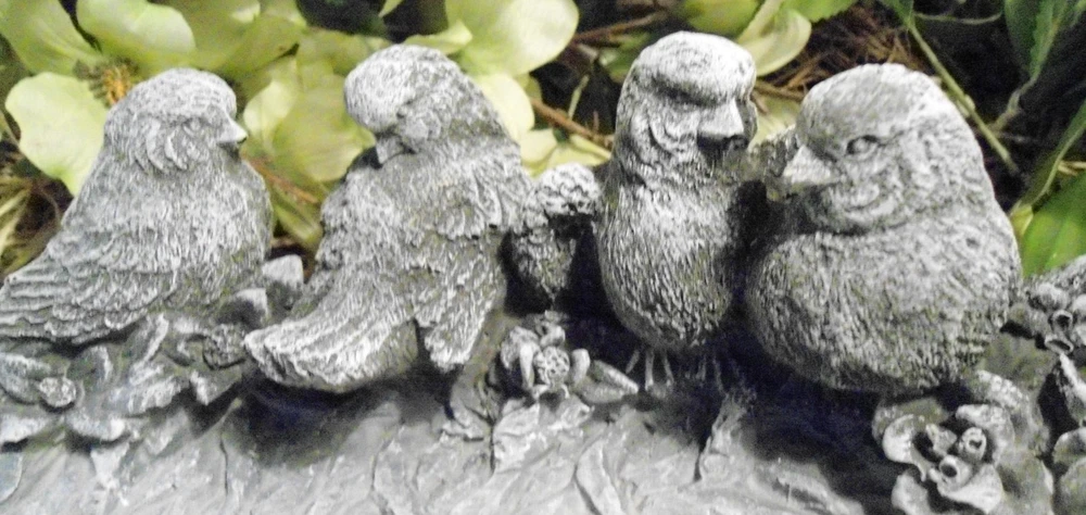 NEW latex /plastic backup 4 birds small birdbath mold plaster concrete. Special order mold takes 10 days to make from date of payment This is a NEW latex with plastic backup mold … Elegant bird birdbath / bird feeder mold works great with a plastic backup..makes a birdbath that measures apx 9"W x 7"D x 3.5"H.Too cute to pass up! Will cast 100 and more times!