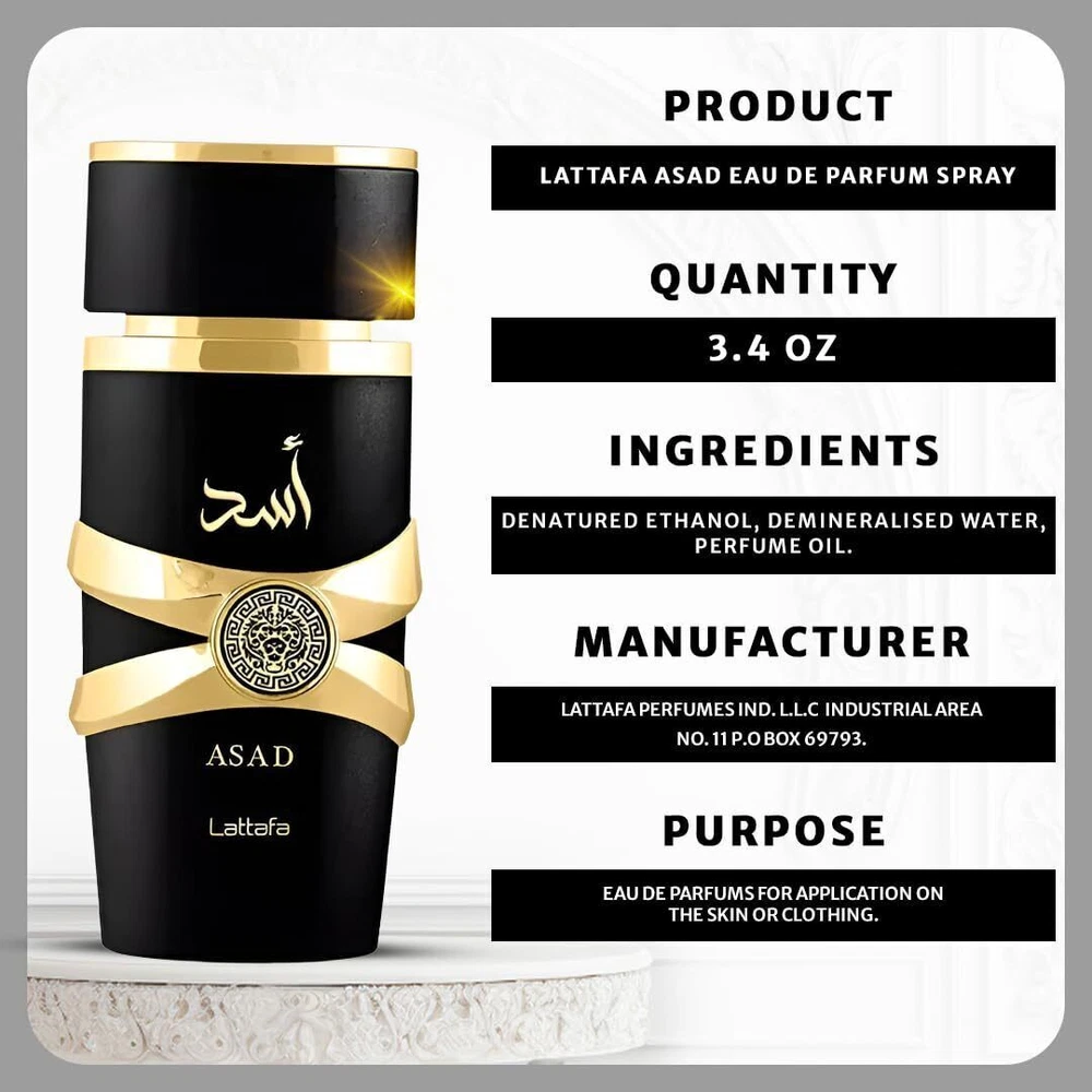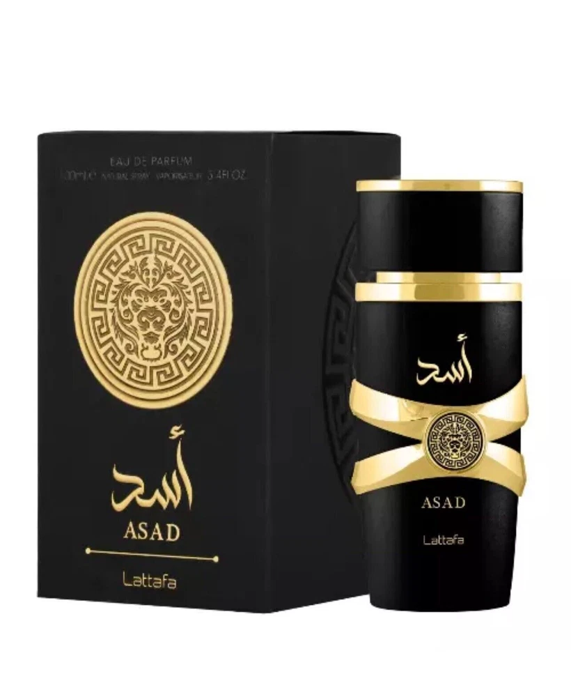Lattafa Perfumes Asad Eau de Parfum for Unisex is a bold and captivating fragrance with a rich vanilla base, designed for those who enjoy warm and sophisticated scents. This 3.4-ounce spray offers a long-lasting scent, making it ideal for daily wear or special occasions. The fragrance opens with an intriguing mix of spicy and fruity top notes, featuring Black Pepper, Pineapple, and a touch of smoky Tobacco. The heart introduces a deep and aromatic blend of Coffee, earthy Patchouli, and powdery Iris, adding complexity and warmth. The scent finishes with a creamy and resinous base of Amber, Vanilla, Dry Woods, Benzoin, and Labdanum, leaving a memorable and comforting trail. Notes: Top: Black Pepper, Pineapple, Tobacco Middle: Coffee, Patchouli, Iris Base: Amber, Vanilla, Dry Woods, Benzoin, Labdanum
