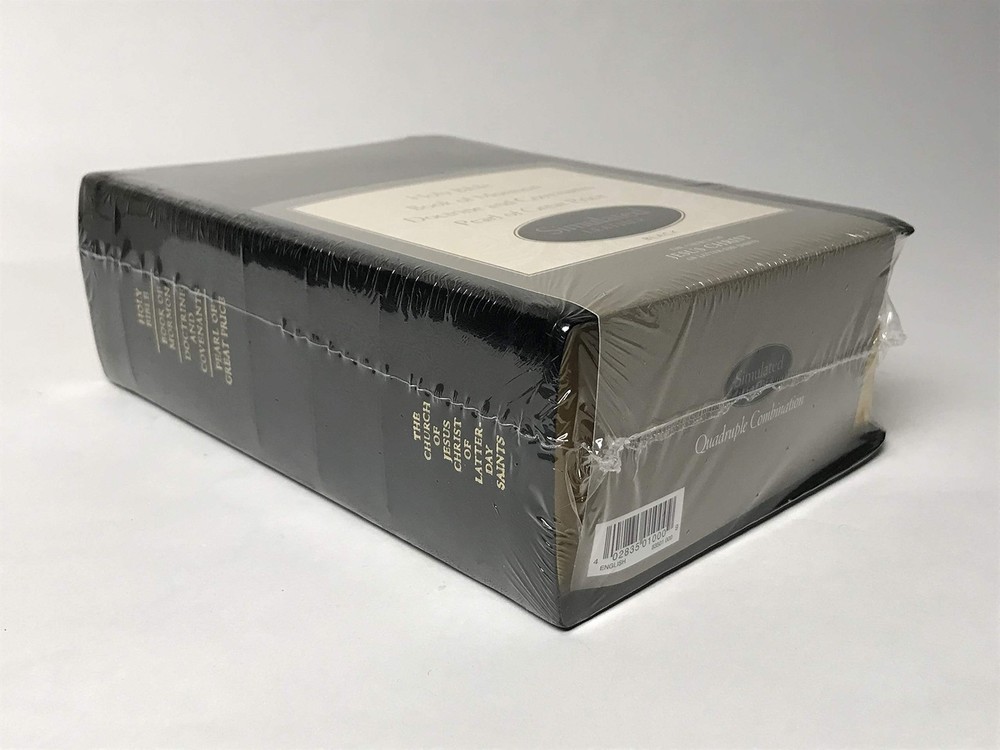 2013 - 2021 THUMB INDEXED REGULAR-SIZE 5 1/4" x 7 1/4" BLACK Simulated Leather cover edition, on lightweight acid-free paper, gilded page edges, and ribbon markers. Includes the LDS edition of the King James Bible, the Book of Mormon, the Doctrine and Covenants, and the Pearl of Great Price. This Quad Edition contains all of the new 2013 scripture study aids and continues to be printed in 2021. It contains cross-references to all of the standard works, the Topical Guide, the Bible Dictionary, an index to the triple combination, two sections of maps and pictures, and footnote references to the Joseph Smith Translation. This edition is in "blue'. New. Wrapped in shrink wrap!!