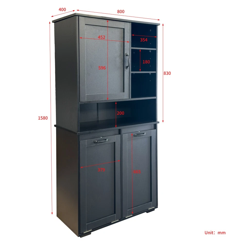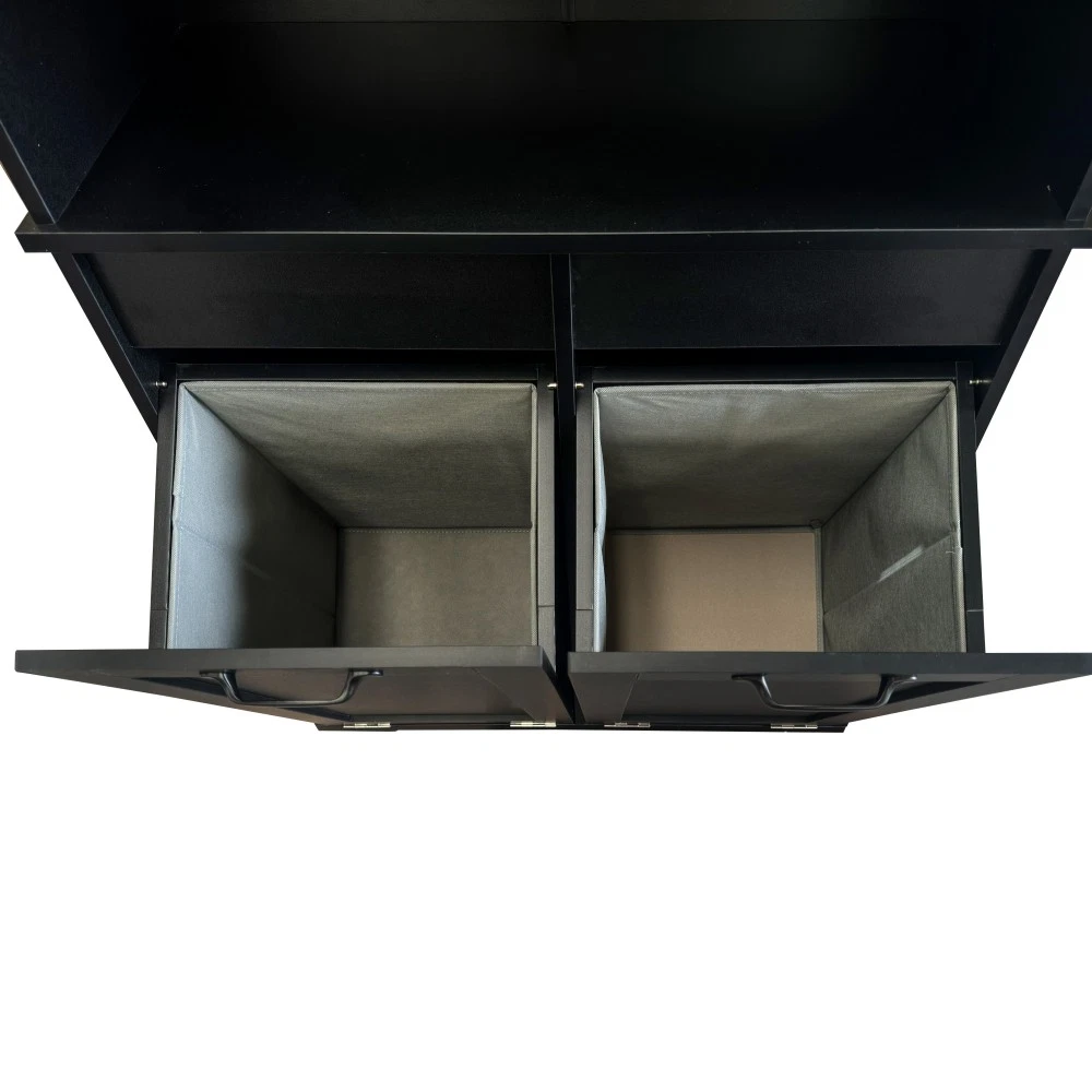 Key Specifications Assembled Dimensions: 31.50” L x 15.75” W x 63.00” H Product Weight: 108.03 lbs Color: Black Material: 15mm Particle Board + 3mm MDF Backboard (Melamine Finish) Premium Storage & Versatile Design Maximize your storage potential with a well-structured layout tailored to daily needs: Ample Storage Space : Features four-layer open shelves for displaying decorations, storing laundry detergents, fabric softeners, or daily necessities. The left cabinet door encloses two additional storage shelves, keeping private items neatly concealed. Two tilt-out laundry hampers offer dedicated space for dirty clothes, towels, bath towels, or linens, preventing dust buildup and keeping your space neat. Adjustable Shelves : The right open shelves and the inner shelves of the left cabinet are adjustable, while other shelves remain fixed. This flexible design accommodates items of different sizes—from tall bottles to small boxes—meeting all your varied storage demands. Tilt-Out Hampers : The two tilt-out baskets feature a space-saving design that’s easy to access. Simply tilt the front panel to place or retrieve items, and the closed design keeps odors and dust at bay, maintaining a clean laundry room. Durable Construction Crafted from high-quality 15mm particle board with a 3mm MDF backboard, this laundry cabinet boasts a sturdy wooden structure. The melamine finish not only enhances durability but also ensures easy maintenance—just wipe clean with a damp cloth to keep it looking like new for years to come. Warranty & Return Policy Shop with confidence! This laundry cabinet comes with a 1-Year Manufacturer’s Warranty , covering any defects in materials or craftsmanship. We also offer a 30-Day Free Return Policy —if you’re not completely satisfied with your purchase, you can return it for a full refund within 30 days of receipt, no questions asked. Important Notes Due to lighting effects and monitor differences, the actual color of the product may slightly differ from the image shown. This is a normal phenomenon and not a quality issue. For logistics reasons, the product may be shipped in two separate packages, which may arrive at different times. We appreciate your understanding and patience. Transform your cluttered laundry space into an organized haven with this practical and stylish laundry cabinet. Add it to your cart today and enjoy a tidier home!