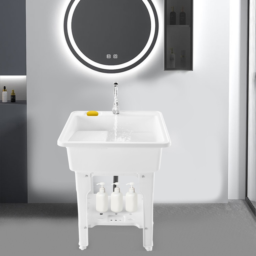 Mounting: Freestanding Sink Mount Type: Freestanding Sink Type: Other Item Length: Does not apply Faucet Included: Yes Style: Modern Brand: Does not apply Kit: Yes Inner Bowl Front-to-Back Length: as pictures shown Item Width: Does not apply Faucet Opening: Single Hole Supply line length (in): 12 Shape: Rectangular Side Sprayer Included: Yes ★Features★: ★★★Reliable Quality★★★Easy installation★★★Ideal Gift★★★ Color Family: White Room: Any Room, Basement, Bathroom, Bedroom, Caravan, Garage, Dining Room, Kitchen Legs Included: Yes Color: White ❤Highlights❤: ❤Premium Material❤Long Service Life❤Creative Design❤ Bowl Shape: as pictures shown 🔥Feature🔥: 🔥High Performance🔥High Safety🔥Good Stability🔥 Rust Resistant: Yes Water Leakage Device: Flip Type * Feature *: *Durable Material*Beautiful Appearance*Good Performance* Faucet Handle Type: Lever Color/Finish: White Installation Method: Freestanding Material: pp Item Height: Does not apply 1.Feature: Convenient Use, High-quality Type: Freestanding Plastic Laundry Sink Inner Bowl Side-to-Side Width: as pictures shown Sink capacity (gallons): 20