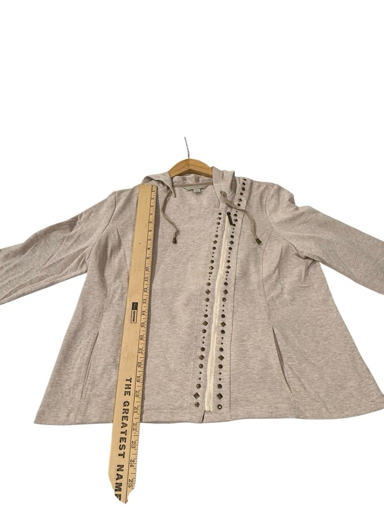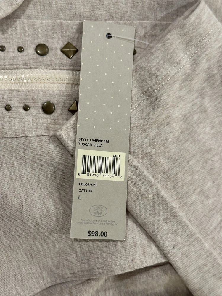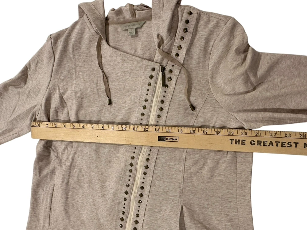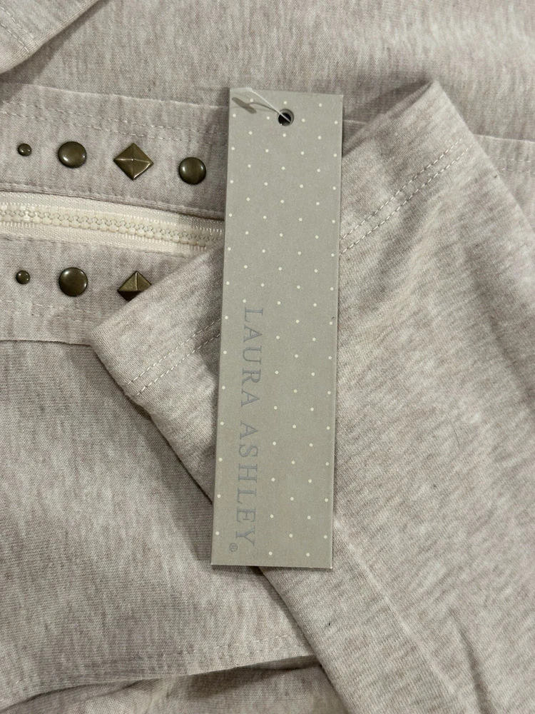 Elevate your wardrobe with this stylish and cozy cardigan from Laura Ashley. Featuring a side zip and studded accents, this beige-colored sweater is perfect for any casual occasion. The hooded design adds an extra layer of warmth and protection from the elements, while the cotton blend material ensures comfort and durability. This item is new with tags. Measurements are included in pictures. Please inspect pictures to make sure they are up to your standards and reach out with any questions.