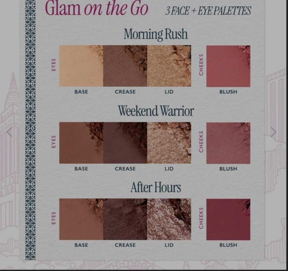 Laura Geller Glam On The Go Face & Eye Palette/Blush/Neutral Shade 3 Palatte NIB Perfect For Hooded Eyes Night Out Gifting Mature Skin The glamorous looks are non-stop with this trio of bite-sized palettes! ncludes three compact palettes with eyeshadows and blushes Expertly curated colors for a flawless look on any skin tone Stamped with easy-to-follow instructions Each palette comes individually boxed--take one with you, then gift another to your favorite Gelle