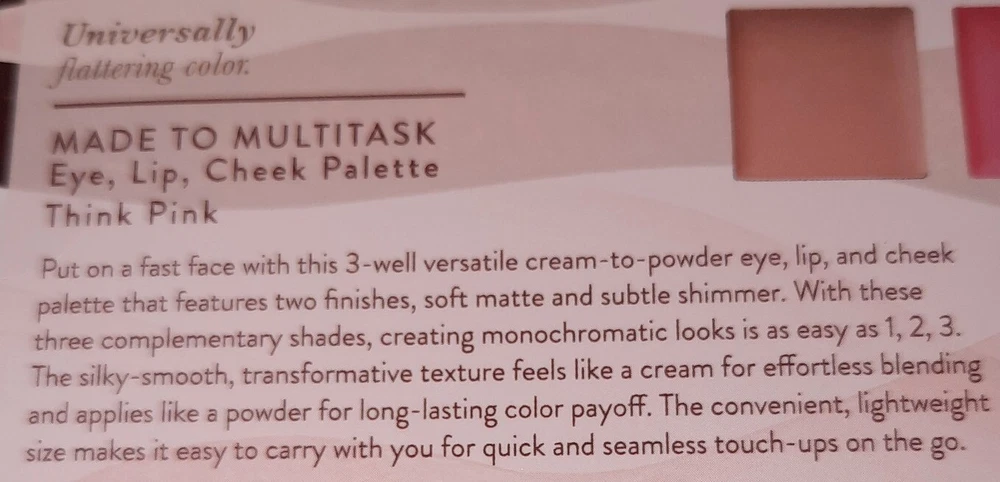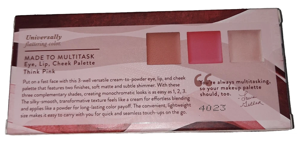 For your consideration here we have new in sealed box, a Laura Geller Made to Multitask Eye Lip Cheek Palette in THINK PINK. Put on a fast face with this 3-well versatile cream-to-powder eye, lip, and cheek palette that features two finishes, demi-matte and subtle shimmer. With these three complementary shades, creating monochromatic looks is as easy as 1, 2, 3. The silky-smooth, transformative texture feels like a cream for effortless blending and applies like a powder for long-lasting color payoff. The convenient, lightweight size makes it easy to carry with you for quick and seamless touch-ups on the go. See my other listings for more great merch! New items listed almost every day! Everything ships fast and free! See all photos and item specifics for more details and measurements if applicable. Measurements are approximate. From a clean, smoke and animal free, temperature controlled environment. All sales are final, no returns or cancelations are accepted. Fast and free shipping for contiguous 48 U.S. states only. No international shipping. I do not accept or send offers. Please ask questions should you have any. Thank you. 🙂 No A I was used to make this listing! 😉