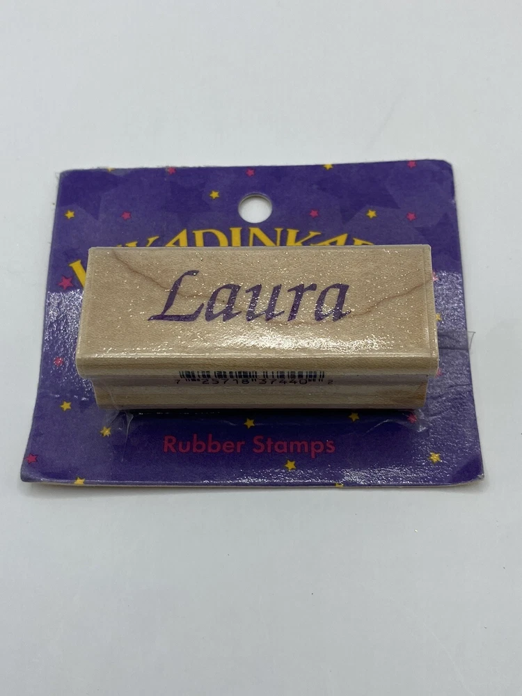 This is a personalized calligraphy rubber stamp made by Inkadinkado. The stamp is mounted on a wood block and features the name "Laura" in a beautiful font. It is a type of mounted stamp and is made of rubber. The stamp is a model number 7440 and is designed with the theme of words and phrases. It is manufactured in the United States.