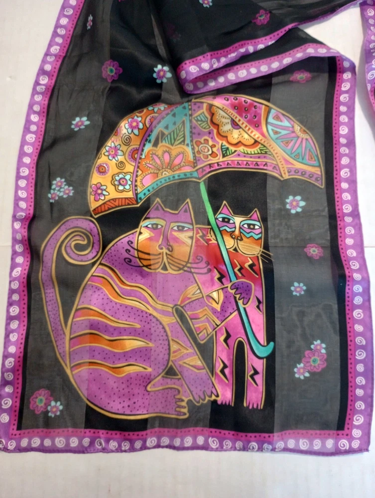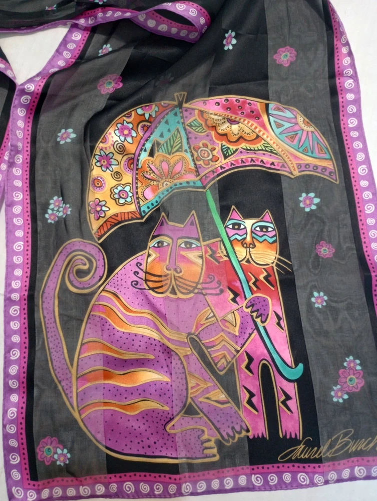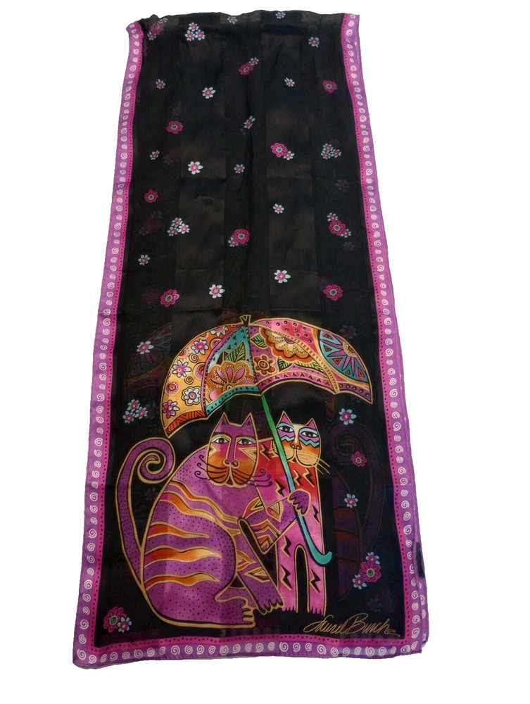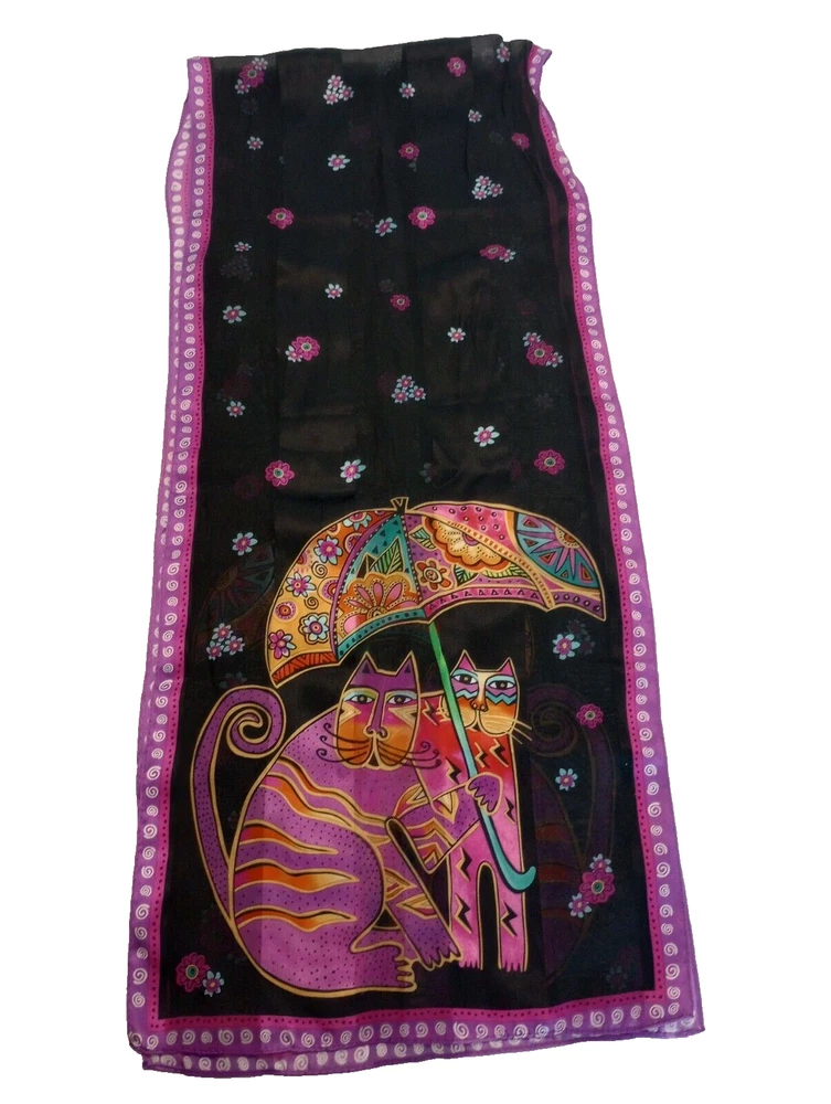 Laurel Burch Cats with Umbrella Silk Scarf 27" X 11"