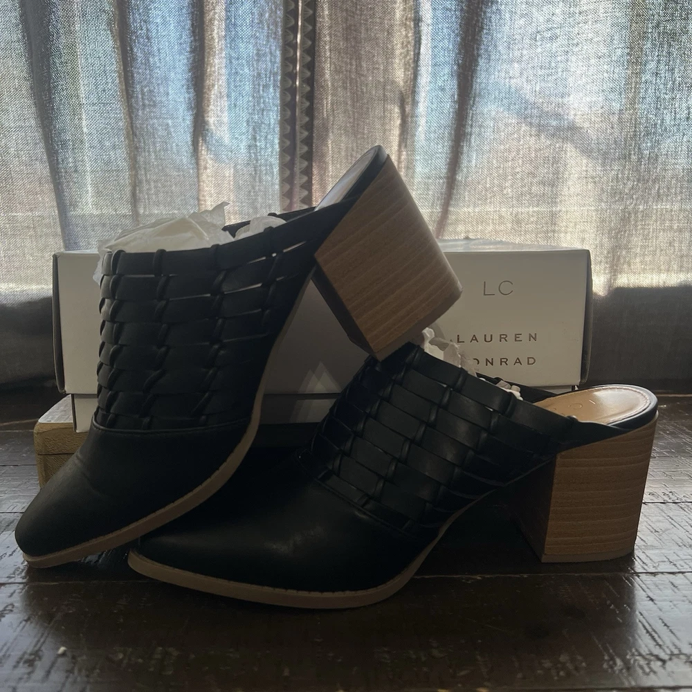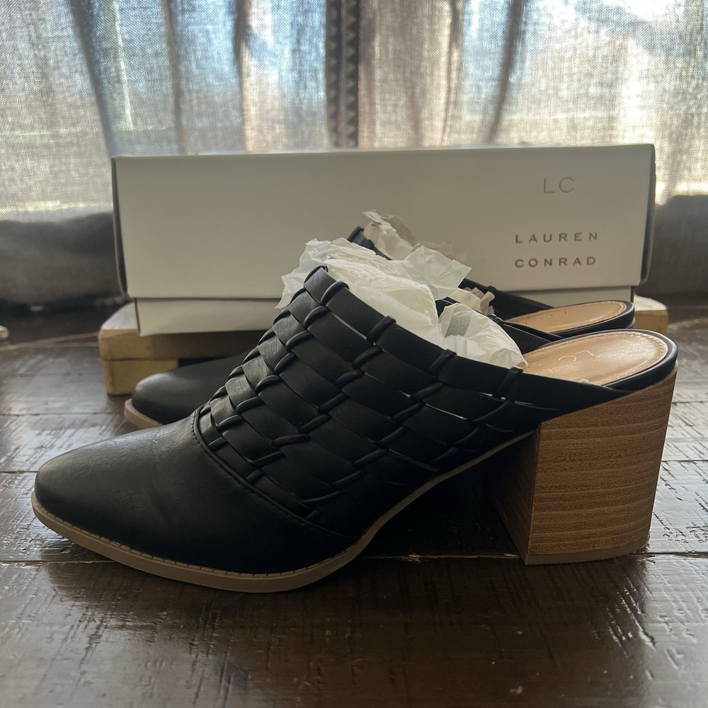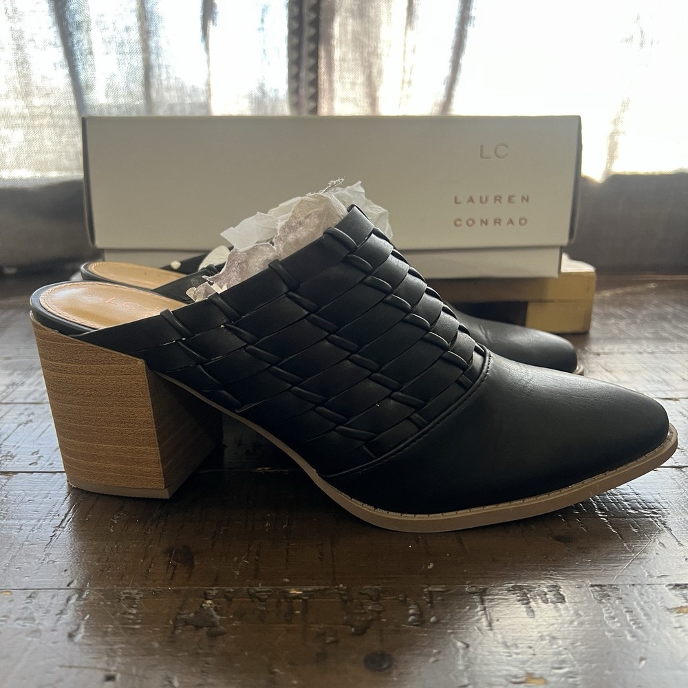 Elevate your style with these chic LC Lauren Conrad River Birch mules. The sleek black color and woven pattern make them perfect for any occasion, whether it's a formal event or a casual day out. The slip-on style and pointed toe create a sleek and sophisticated silhouette, while the mid-height block heel provides comfortable wear throughout the day. These mules feature a cushioned insole and padded lining for added comfort, and the breathable TPR outsole ensures a sturdy grip on any surface.