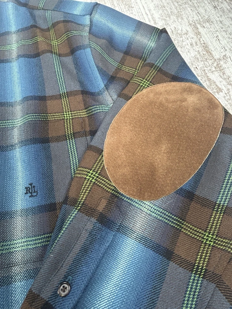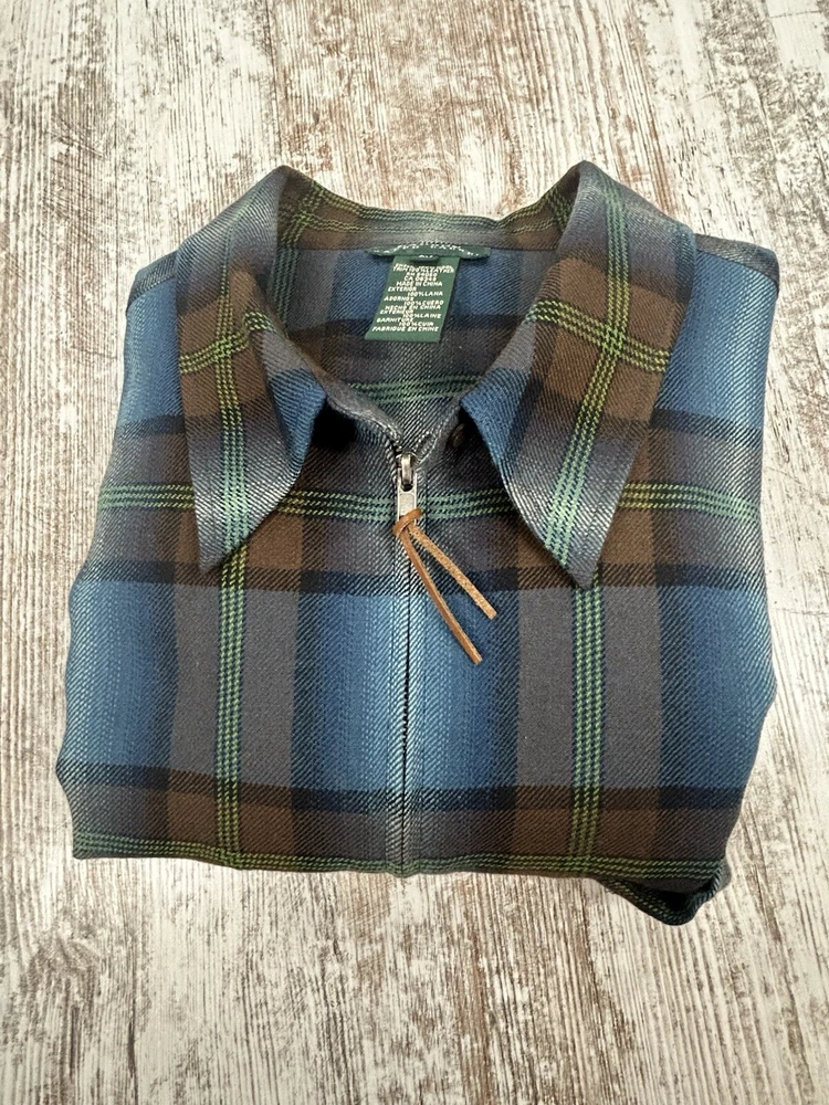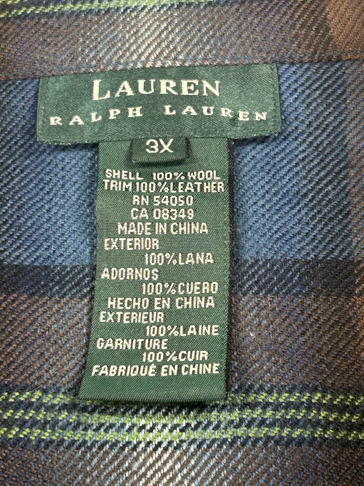 Elevate your wardrobe with this Lauren Ralph Lauren plaid shirt jacket. The tweed fabric and full zip make it a versatile piece for any occasion, whether it's a casual day out or a business meeting. The shirt features a collared neckline, long sleeves, and pockets for added convenience. Crafted from a blend of wool and leather, this shirt jacket is durable and perfect for the colder seasons of fall, winter, and spring. The Aztec theme and multicolor design add a touch of style to your outfit. Available in size 3XL, this shirt jacket is part of the Lauren Ralph Lauren Overshirt product line.