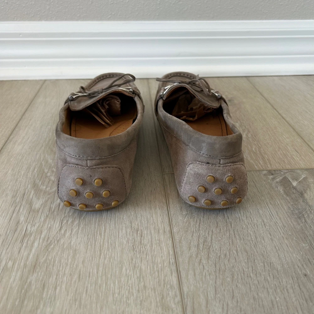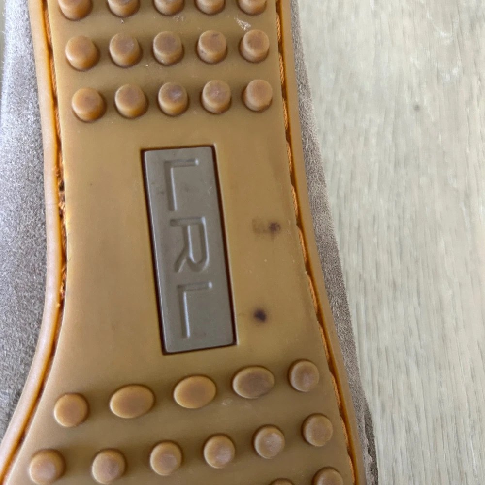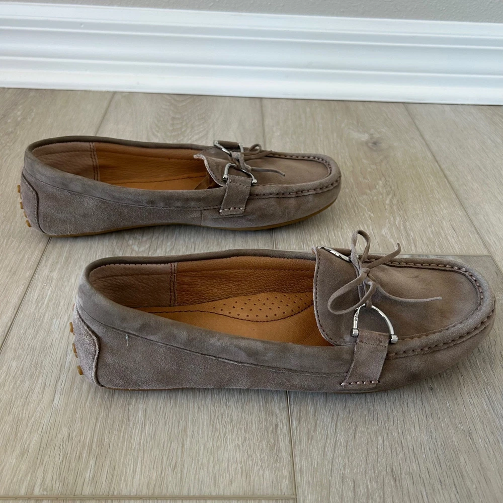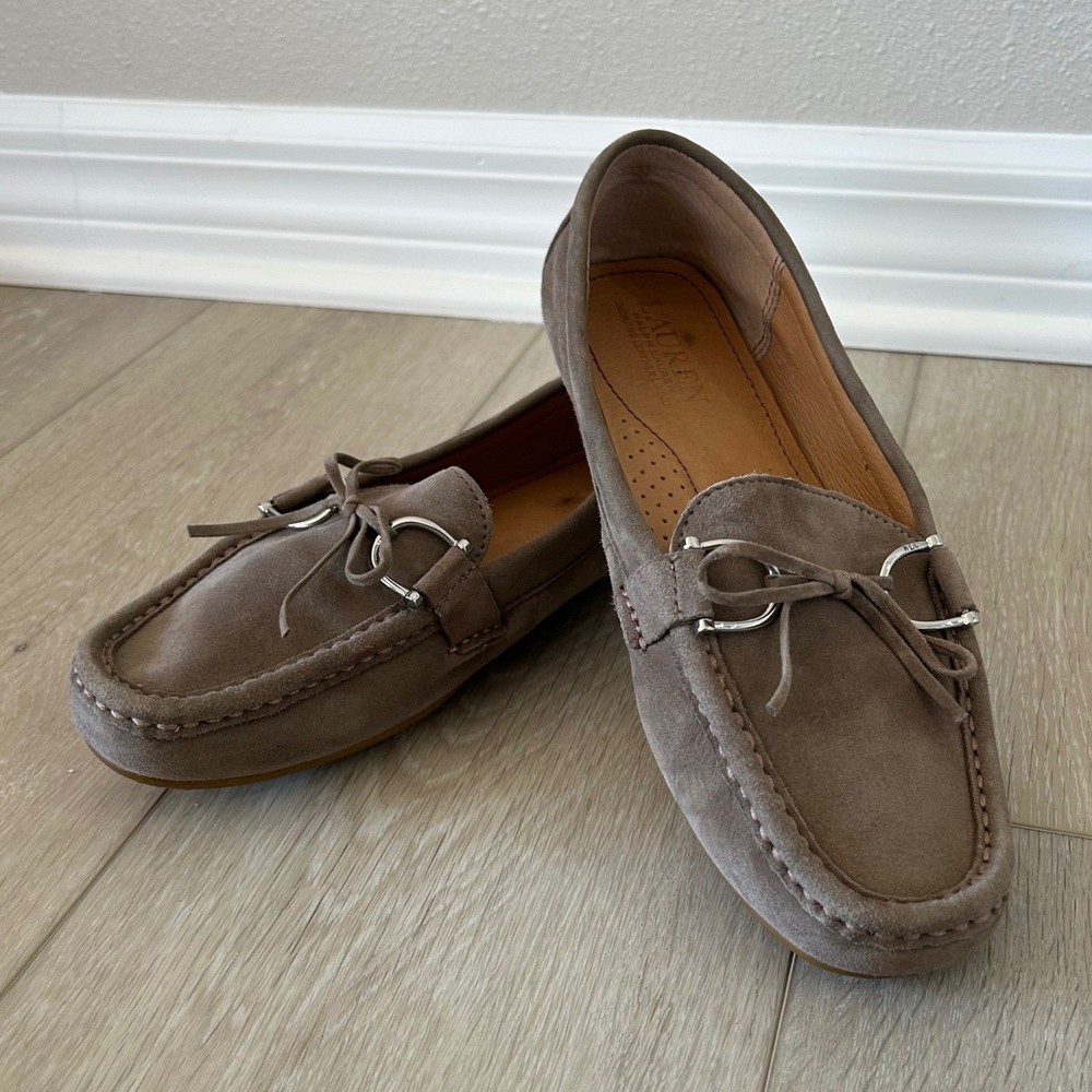Lauren Ralph Lauren Briley II driving loafers offer a sophisticated blend of comfort and classic style. Crafted from premium taupe suede with a full leather lining, these slip-on shoes feature a traditional moc-toe construction and a dainty bow detail accented by polished silver-tone hardware. The signature rubber nubbed outsole provides excellent grip and flexibility, making them an ideal choice for everyday wear or travel. **See pictures for minor wear and marking to insoles and bottom of right shoe** Brand: Lauren Ralph Lauren Model: Briley II Style: Driving Loafer, Moccasin Color: Taupe / Mushroom Material: 100% Leather Suede Upper Lining: 100% Leather Hardware: Silver-tone Toe Shape: Round Moc Toe Closure: Slip-on Accents: Bow, Metal Bit Sole: Rubber Pebble / Nubbed Keywords: Quiet Luxury, Preppy, Minimalist, Neutral, Coastal Grandmother, Office Wear, Travel Shoes, Classic, Suede Loafers, Moccasins, Designer, Workwear, Earth Tones, Slip On
