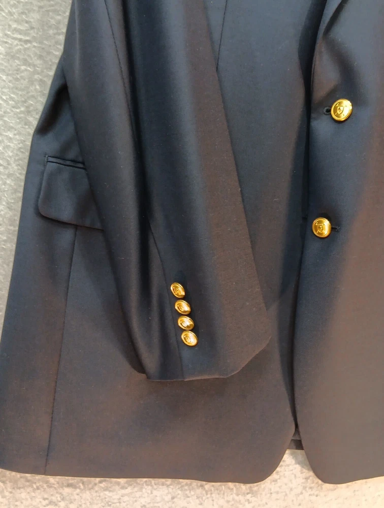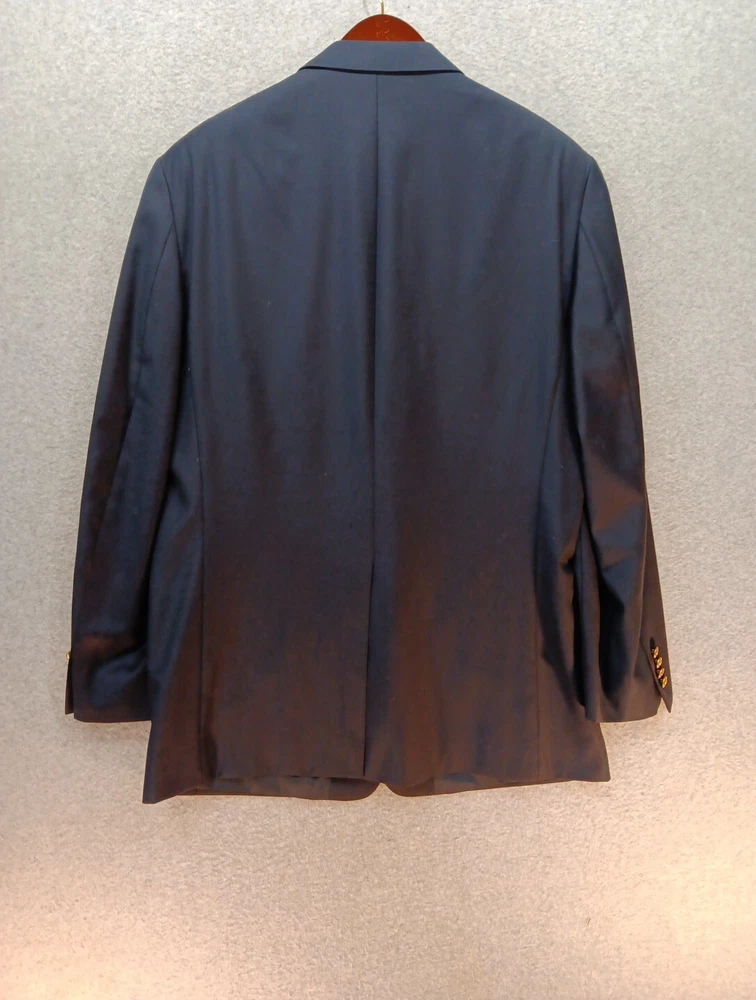 Elevate your formal attire with this Lauren Ralph Lauren blazer, perfect for any occasion. The navy blue wool fabric is complemented by a gold button closure and a notch lapel style. This classic fit blazer features a single-breasted cut, two-button front button style, and four-button sleeve button style. The blazer also includes inner pockets for convenient storage. Dry clean only. This blazer is perfect for the winter, summer, fall, and spring seasons and can be worn for travel, weddings, parties, or business meetings. The blazer is made in Indonesia and is available in a men's regular size 44L. Add this stylish blazer to your wardrobe today and elevate your fashion game.