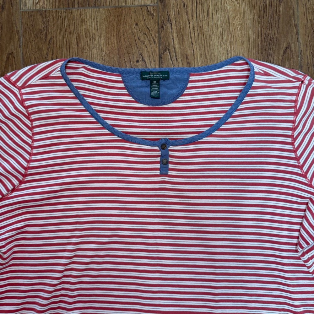 100% cotton. Excellent condition. Women's size 3X. Please see measurements in the photos to ensure correct fit. Shipping same day or next business day ALWAYS. Smoke free home. If you have any questions at all, do not hesitate to ask! *SKU 105* Y2K Lauren Ralph Lauren blouse henley top stripes summer comfort boho bohemian indie hippie classic luxury everyday wear casual nautical contrast trim