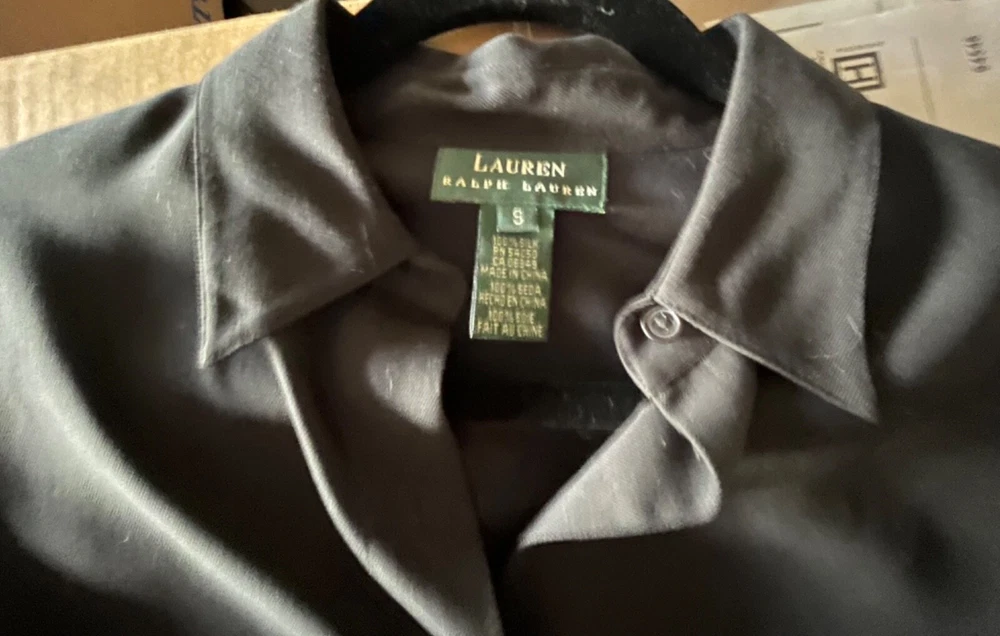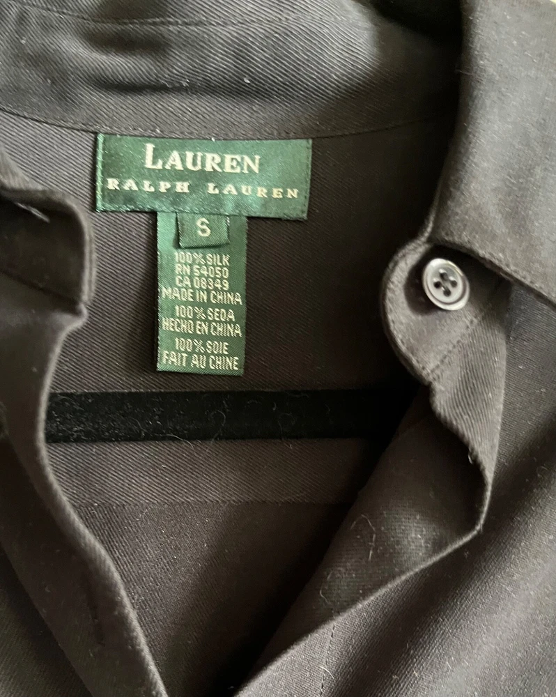 Lauren Ralph Lauren black somewhat heavy silk blouse marked small. Two way sleeves, one with roll tab. Collared and longer than most. Measures over 30 long and upper back shoulder to shoulder seams about 17. Sleeves when down 23. Across the chest when buttoned and flat almost 20 and the same across the bottom in front from 4 inch side splits. No pockets and appears very gently enjoyed.