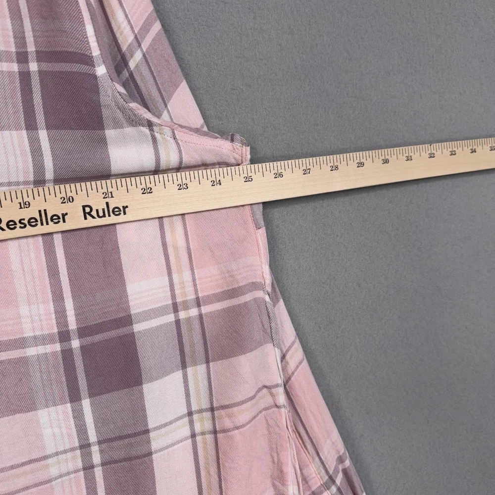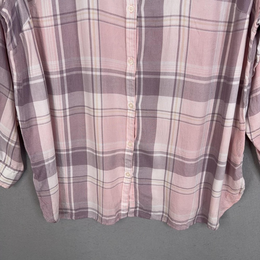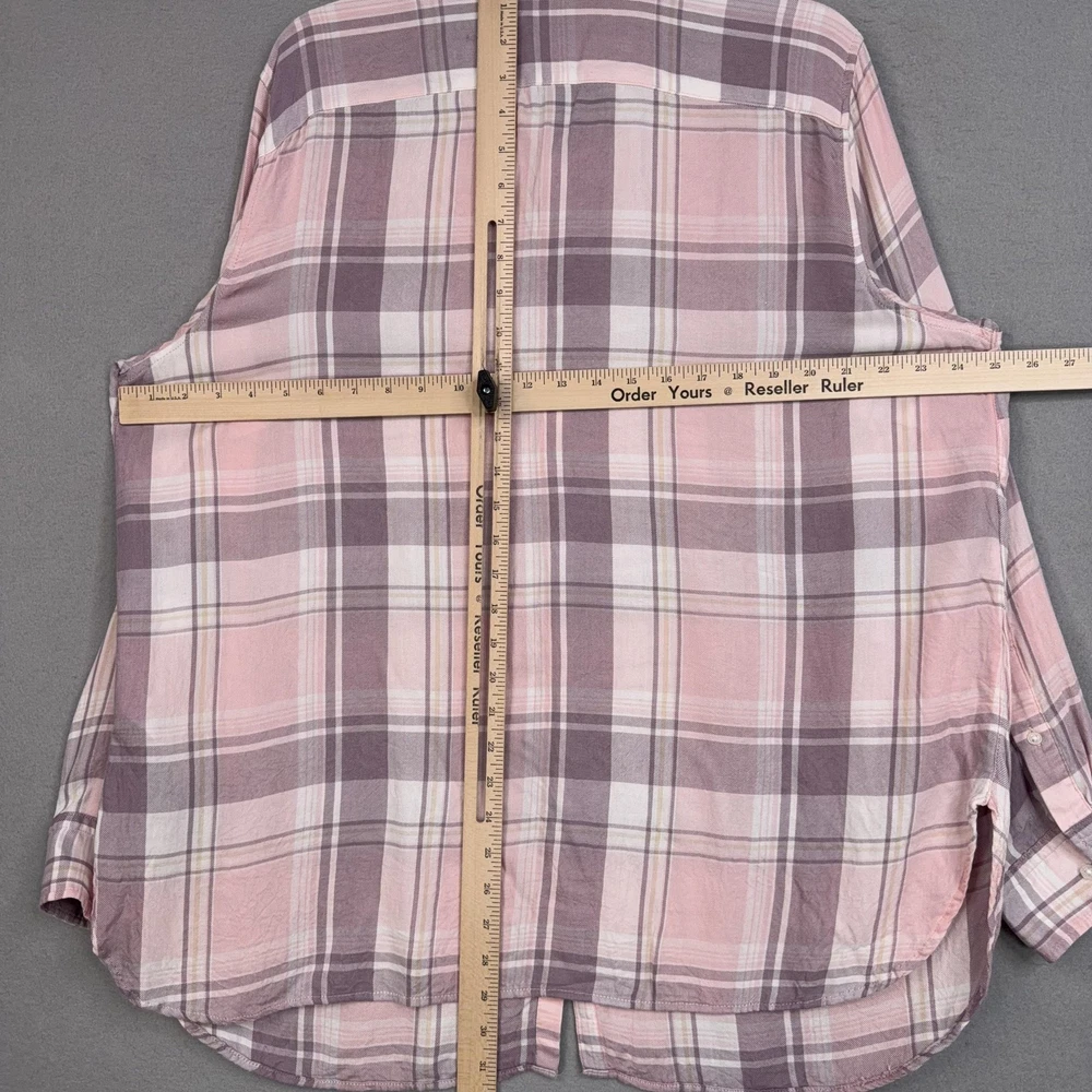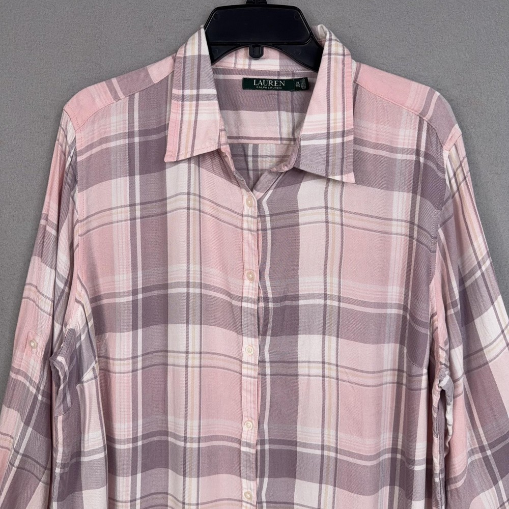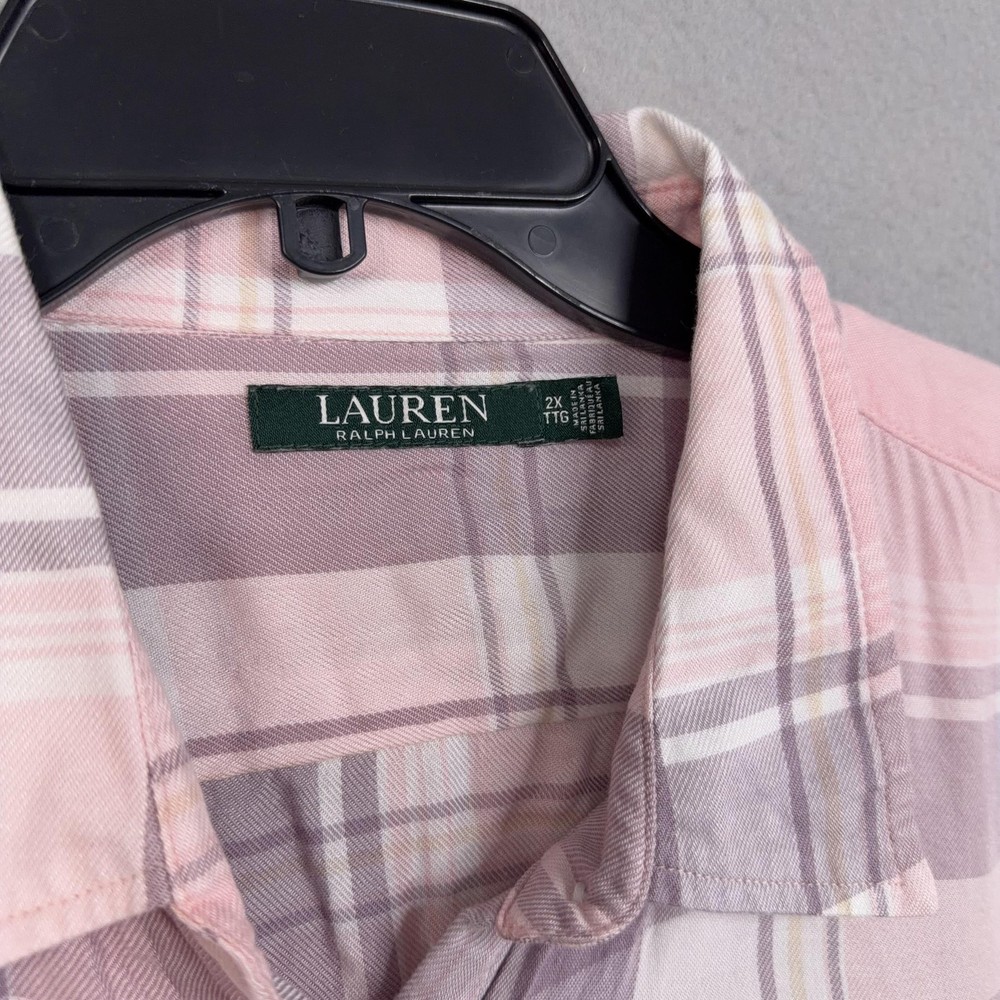 Lauren Ralph Lauren Button Up Shirt Womens 2X Pink Plaid Tunic Viscose Top Pre-owned shirt with light overall wear from previous use and laundering. Viscose fabric, seams, and collar are clean and intact with no holes or stains, and all buttons are secure and functional. Fabric shows light wrinkles from normal storage and handling. Brand: Lauren Ralph Lauren. Style: Womens long sleeve button-up tunic shirt with a relaxed, easy fit and roll-tab sleeves. Color: Soft pink and mauve plaid pattern with white and taupe accents. Size on tag: Womens 2X. Material: 100% viscose woven fabric with a lightweight, soft flannel feel. Features: Collared neckline, full front button closure, long sleeves with button roll tabs, back yoke detail, curved high-low shirttail hem, and small side slits at the hem. Care: Refer to the interior care label for complete washing and drying instructions. Tag details: Inner neck label reads LAUREN RALPH LAUREN with size 2X/TTG, and interior side label lists 100% viscose, made in Sri Lanka, and multilingual fabric content and care information. Additional info: Casual plaid tunic shirt ideal for everyday wear and layering with jeans, leggings, or shorts; review all photos for views of the front, back, sleeves, and hem details. 25270 Measurements: Previous washings may change sizing on the tag. Refer to photos above for all measurements. Compare our measurements to one of your favorite garments. Measurements are approximate. All items are bagged and sealed after being photographed, then stored in a smoke free environment. Washed per eBay standards. I carefully package and ship daily. Contact me with any questions. Thanks