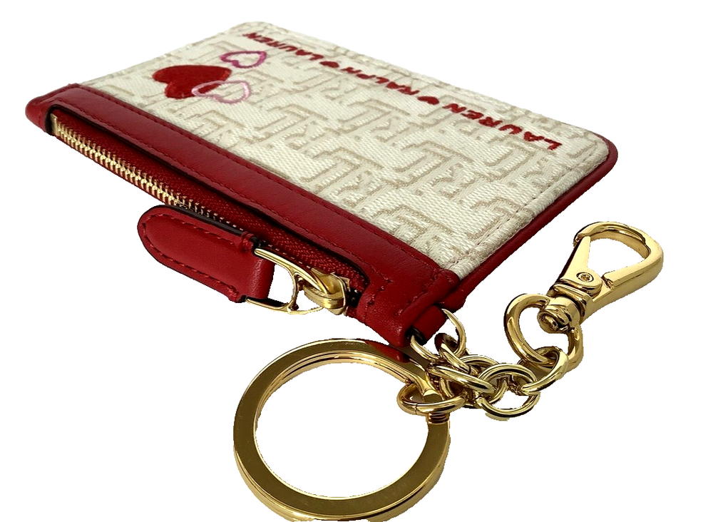 Distinguished by the season’s monogram motif, which is created using three different colored yarns, this sleek card case features signature “LRL” hardware and an attached key ring that easily secures to your bag with a dog clip. Supple full-grain leather trim, which is distinguished by its naturally smooth finish, enhances its sophisticated appeal. Zip closure. Four credit card slots and one slip pocket at the exterior. “LRL” metal hardware at the front. Attached key ring and dog clip. 3.25" H x 5" L. Lining is made with polyester and recycled polyester. Shell: cotton, polyester. Trim: leather. Lining: polyester. Wipe clean with a soft, dry cloth. Imported.