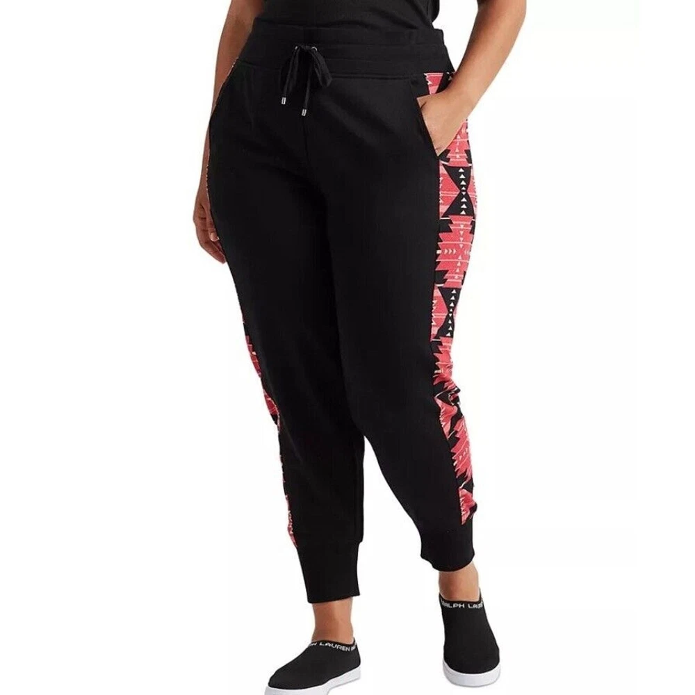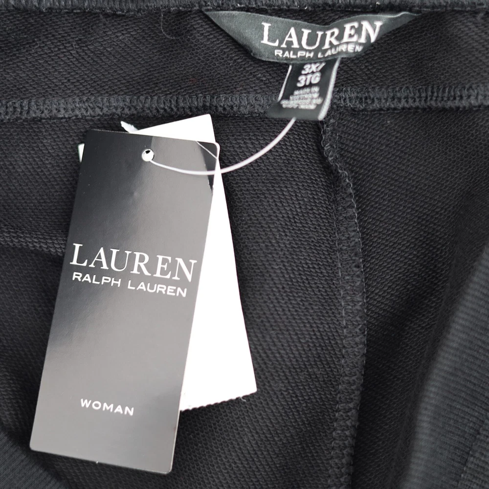 Lauren Ralph Lauren Women Black French Terry Sporty Jogger Pants Plus Size 3X New with tags MRSP $110 Ribbed elasticized waistband Drawcord with signature cord ends Two front angled pockets Embroidered "LRL" monogram at the back right waist Curved back yoke seam Printed side panels Ribbed cuffs Skinny fit 83% cotton / 17% polyester Machine washable Inseam 29.5" Waist flat lay 22.5" Total length (side seam) 41"