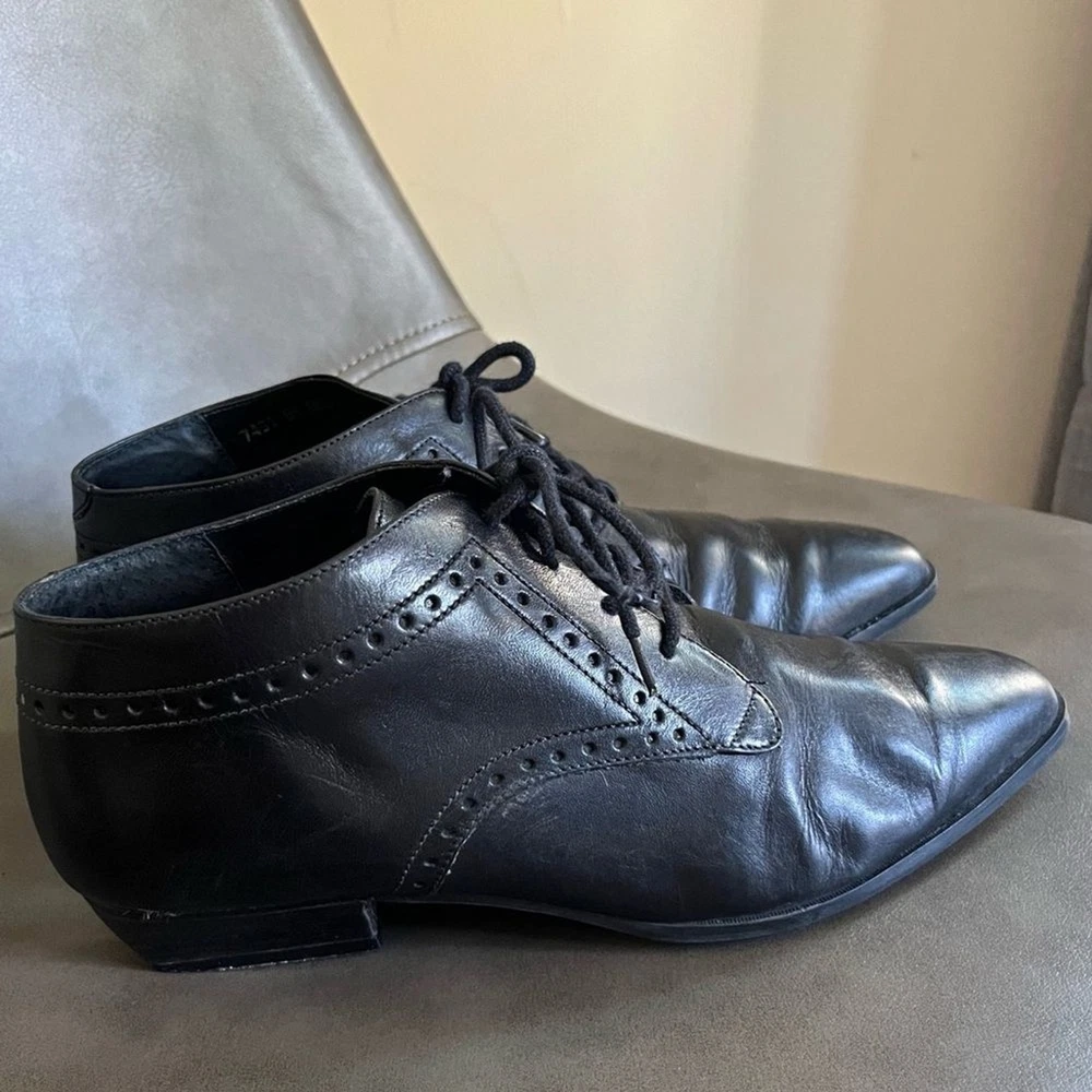 Sz 7 Lauren sport 80’s vintage bootie Lace up Oxford style Very tiny heel in back Pointed toe Genuine leather upper Black color Some wear on the bottoms, a couple of marks/scratches on exterior. The insole is coming up a bit at the toe area down inside. Some creasing Super cute!! Fun & unique I would definitely recommend these for someone with a more narrow foot. (Double check measurement of bottom sole for best fit)