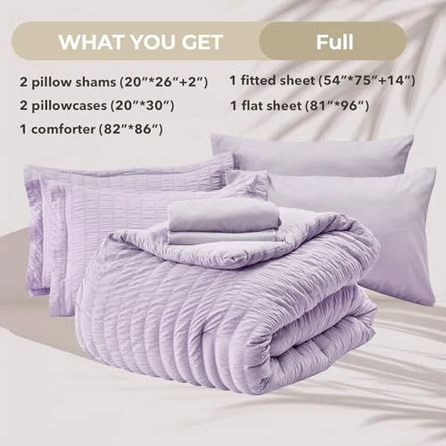 Type: Does Not Apply Theme: Romance Item Width: 11.97 gtin13: Does Not Apply Number of Pieces: 5 Size: Full(82"x86") Included Components: Seersucker Shams & Standard Pillowcases, Comforter, Fitted Sheet, Fabric Type: Cover: 100% Microfiber Filling: 100% Hopoallergenic Microfiber UPC: Does Not Apply EAN: Does Not Apply Brand: Does Not Apply Item Weight: 8.4 pounds MPN: Does Not Apply Color: Lavender Product Care Instructions: Machine Wash Item Length: 16.34 Material: Microfiber, Hopoallergenic Microfiber Date First Available: April 16, 2024 Item Height: 5.31 Seasons: All Pattern: Seersucker Package Dimensions: 16.34 x 11.97 x 5.31 inches Manufacturer: Does Not Apply Style: Seersucker