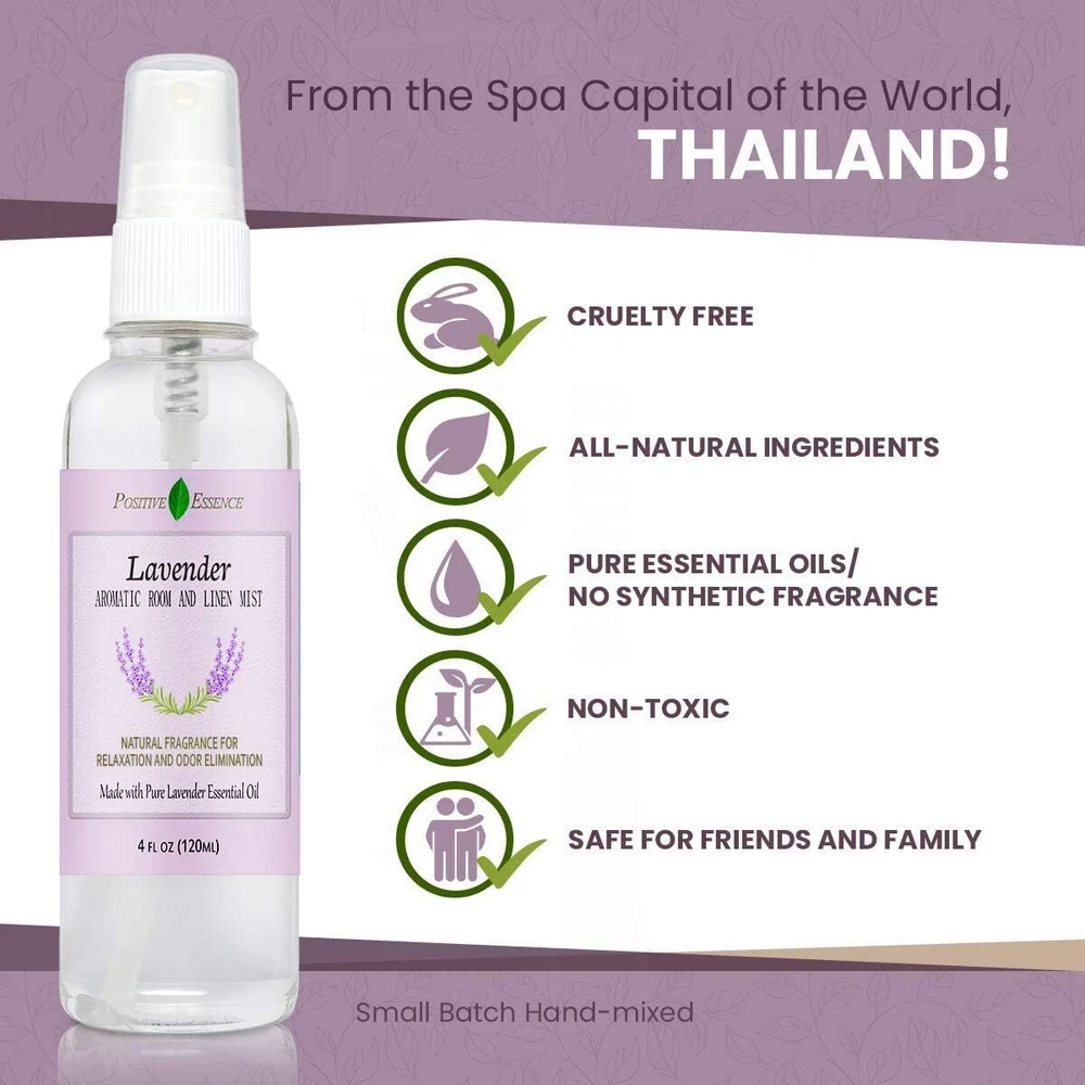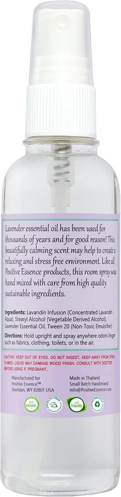 Lavender Linen and Room Spray, Pure Lavender Essential Oil Pillow Spray 4.06 Fl Oz Lavender Linen Spray and Home Fragrance 100% Natural blend made with pure lavender essential oil A soft, calming, and emotionally balancing aroma for relaxation at night or throughout the day. It's no wonder Lavender Oil is one of the most widely used essential oils! Our concentrated room spray combines pure premium grade lavender essential oil (Lavandula Angustifolia) with our in-house lavandin infused water. The result is a wonderfully soothing scent. Scent Profile Herbal, Fresh, Spicy Camphoreous, Balsamic, Hay Pillows and Bed Linens Mist on pillows or bed sheets before bed to help you drift off and wake up feeling refreshed! Furniture and Home Natural air freshener for the home or soft furnishings like sofas, curtains, rugs, and towels to freshen between washes . Clothing and Closets Freshen up clothing or closets with just a couple sprays Bathrooms and Toilets Bathroom freshener, toilet spray, or poop spray. It really works! Premium Sustainable Ingredients We don’t just value our bodies but our communities and planet too. That’s why we are continuously seeking new ways to reduce our carbon footprint. Positive Essence Room Sprays are handcrafted using premium sustainable ingredients . Rest easy knowing that when you choose Positive Essence, you are supporting a healthier planet. All Natural It's what's inside our Aromatherapy Spray that makes the difference Paraben Free Phthalates Free No artificial fragrance or perfumes No animal testing or animal cruelty No harsh chemicals Trusted Quality The remarkable uses of essential oils can only be maximized when using pure essential oils. Since quality regulations are virtually non-existent, knowing where your oils come from and how they are created is crucial to ensuring effectiveness. 1.48 inches x 1.48 inches x 6.3 inches. Weight: 4.94 oz Item model number SYNCHKG090771 Power Source Oil Color Lavender Scent Lavender Product Dimensions 1.48 x 1.48 x 6.3 inches; 4.94 ounces Country of Origin Thailand Is Discontinued By Manufacturer No Item Form Spray Size 4.06 Fl Oz (Pack of 1)