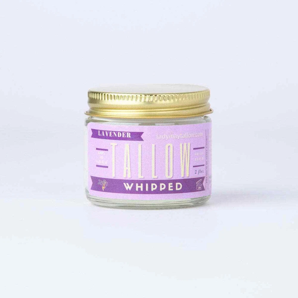 Experience the ultimate in natural skincare with Lady May Lavender Whipped Tallow , a luxurious, all-natural moisturizer made from beef tallow . Light, fluffy, and nutrient-rich, this whipped tallow deeply hydrates, soothes irritation, and promotes healthy, radiant skin. Infused with calming lavender essential oil , it provides a relaxing, therapeutic skincare experience. Pure & Natural Benefits Deep Hydration - Locks in moisture to heal and restore dry, cracked skin. Nutrient-Rich Formula - Packed with Vitamins A, D, E, and K plus essential fatty acids to nourish and protect. Soothes Skin Conditions - Helps with eczema, dry patches, diaper rash, and sunburn . Anti-Aging Properties - Rich in antioxidants that combat fine lines, wrinkles, and UV damage . Gentle & Preservative-Free - Ideal for sensitive skin , including babies and those with allergies. Multipurpose Use - Works as a skin treatment, hair mask, cuticle balm, and natural healing balm . Product Specifications Whipped for a light, airy texture 100% natural, preservative-free, and non-toxic Non-greasy, fast-absorbing formula Safe for all ages, including babies Handcrafted in small batches for superior quality Perfect For: Daily face and body moisturizer Healing dry, cracked skin and rough patches Soothing irritated, inflamed, or sensitive skin Restoring skin elasticity and softness Relaxing aromatherapy skincare with calming lavender Natural alternative to chemical-based lotions Sustainable Features Ethically sourced, beef tallow Zero synthetic additives or artificial preservatives Eco-friendly packaging Handmade in the USA Transform your skincare routine with Lady May Lavender Whipped Tallow , the ultimate all-natural moisturizer for soft, healthy, and nourished skin. FREE SHIPPING WHEN YOU SPEND OVER $75.00