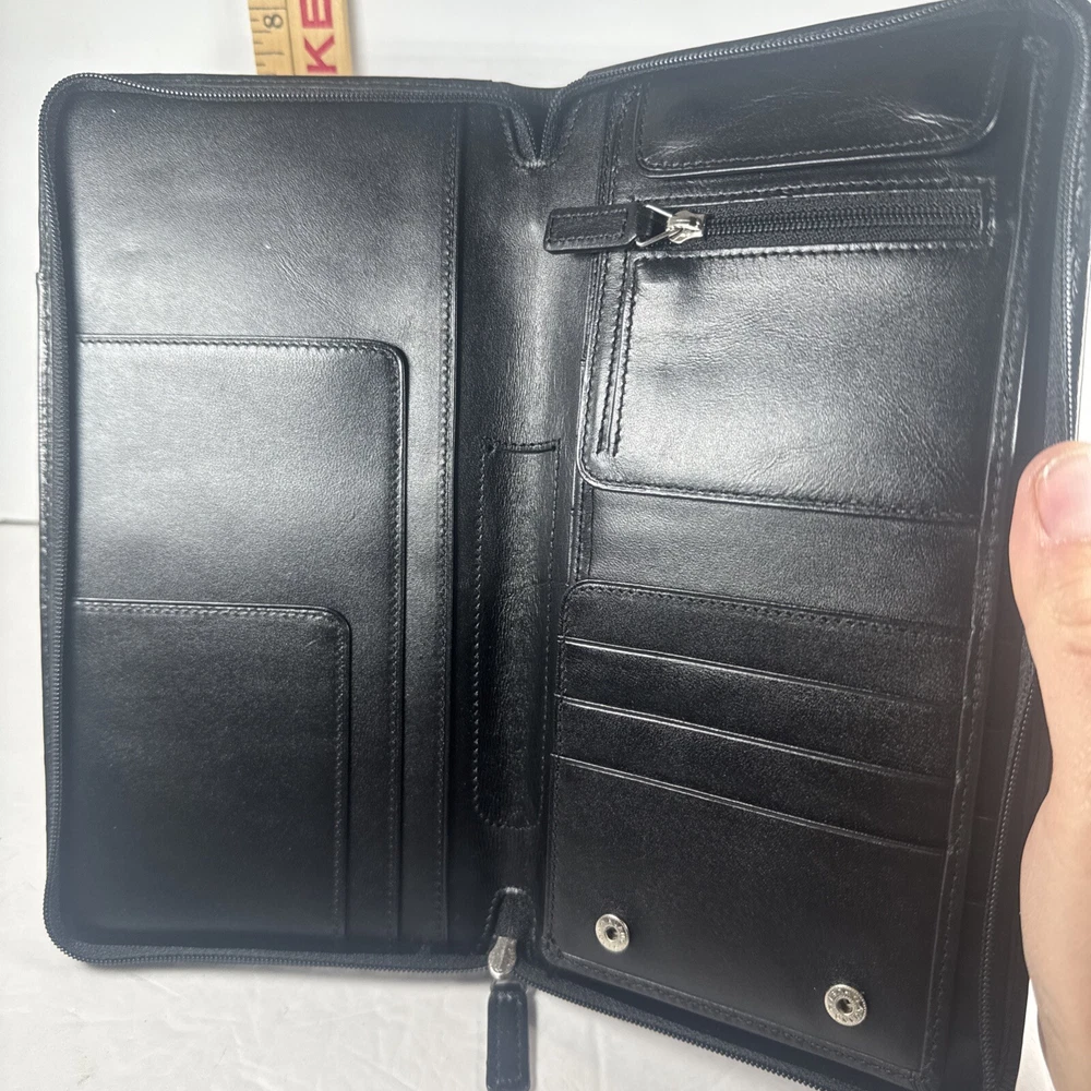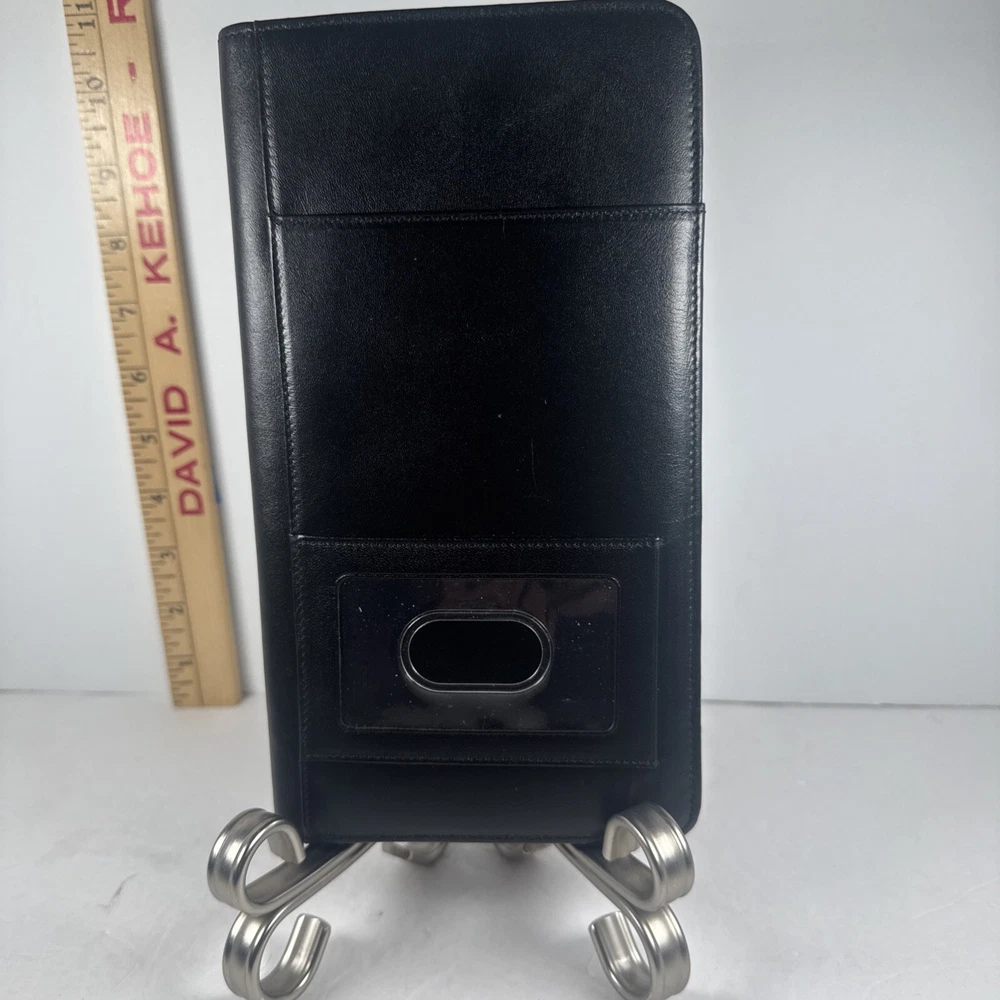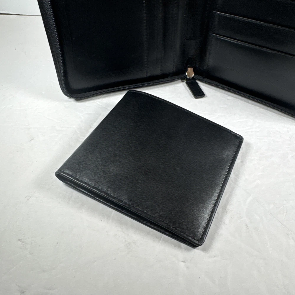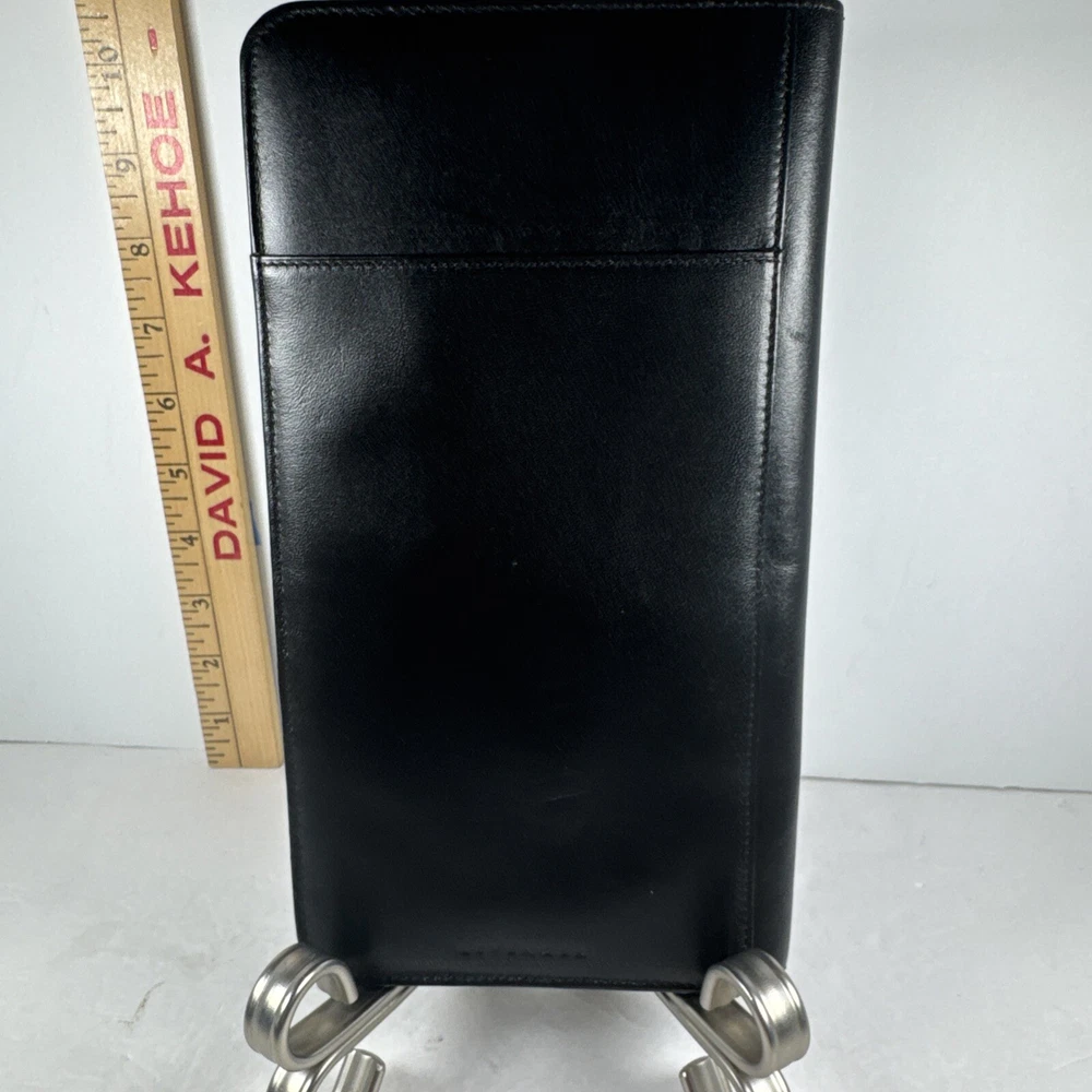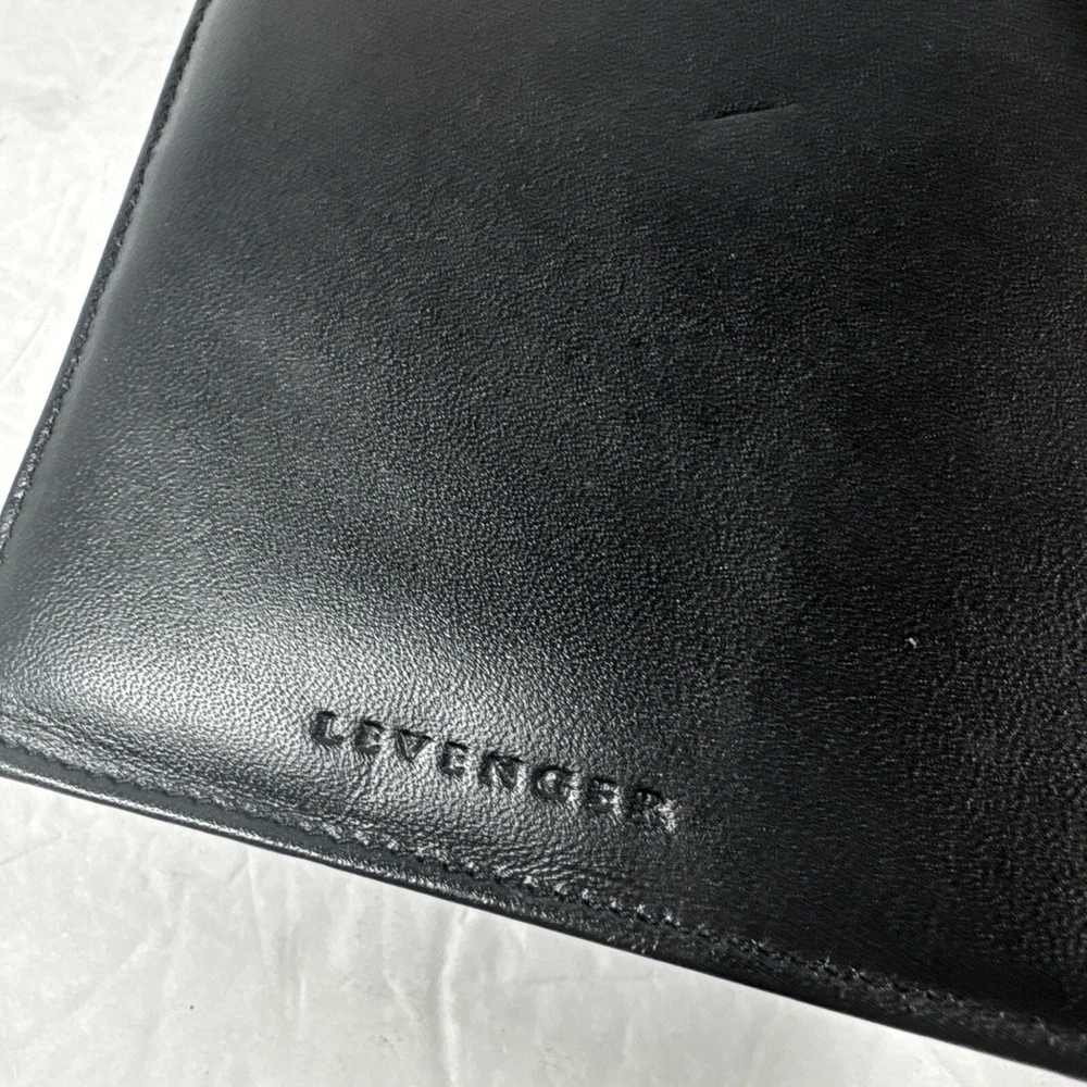 The Levenger First Class Wallet/Organizer is a stunning black leather travel accessory with a solid pattern. It features a detachable pocket wallet, perfect for keeping your essentials organized while on the go. The wallet is designed with a folding style, credit card slots, and a size of 9 inches in length and 5 inches in width, making it an ideal choice for both men and women who appreciate luxury and functionality in their travel accessories.