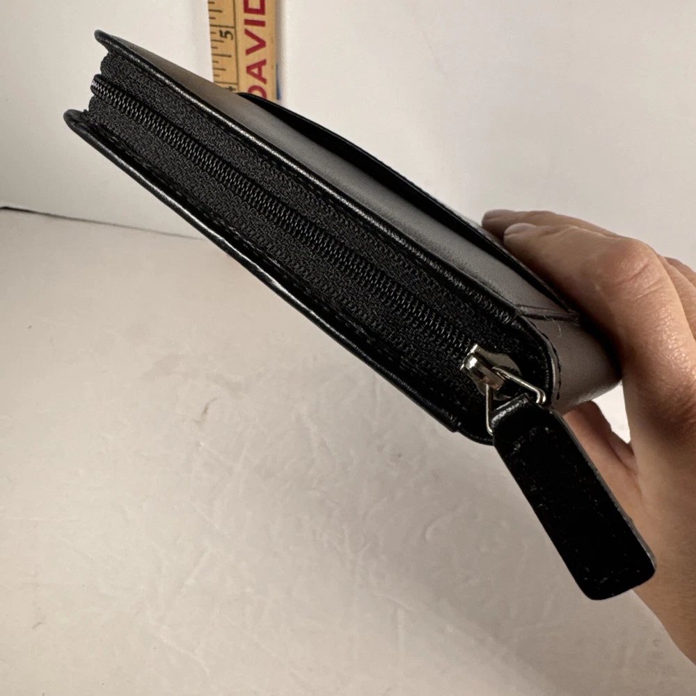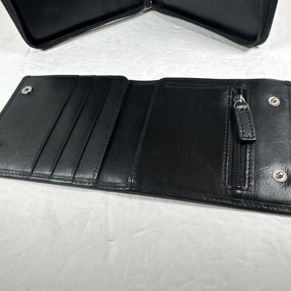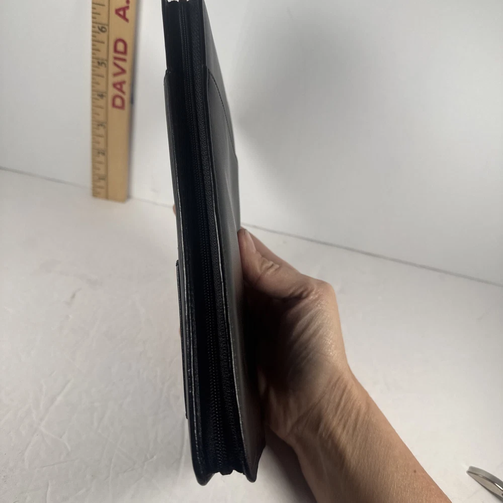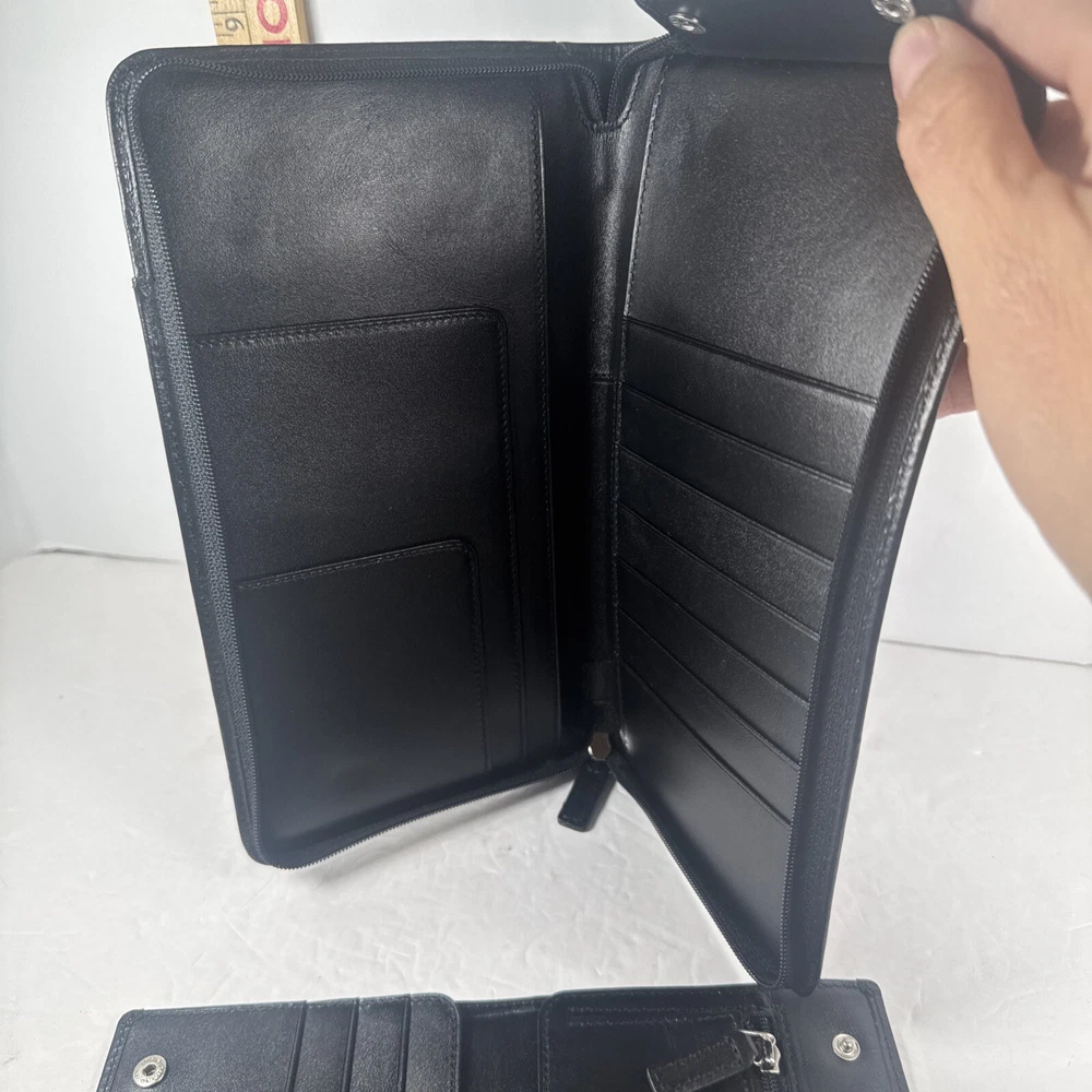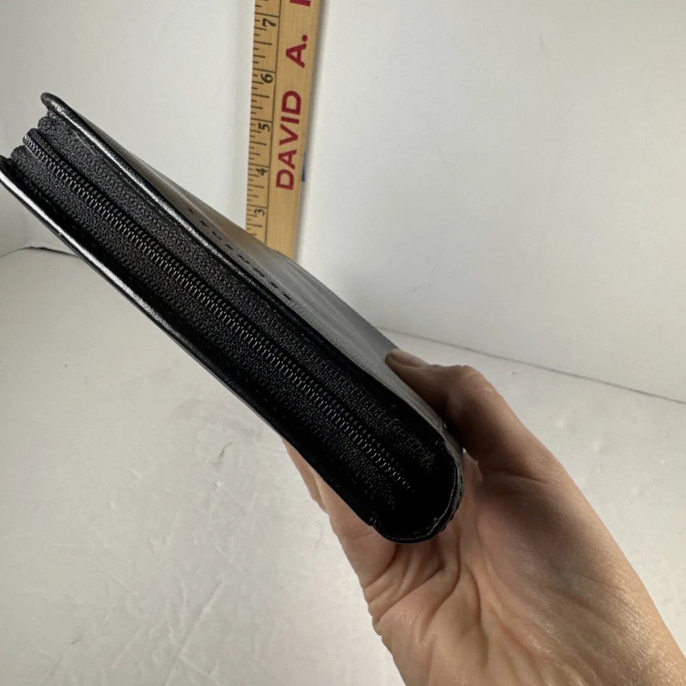 The Levenger First Class Wallet/Organizer is a stunning black leather travel accessory with a solid pattern. It features a detachable pocket wallet, perfect for keeping your essentials organized while on the go. The wallet is designed with a folding style, credit card slots, and a size of 9 inches in length and 5 inches in width, making it an ideal choice for both men and women who appreciate luxury and functionality in their travel accessories.